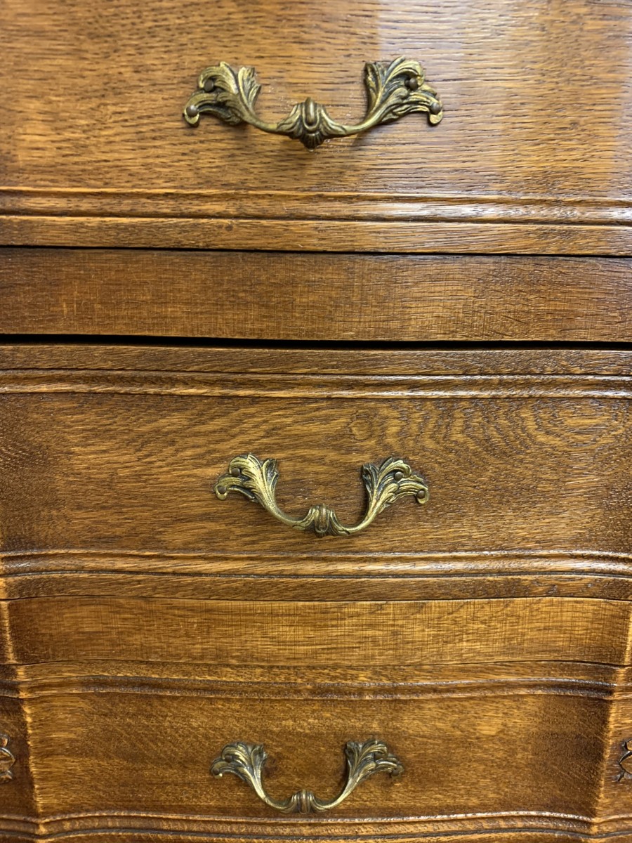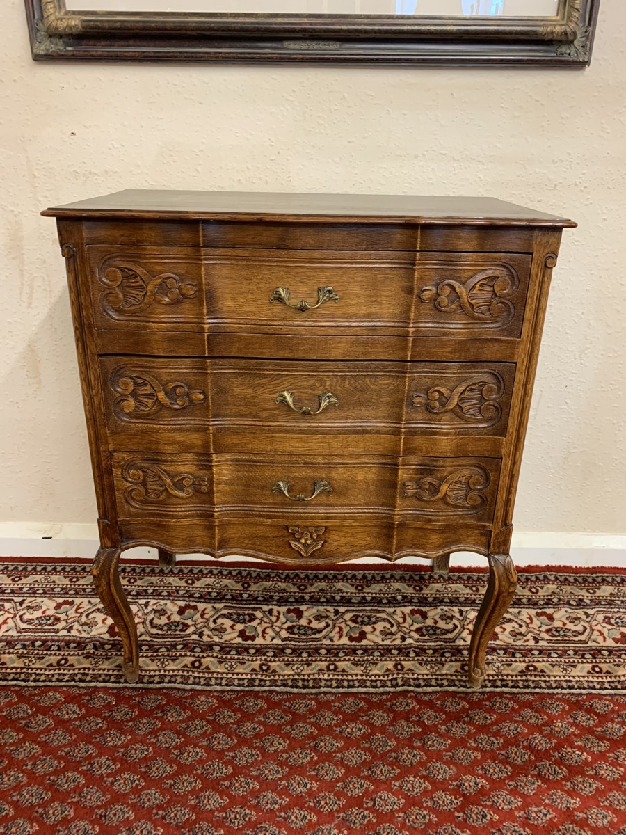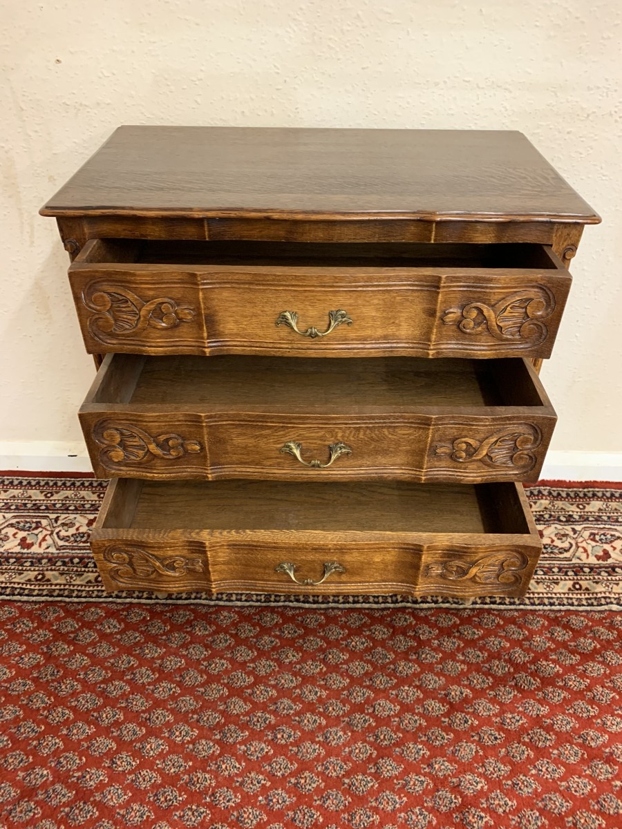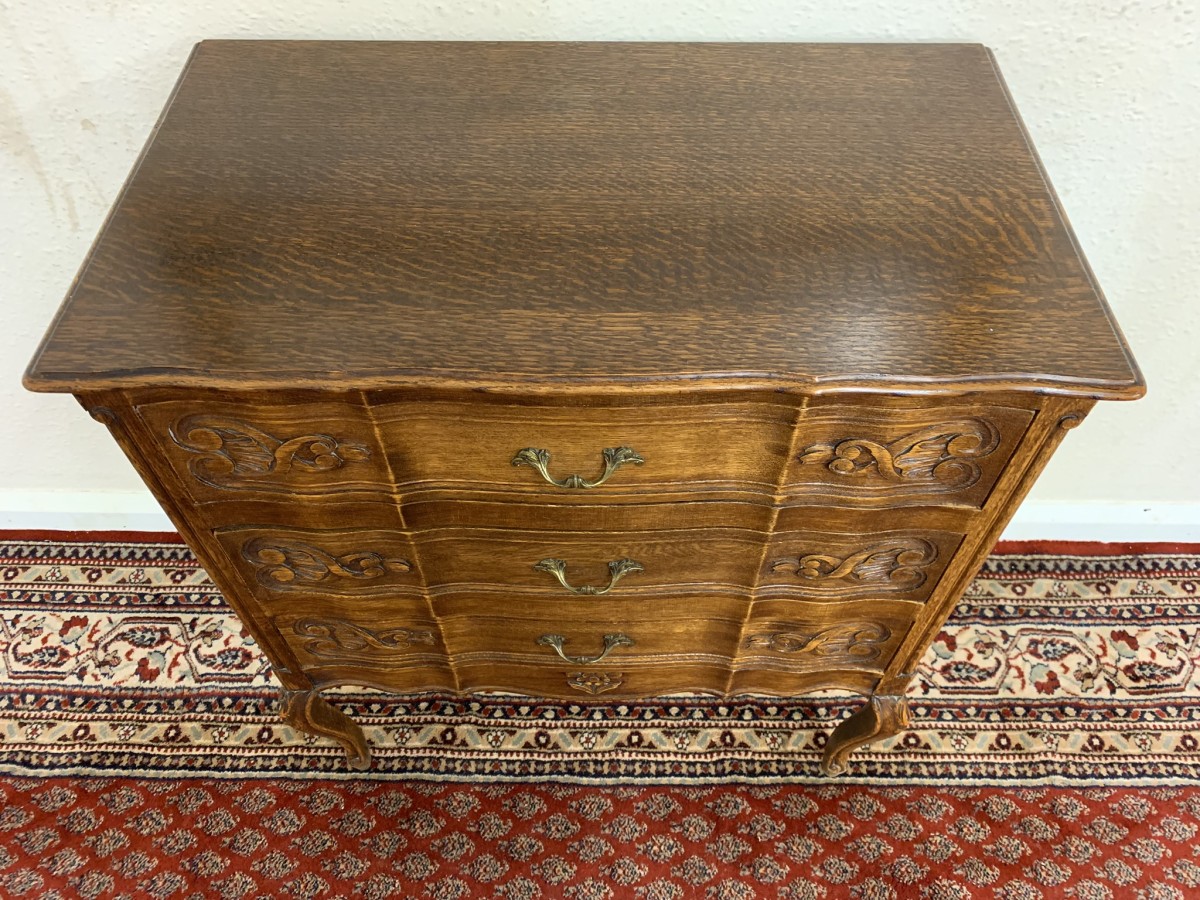 - Elegant French Shaped Carved Oak Chest Od Three Drawers