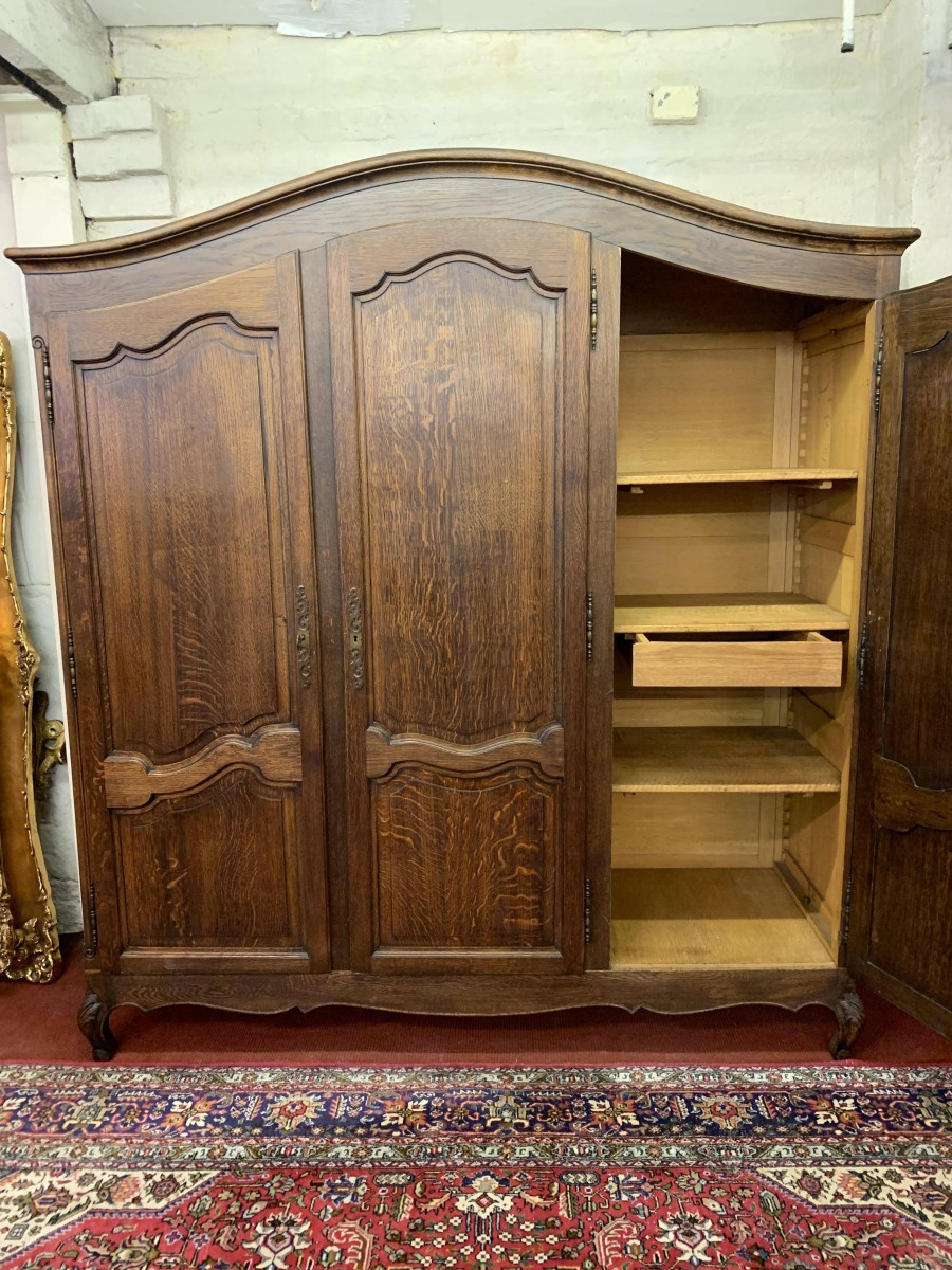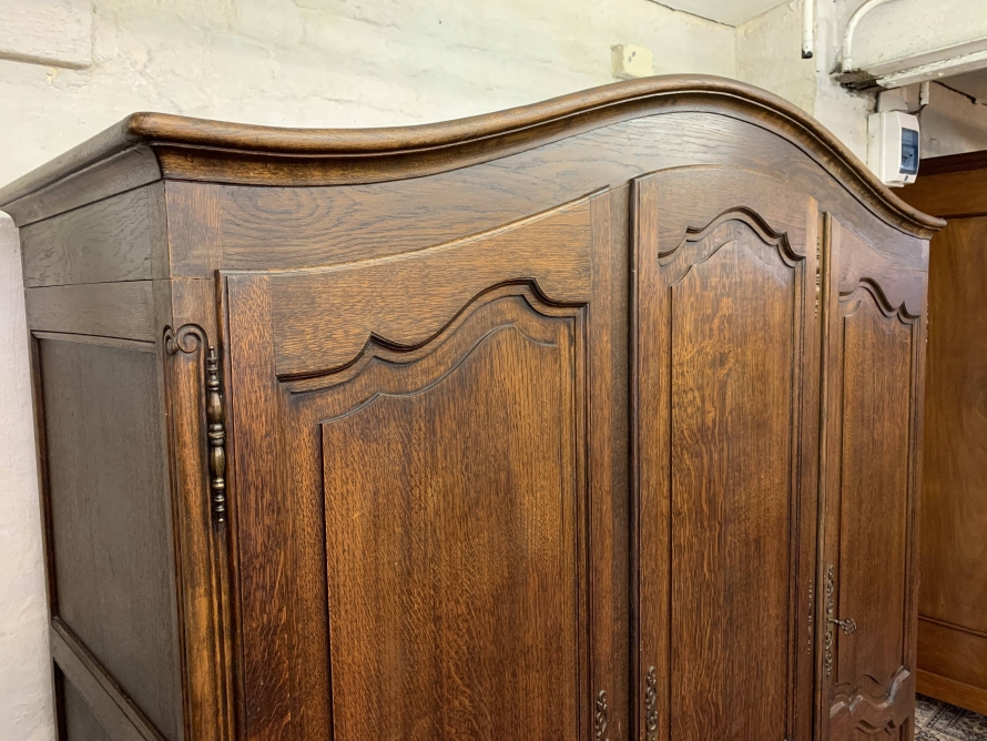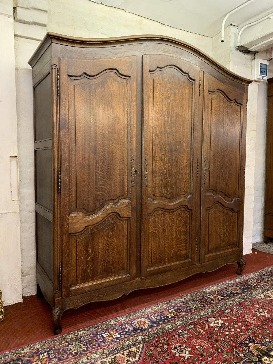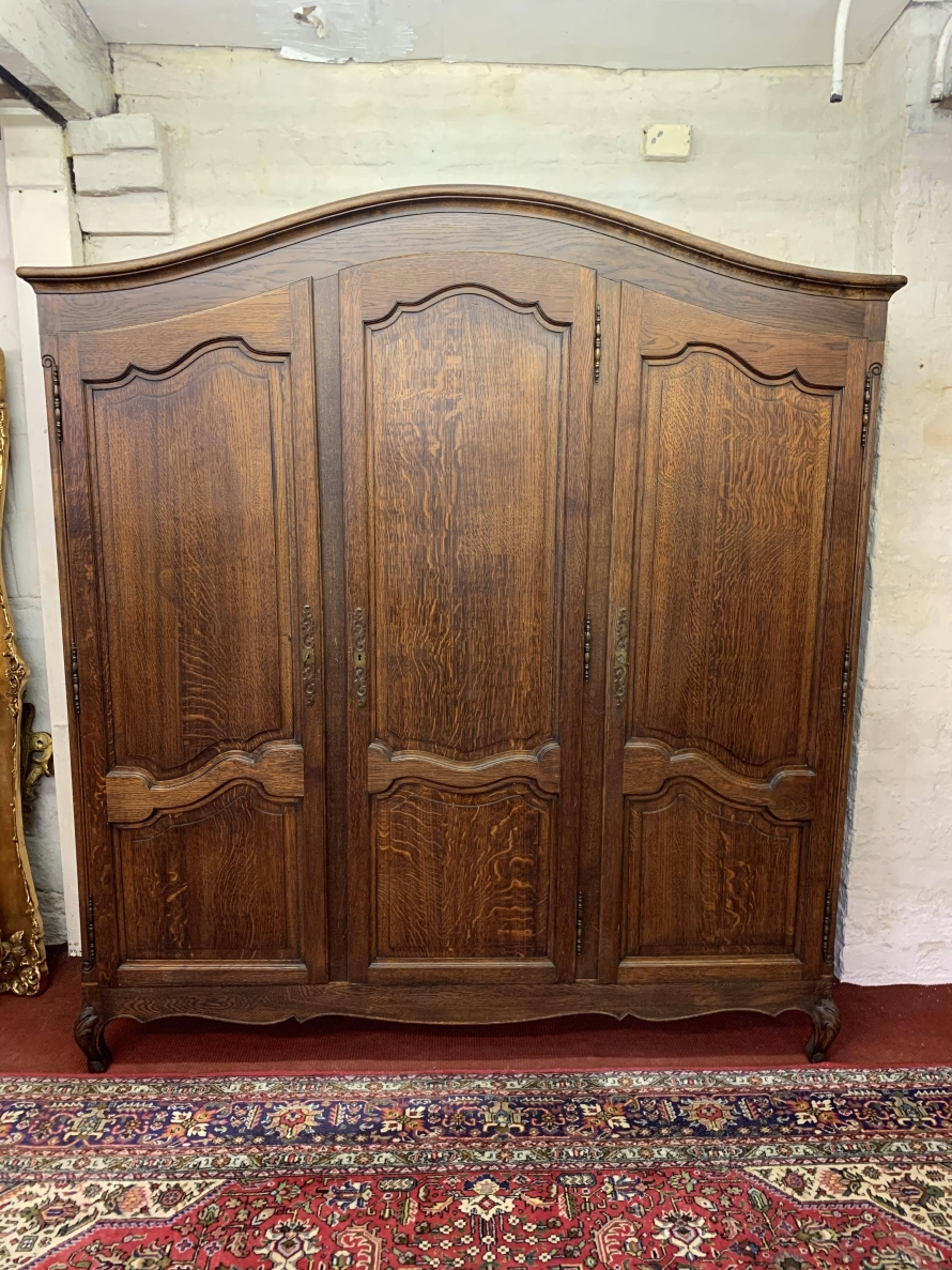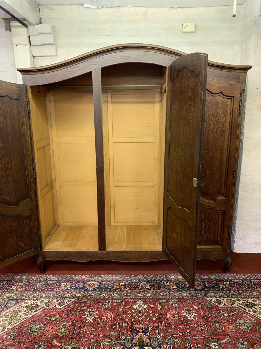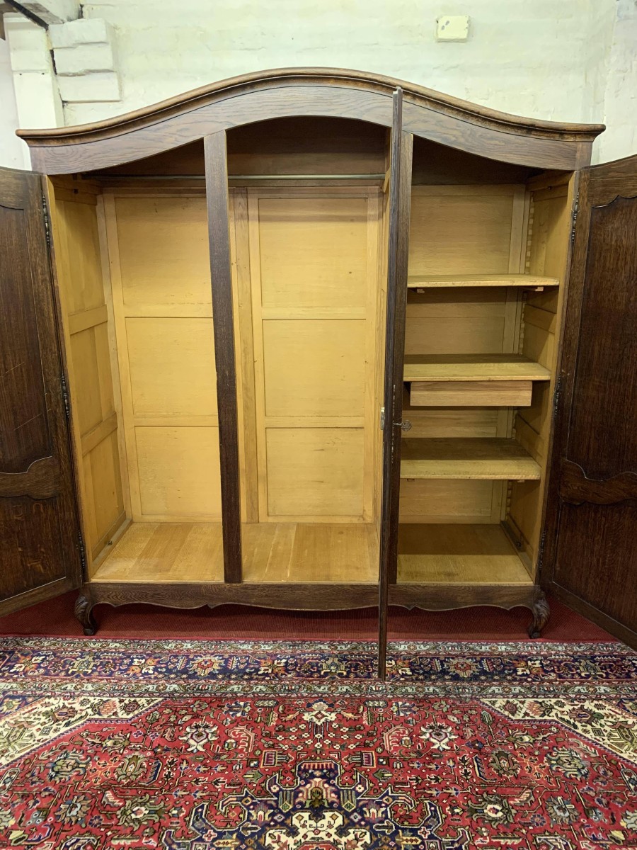 The shaped top sits above three shaped recessed panelled doors. The left-hand door and central door open to reveal a brass hanging rail. The right hand door opens to reveal three removable/adjustable shelves the middle one having a drawer below. Each door is lockable having brass hinges, decorative escutcheon and there are two keys. Recessed panelled sides, shaped skirt, this beautiful armoire sits on two shaped cabriole legs to the front. Please note that this armoire splits down for easy transportation and delivery into any home.