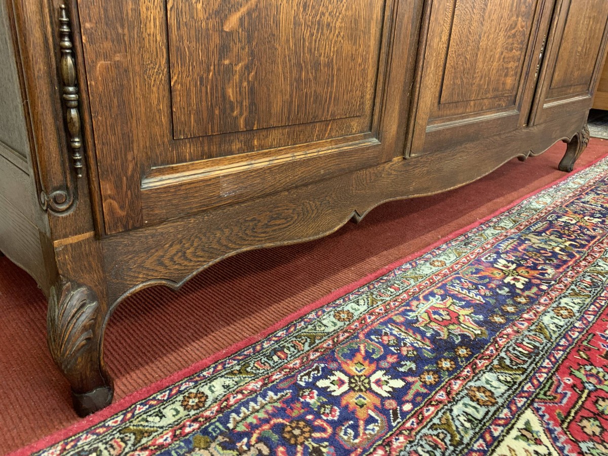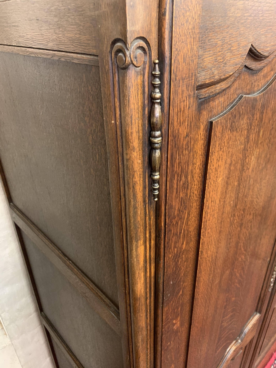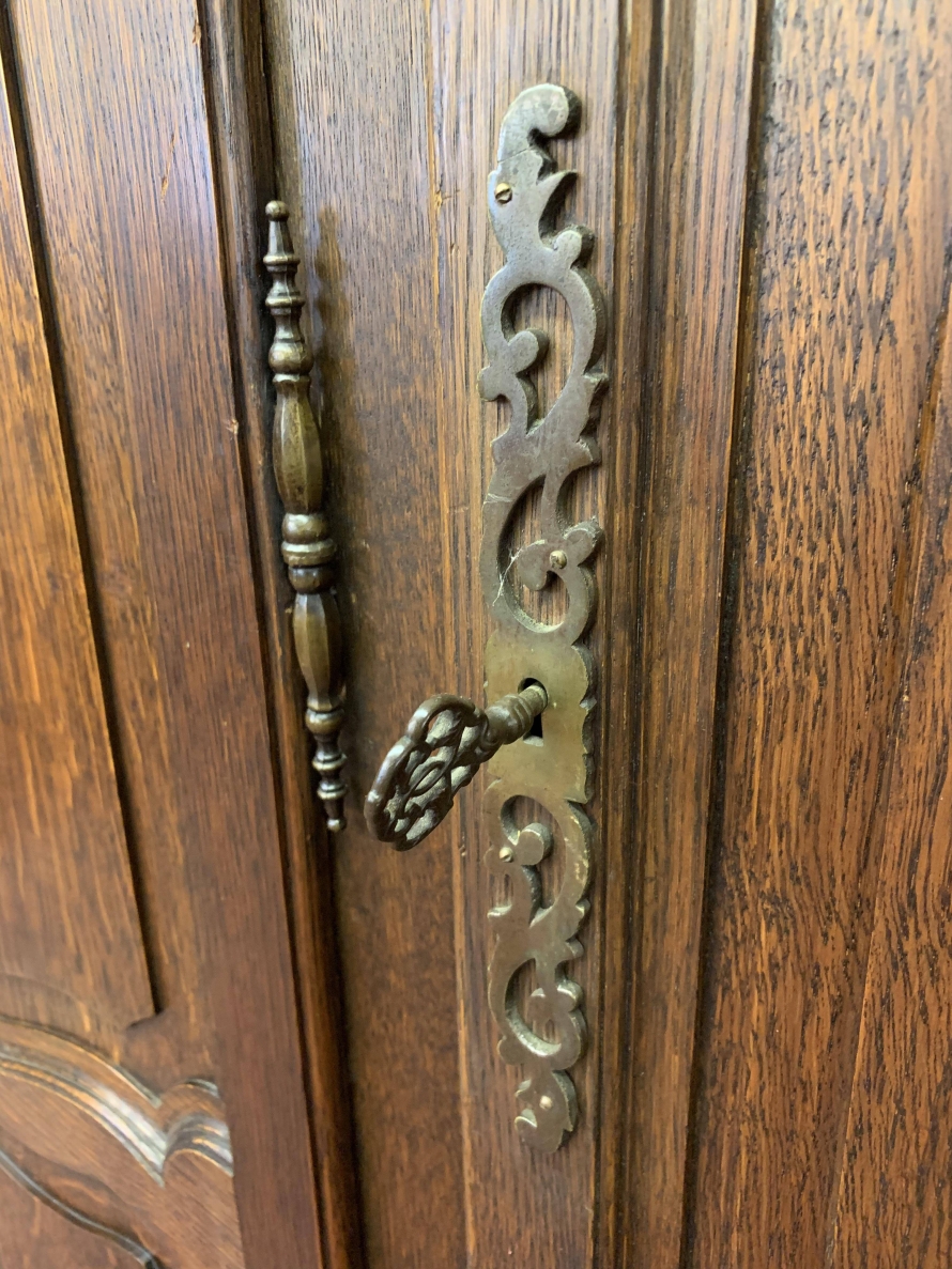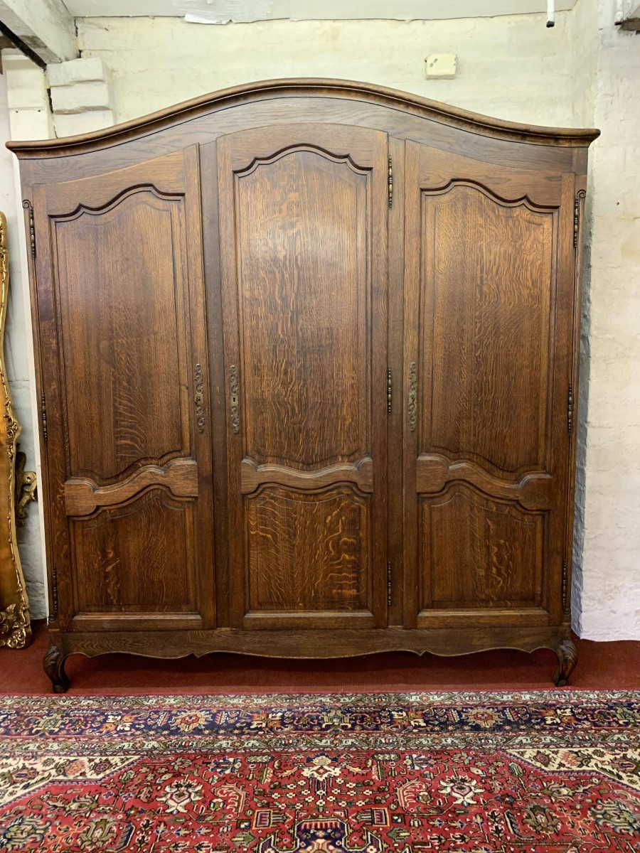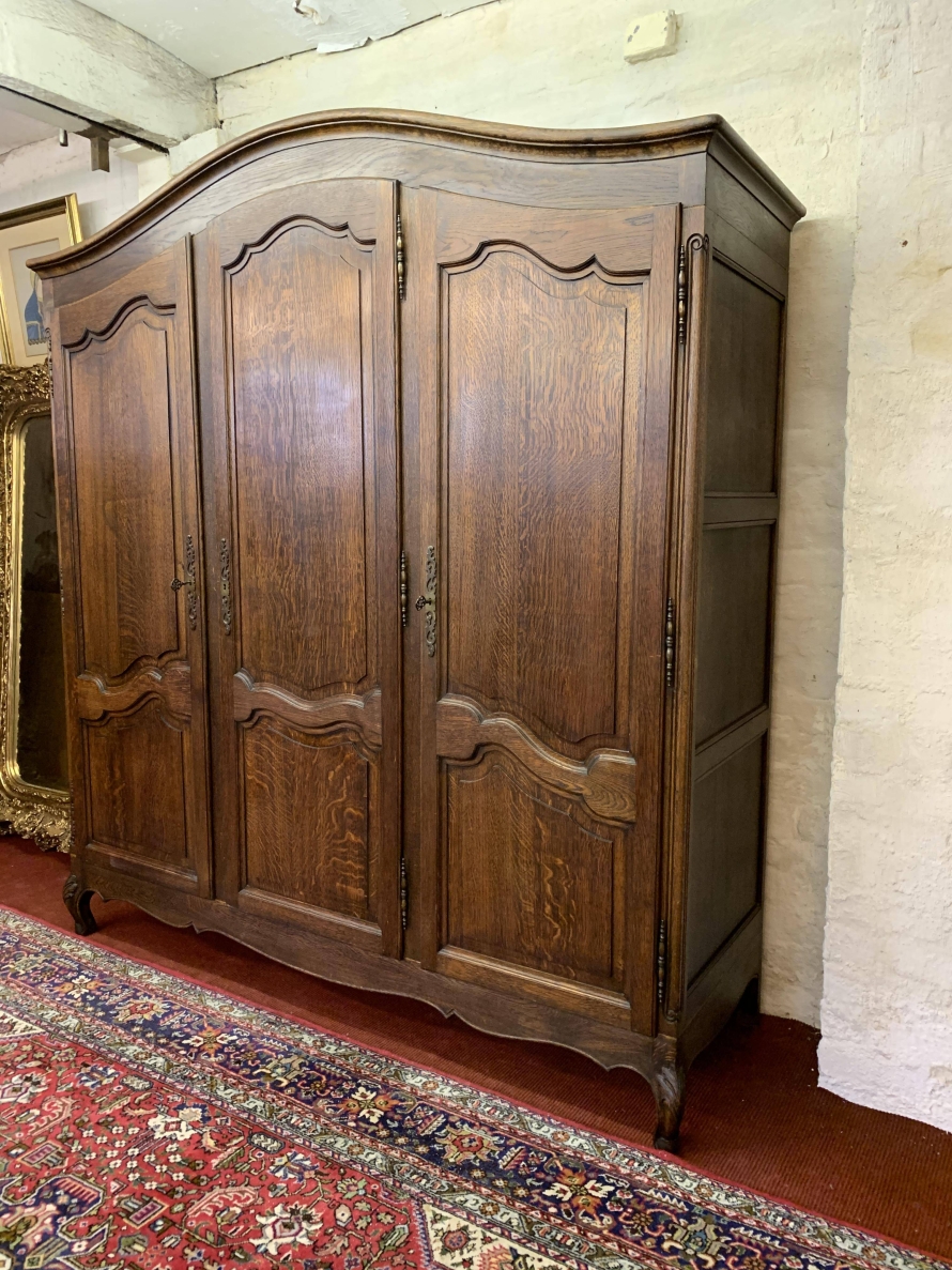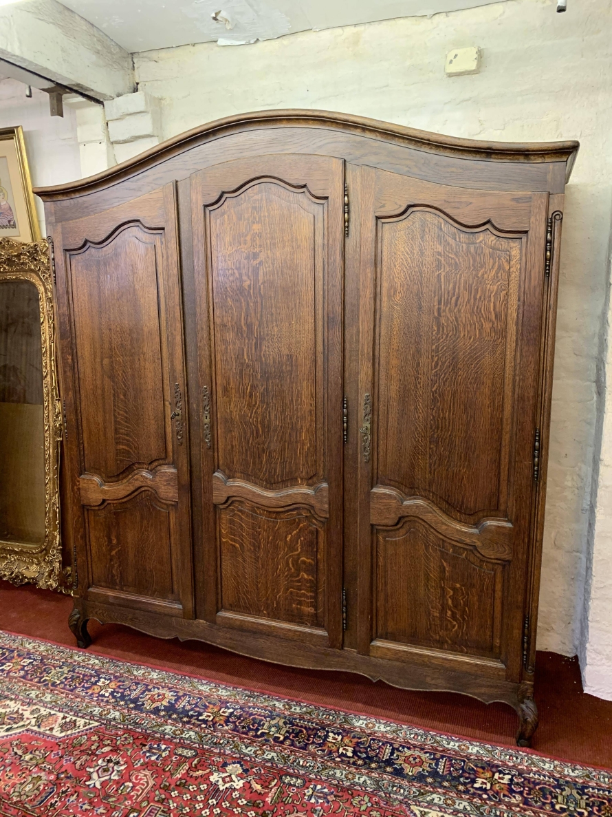 The shaped top sits above three shaped recessed panelled doors. The left-hand door and central door open to reveal a brass hanging rail. The right hand door opens to reveal three removable/adjustable shelves the middle one having a drawer below. Each door is lockable having brass hinges, decorative escutcheon and there are two keys. Recessed panelled sides, shaped skirt, this beautiful armoire sits on two shaped cabriole legs to the front. Please note that this armoire splits down for easy transportation and delivery into any home.