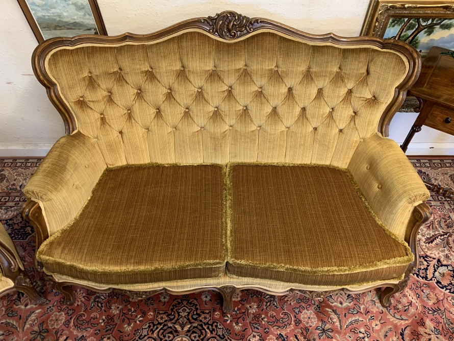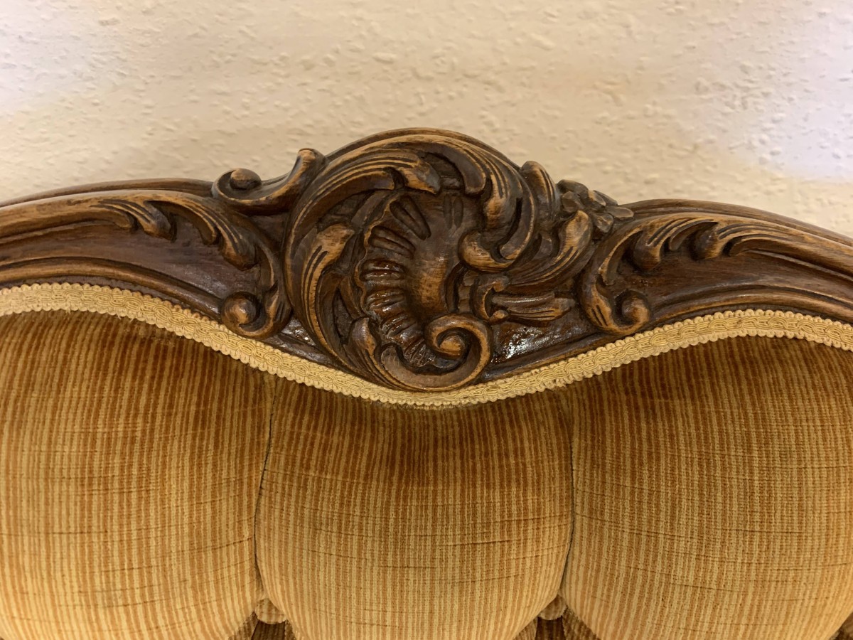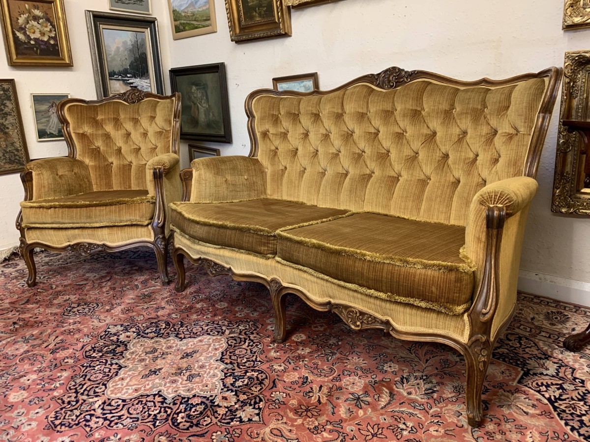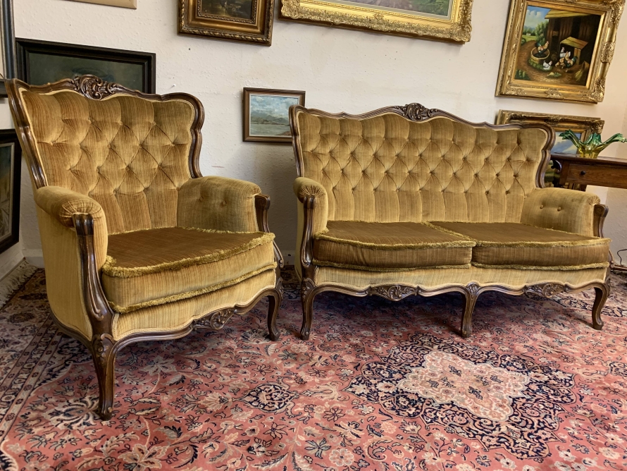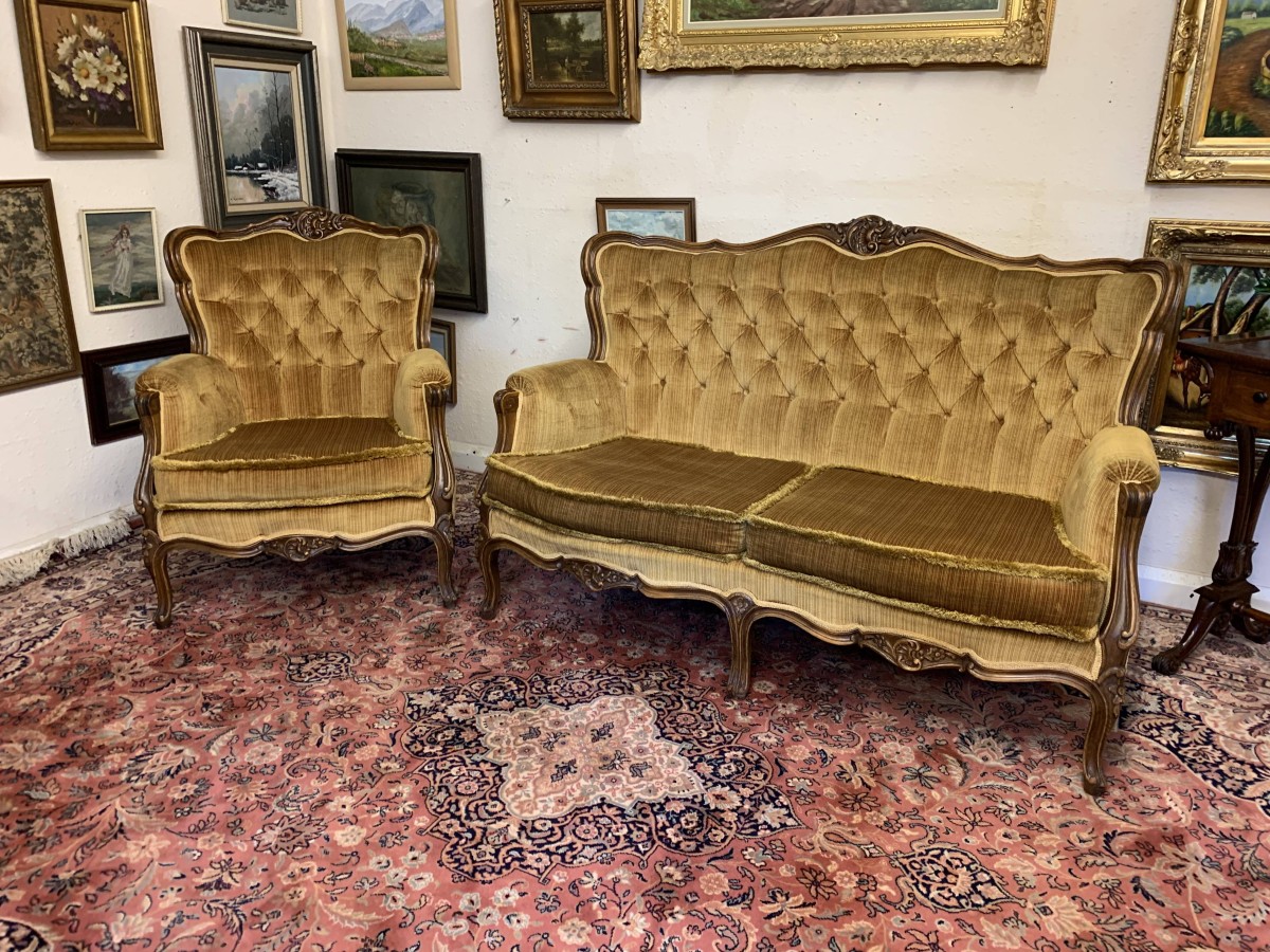 The sofa and chair each have a shaped oversailing top rising to an ornate central carving. Buttoned cushioned back rest, removable cushions and cushioned armrests. The sofa has a carved shaped skirt and stands on five carved cabriole legs. The armchair has a shaped skirt with central carving and stands on four carved cabriole shaped legs.