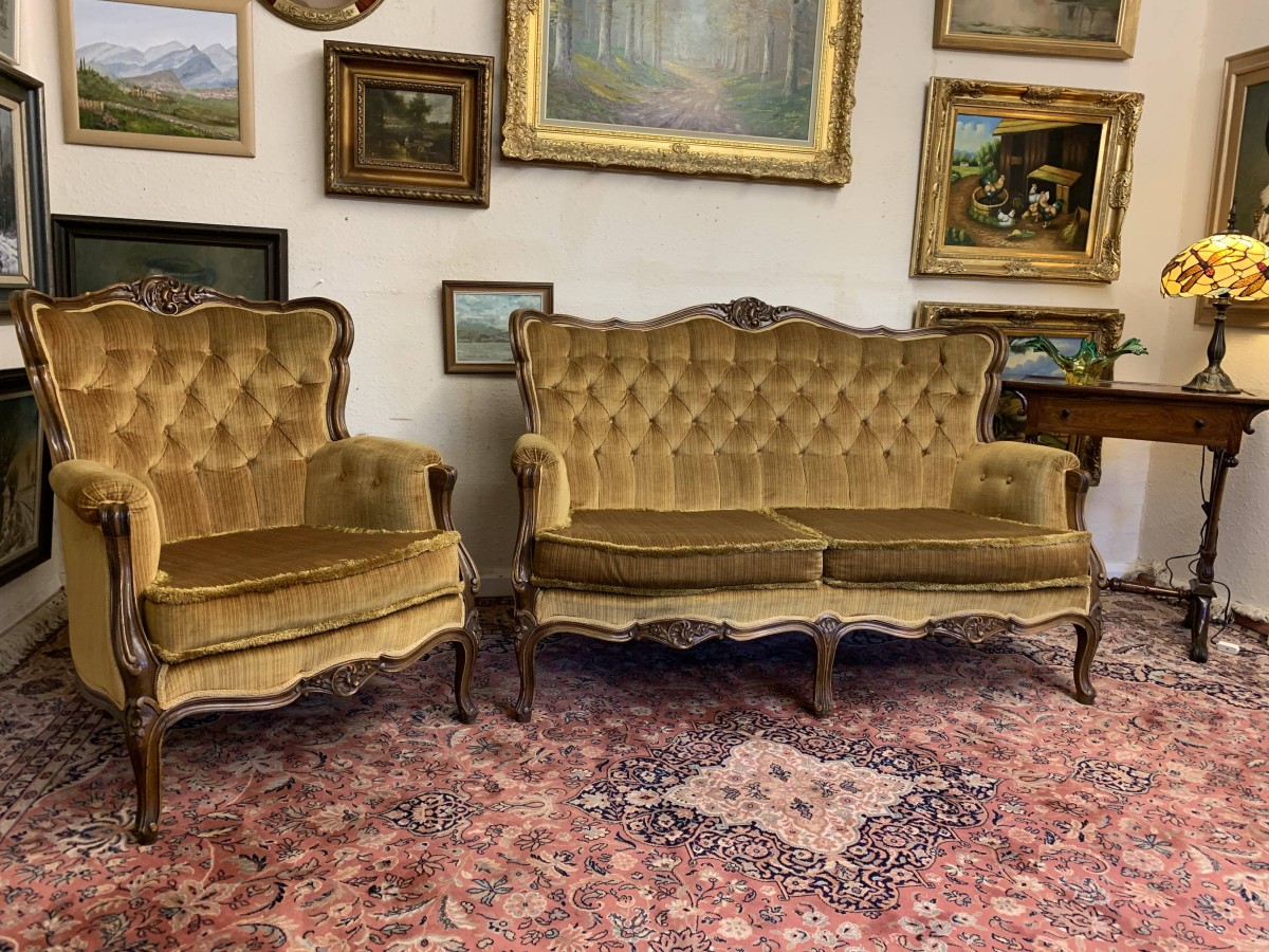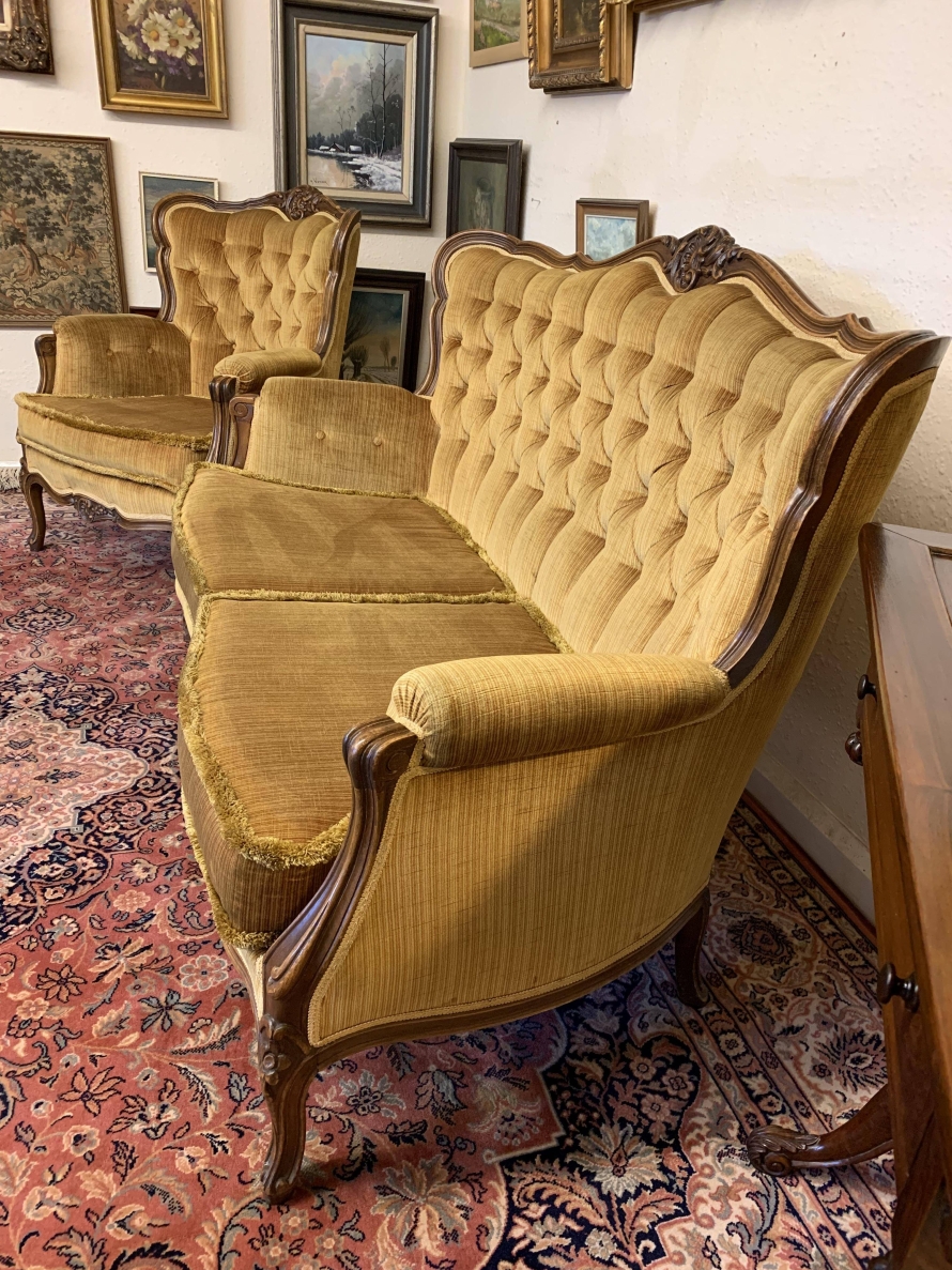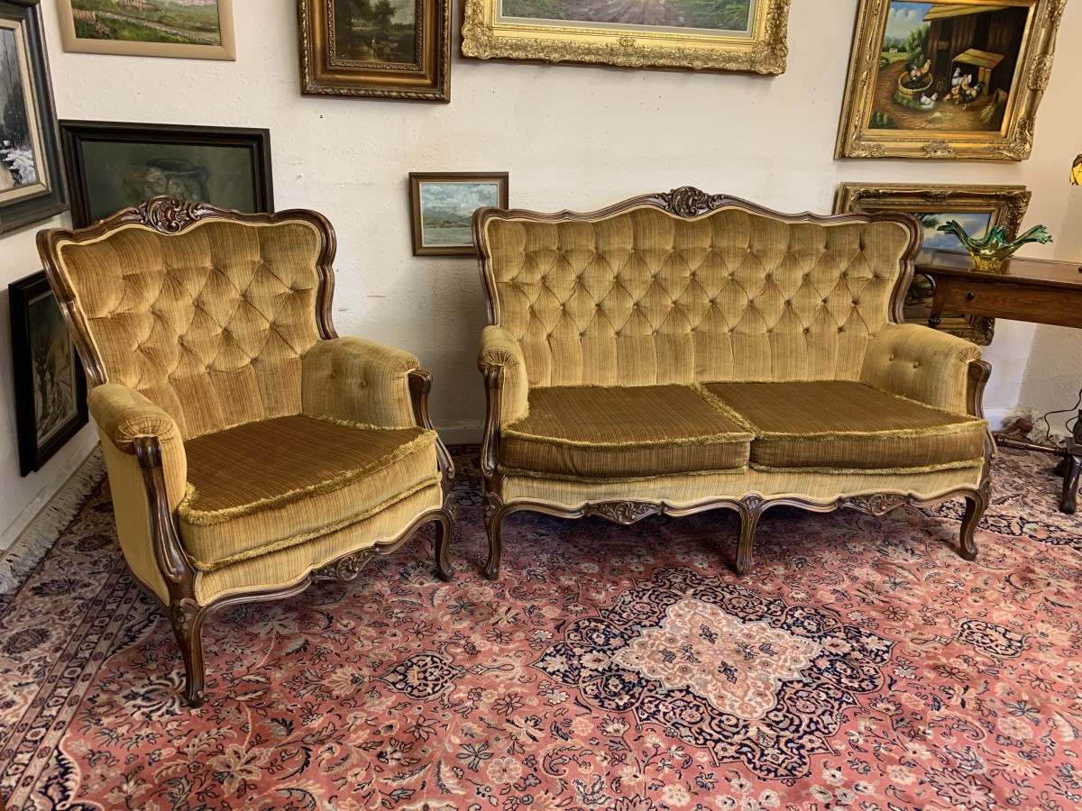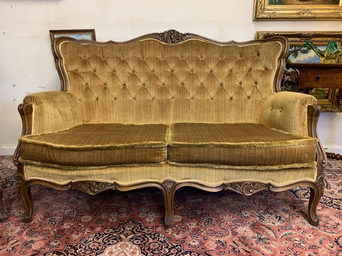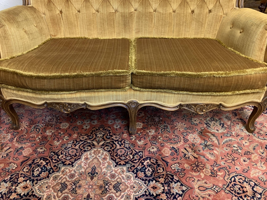 The sofa and chair each have a shaped oversailing top rising to an ornate central carving. Buttoned cushioned back rest, removable cushions and cushioned armrests. The sofa has a carved shaped skirt and stands on five carved cabriole legs. The armchair has a shaped skirt with central carving and stands on four carved cabriole shaped legs.