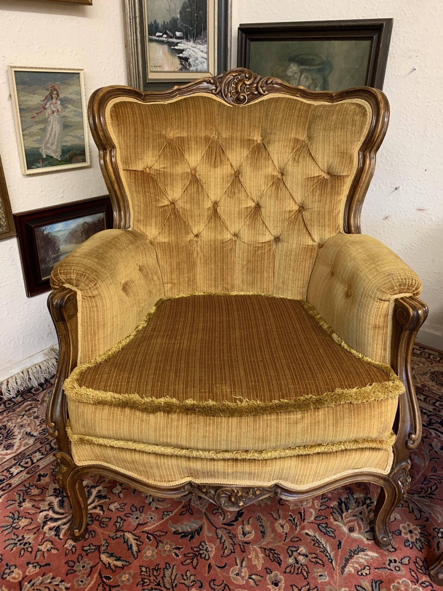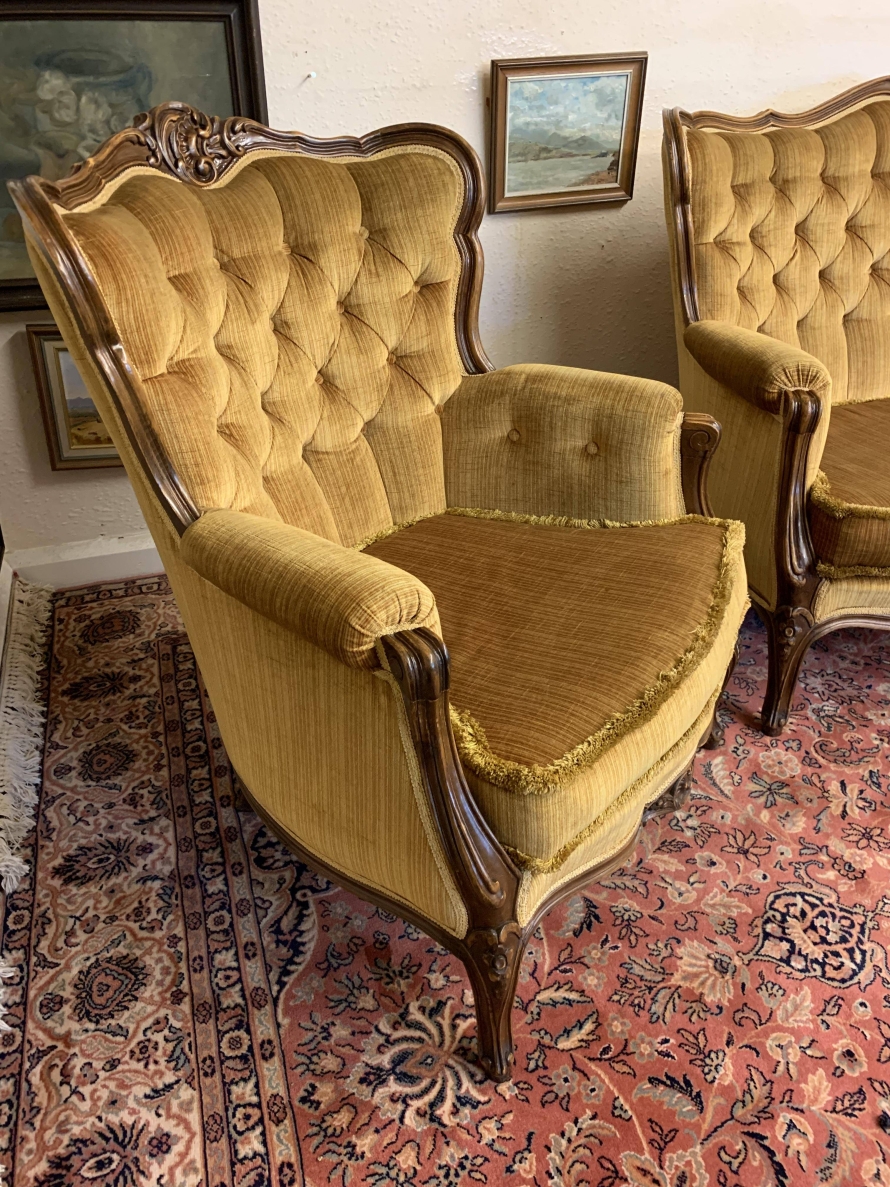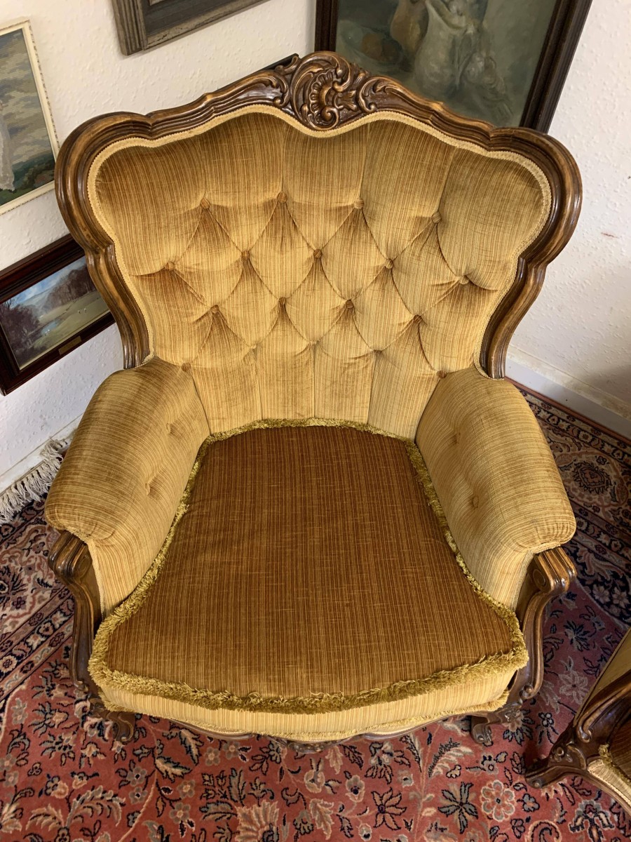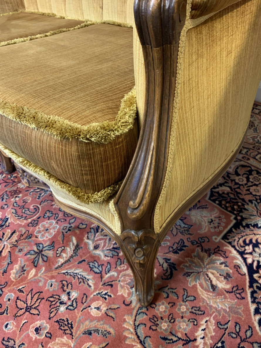 The sofa and chair each have a shaped oversailing top rising to an ornate central carving. Buttoned cushioned back rest, removable cushions and cushioned armrests. The sofa has a carved shaped skirt and stands on five carved cabriole legs. The armchair has a shaped skirt with central carving and stands on four carved cabriole shaped legs.