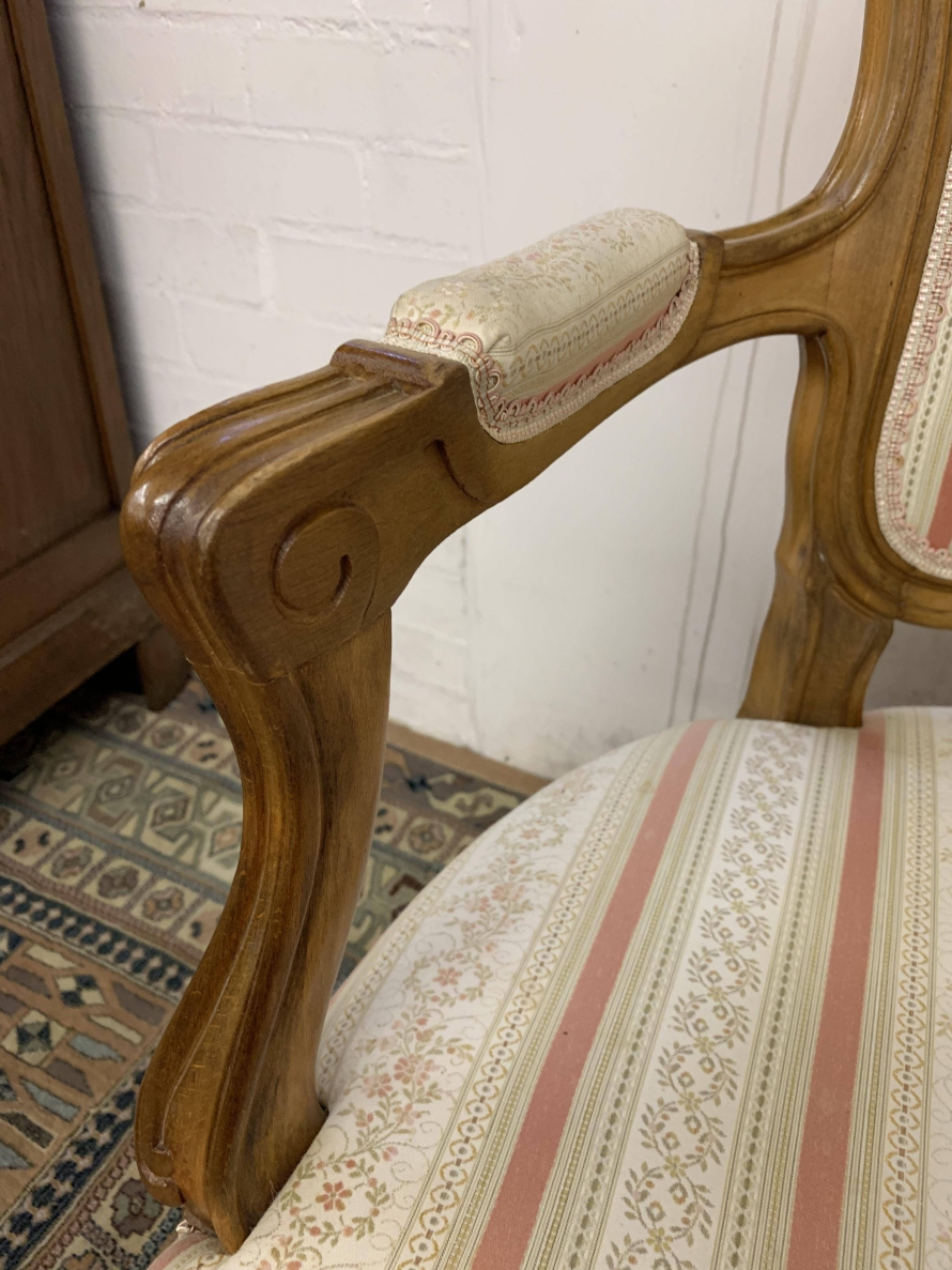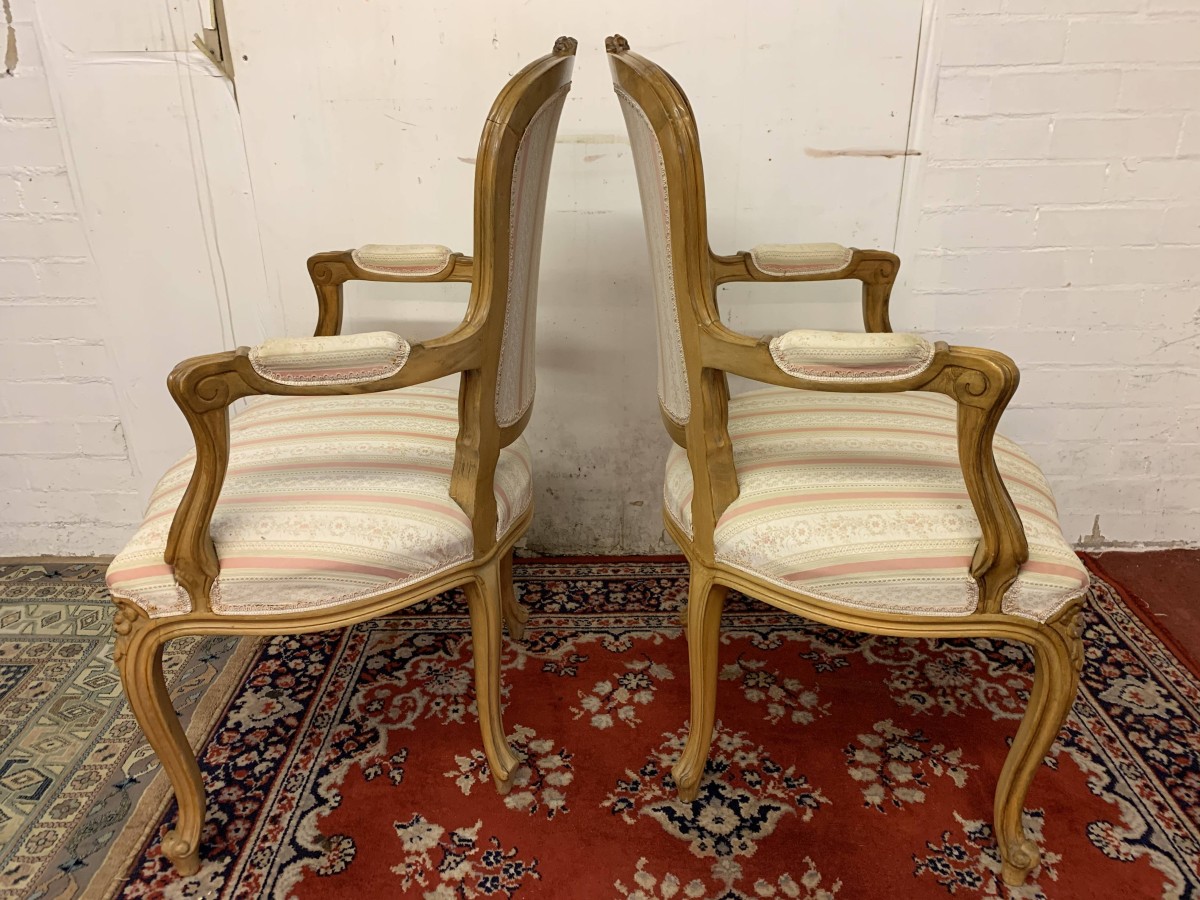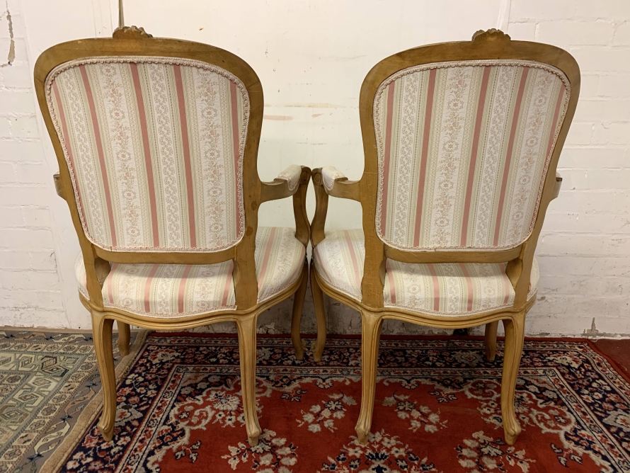 Each chair has a shaped back with central carved decoration, the back rest, cushioned seat and armrests are upholstered. Shaped side and front with central decoration ,this super pair of chairs stand on four carved cabriole shaped legs.
