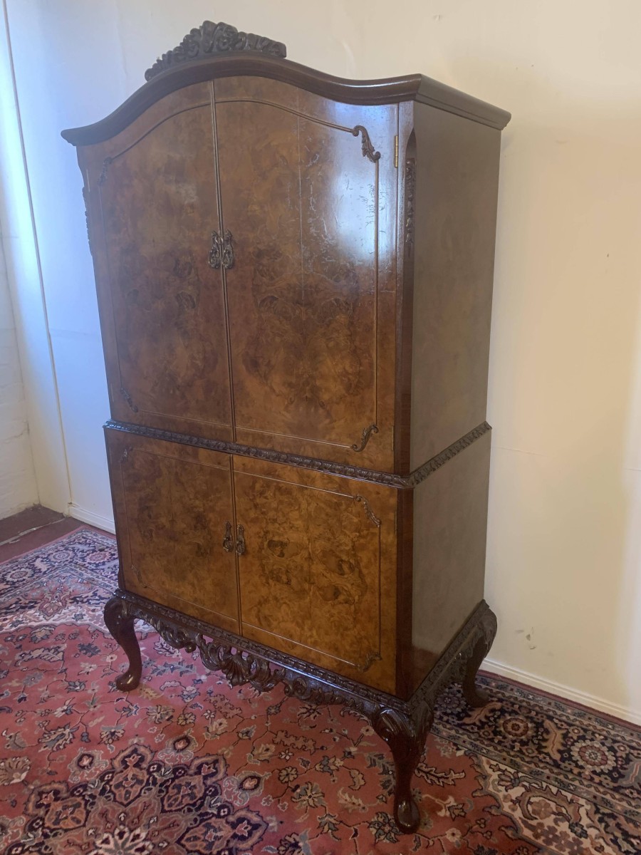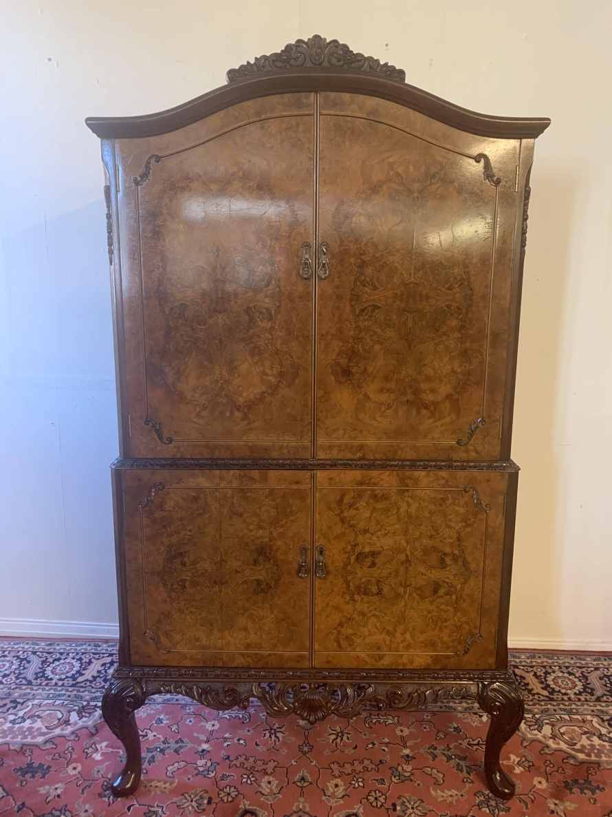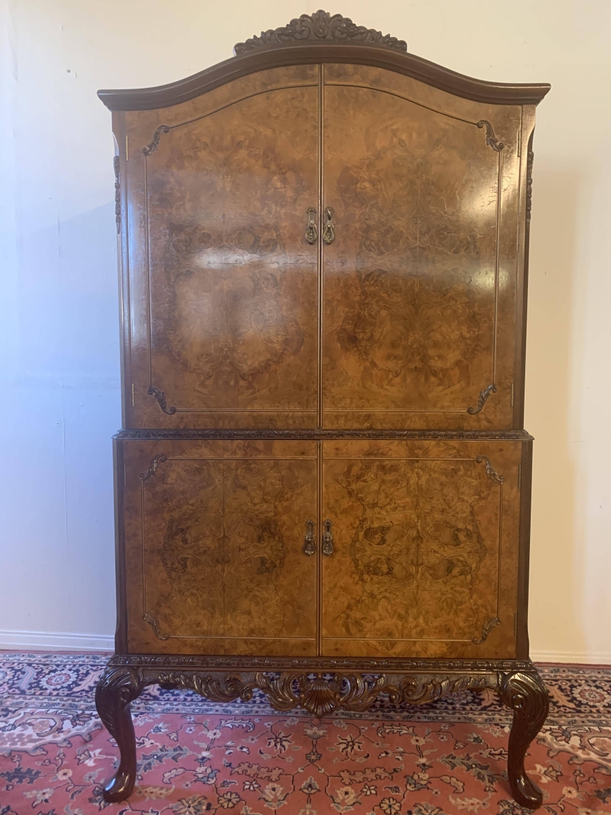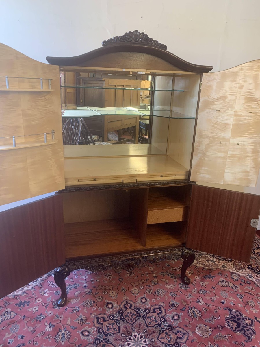 The shaped top rises to a central ornate carving. Below are a pair of of lockable doors. The doors open to reveal a mirrored back and two shaped glass shelves. There is also a sliding serving shelf. Underneath are a pair of lockable doors, the doors open to reveal bottle storage space a shelf and a drawer. There is a stunning carved skirt to the front and sides this super item stands on four carved shaped cabriole legs. Please note the patina of the walnut is striking. The cabinet is in fantastic condition.