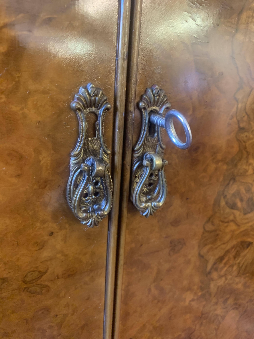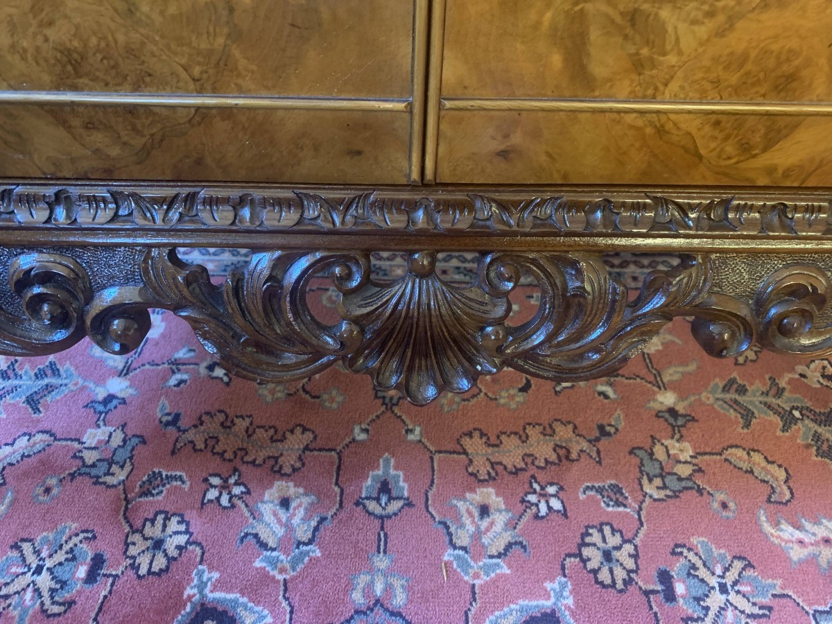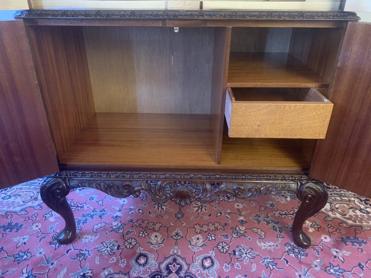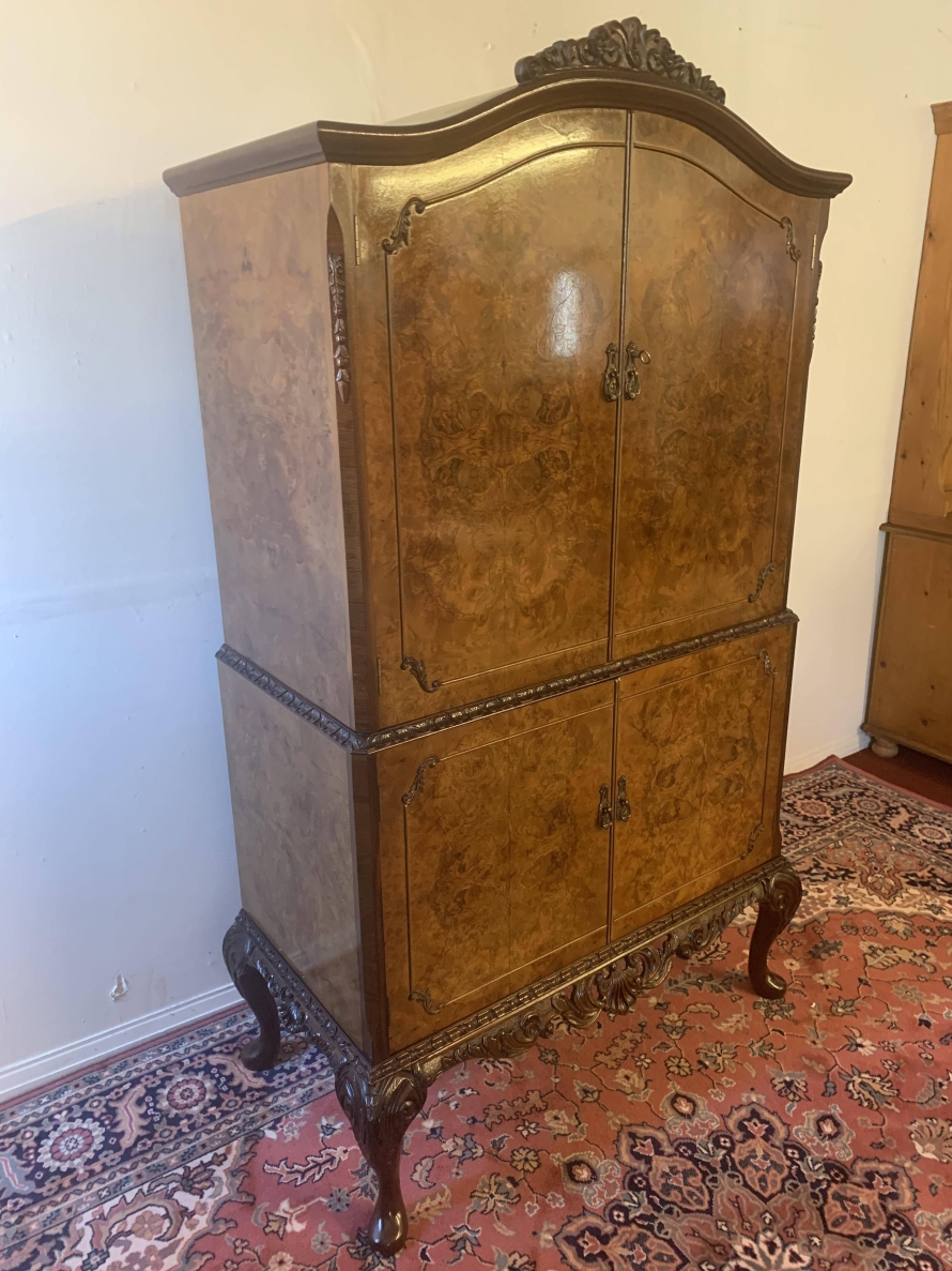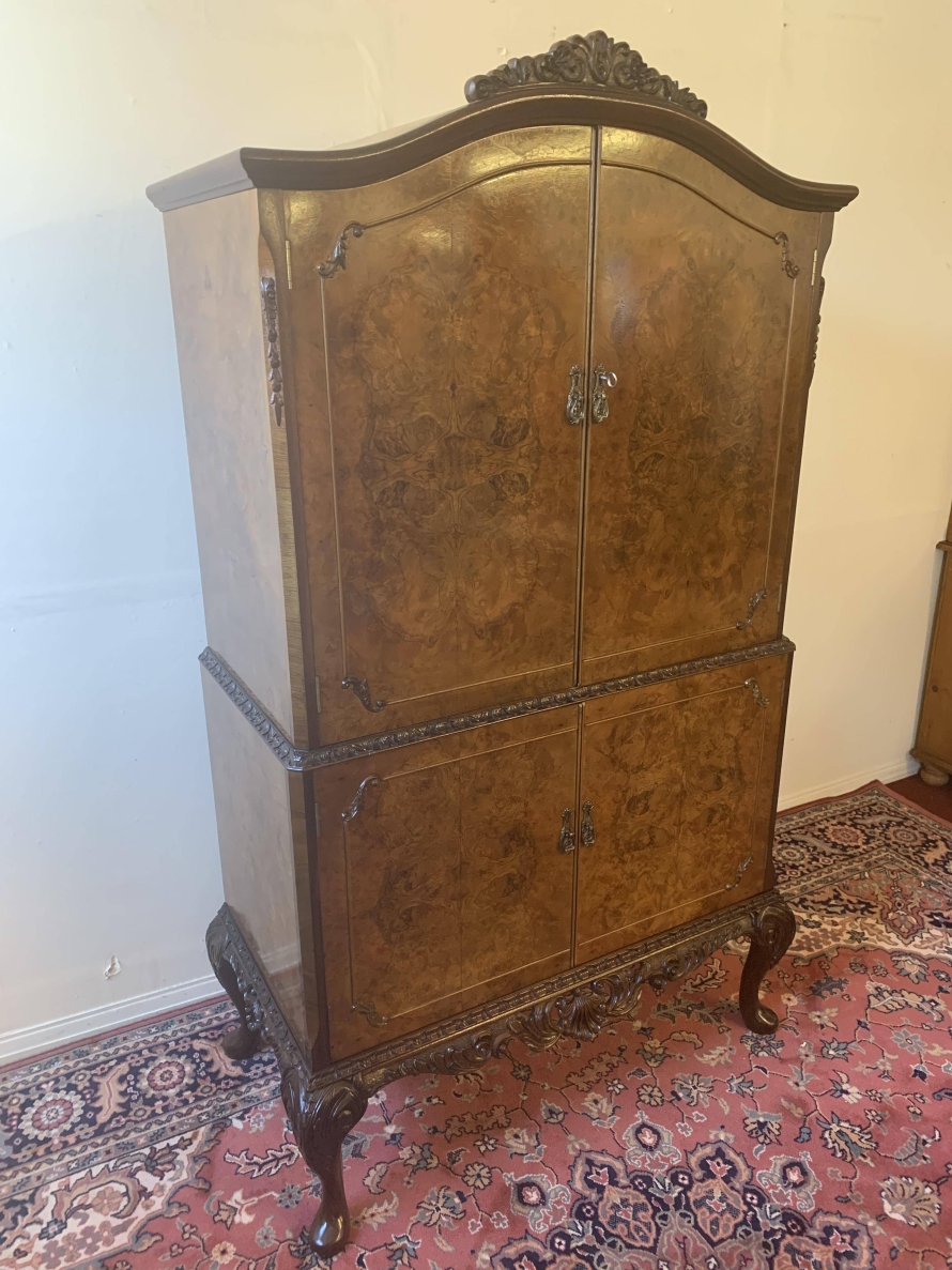 The shaped top rises to a central ornate carving. Below are a pair of of lockable doors. The doors open to reveal a mirrored back and two shaped glass shelves. There is also a sliding serving shelf. Underneath are a pair of lockable doors, the doors open to reveal bottle storage space a shelf and a drawer. There is a stunning carved skirt to the front and sides this super item stands on four carved shaped cabriole legs. Please note the patina of the walnut is striking. The cabinet is in fantastic condition.