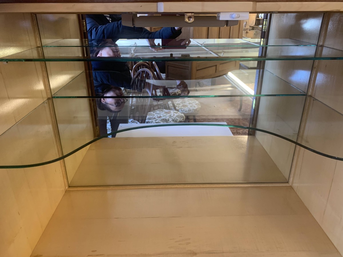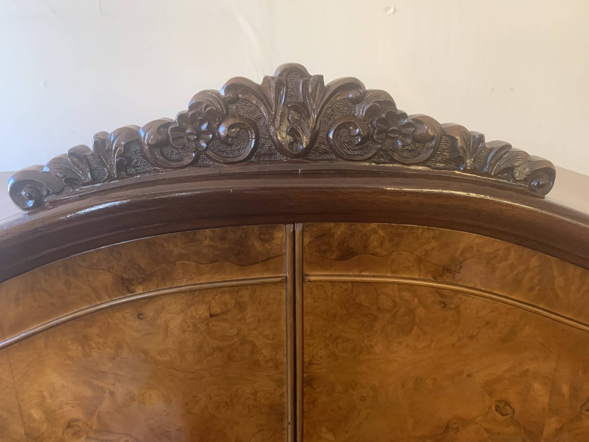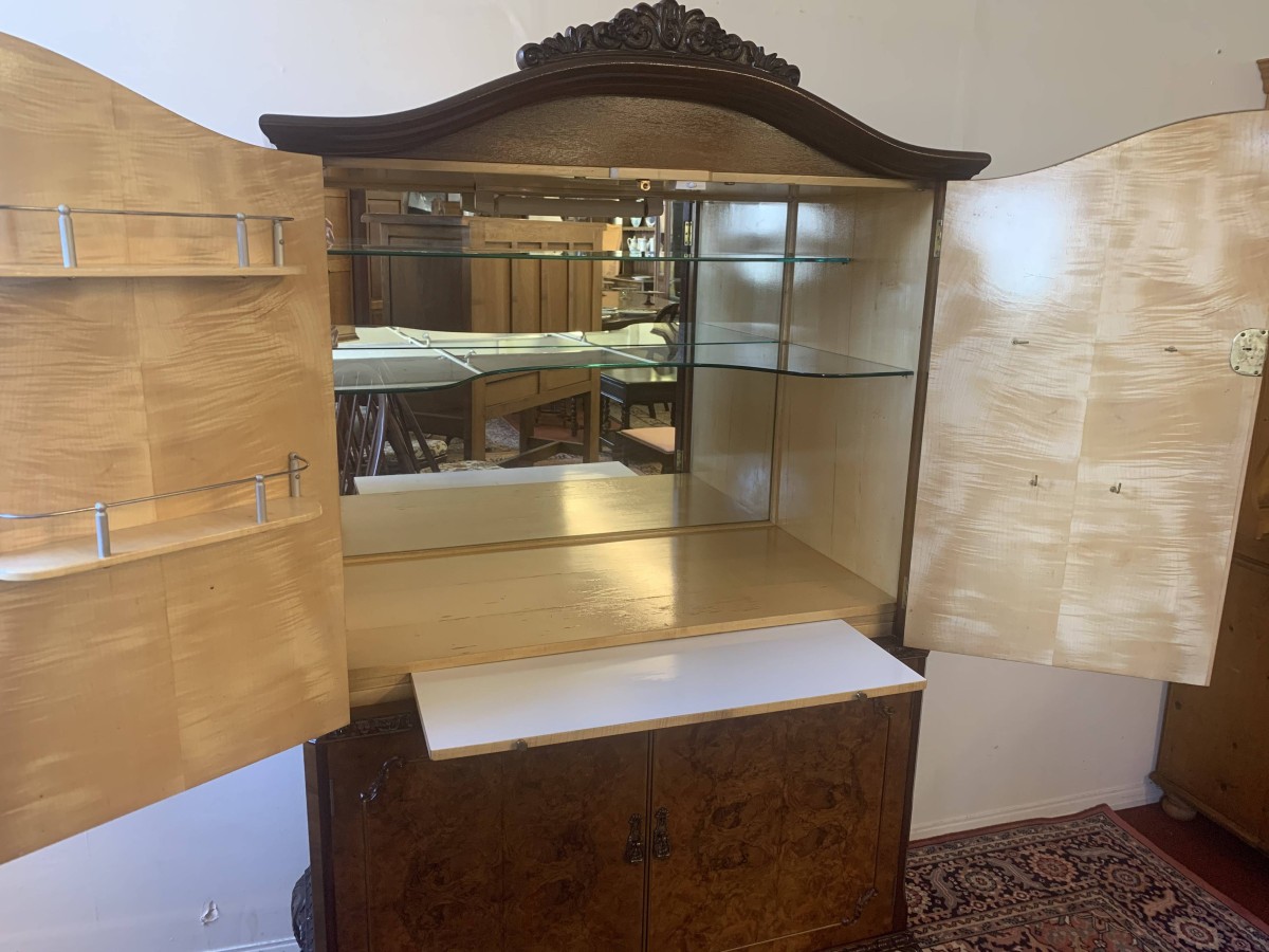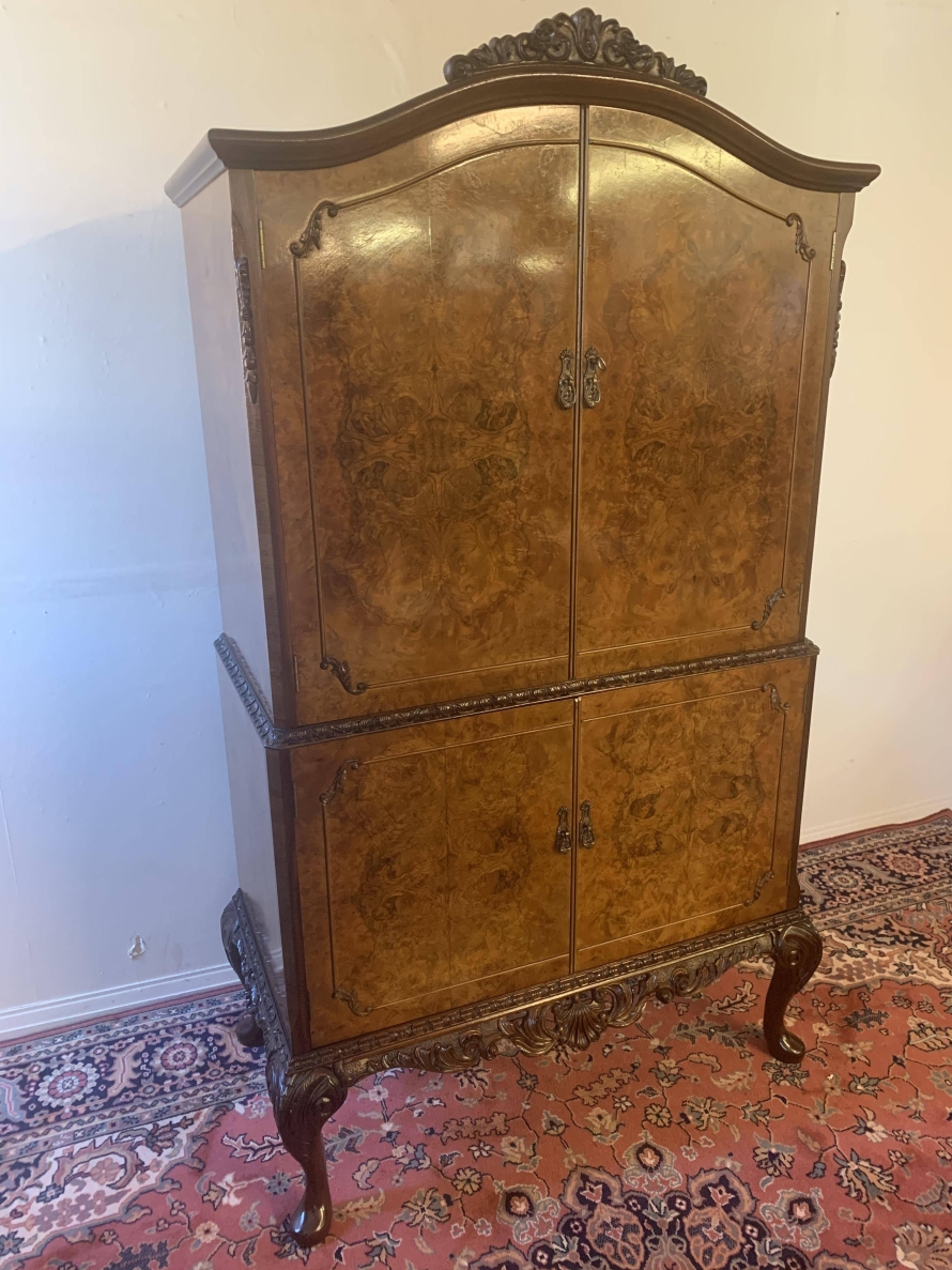 The shaped top rises to a central ornate carving. Below are a pair of of lockable doors. The doors open to reveal a mirrored back and two shaped glass shelves. There is also a sliding serving shelf. Underneath are a pair of lockable doors, the doors open to reveal bottle storage space a shelf and a drawer. There is a stunning carved skirt to the front and sides this super item stands on four carved shaped cabriole legs. Please note the patina of the walnut is striking. The cabinet is in fantastic condition.