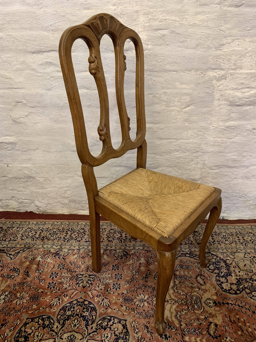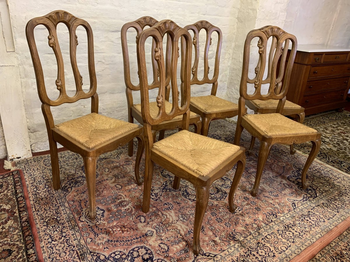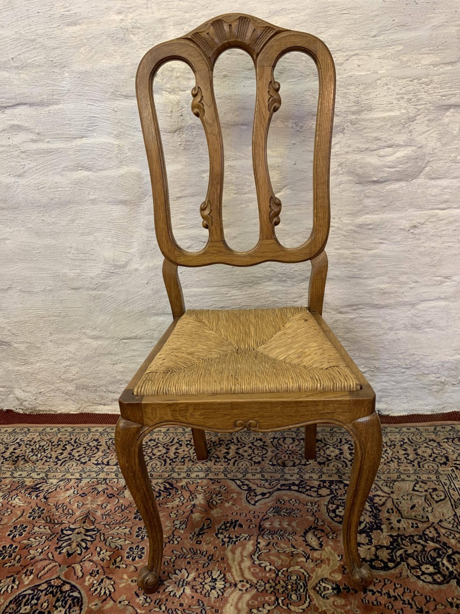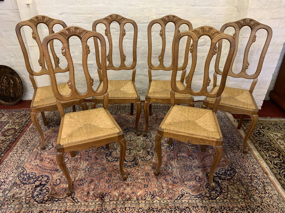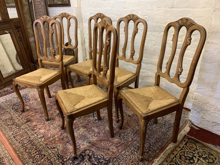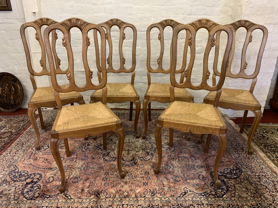 This super set of chairs are in excellent condition. Shaped carved back, removable rush seat, shaped skirt and standing on two elegant carved cabriole shaped legs to the front.