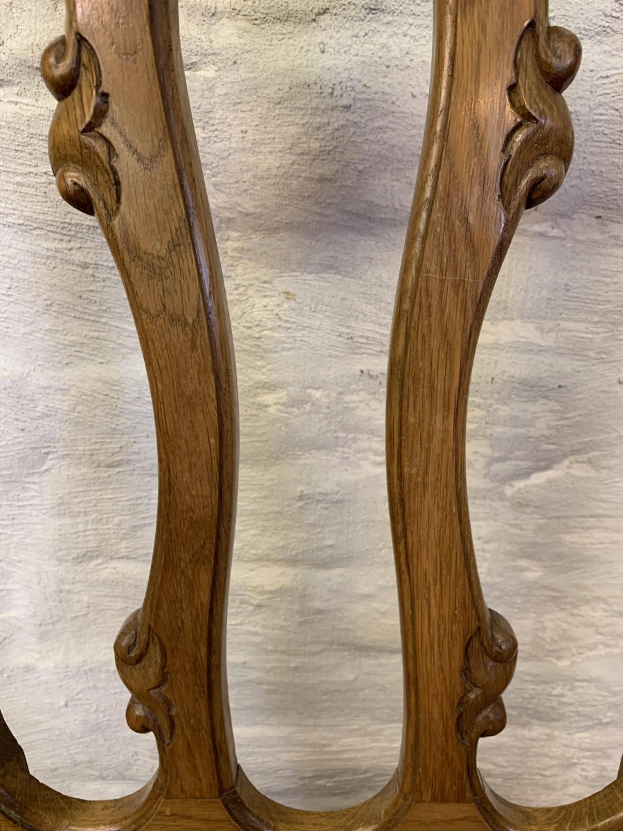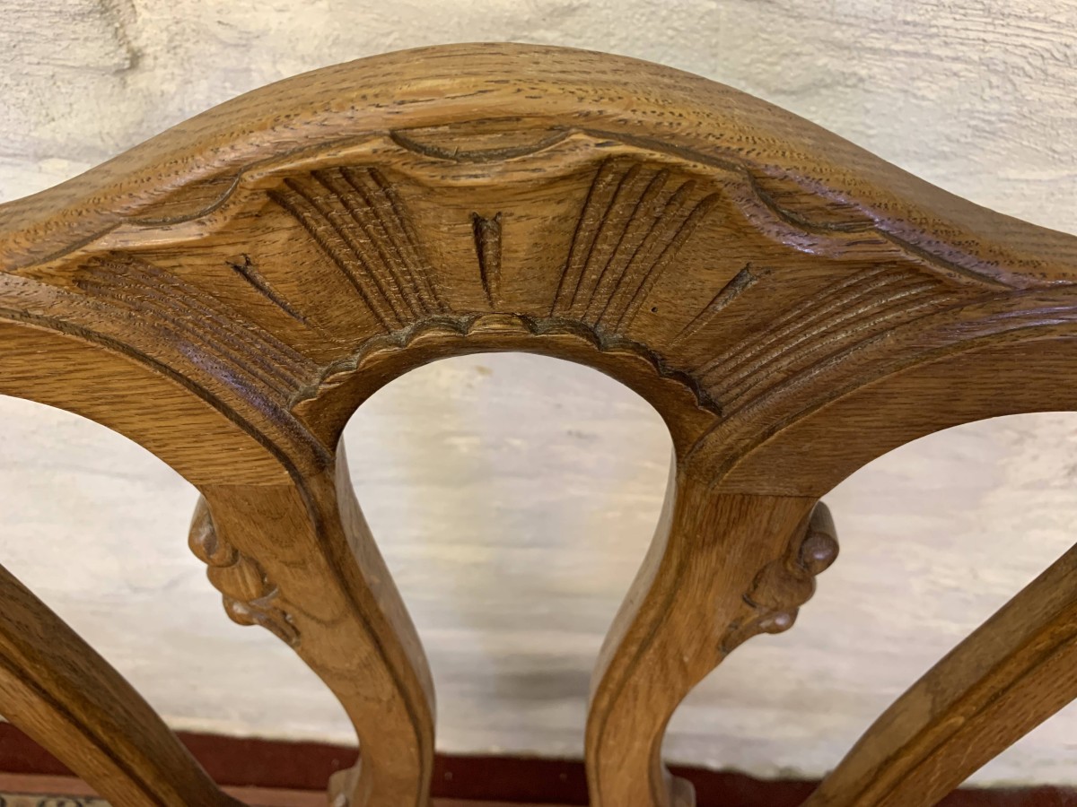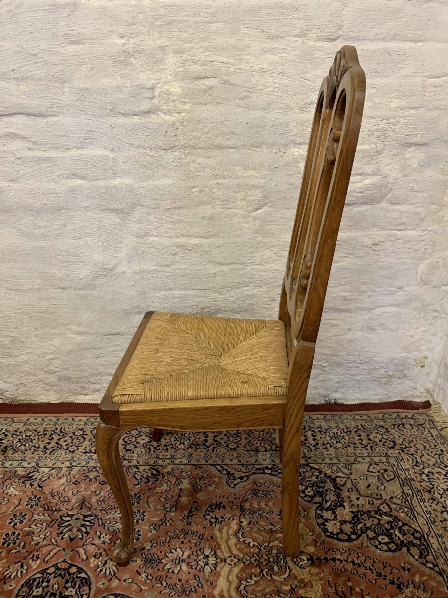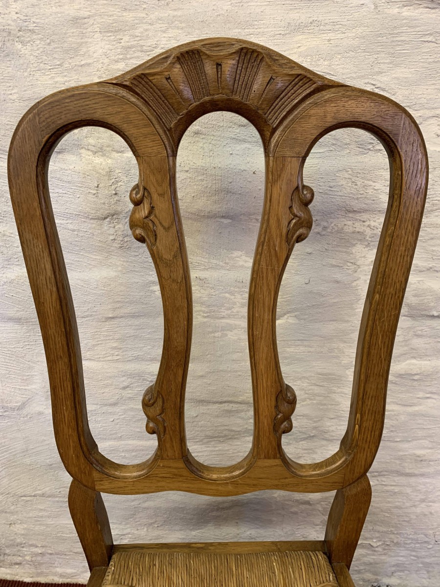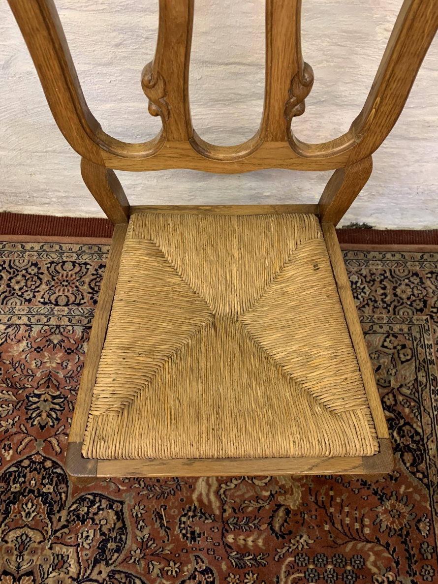 This super set of chairs are in excellent condition. Shaped carved back, removable rush seat, shaped skirt and standing on two elegant carved cabriole shaped legs to the front.