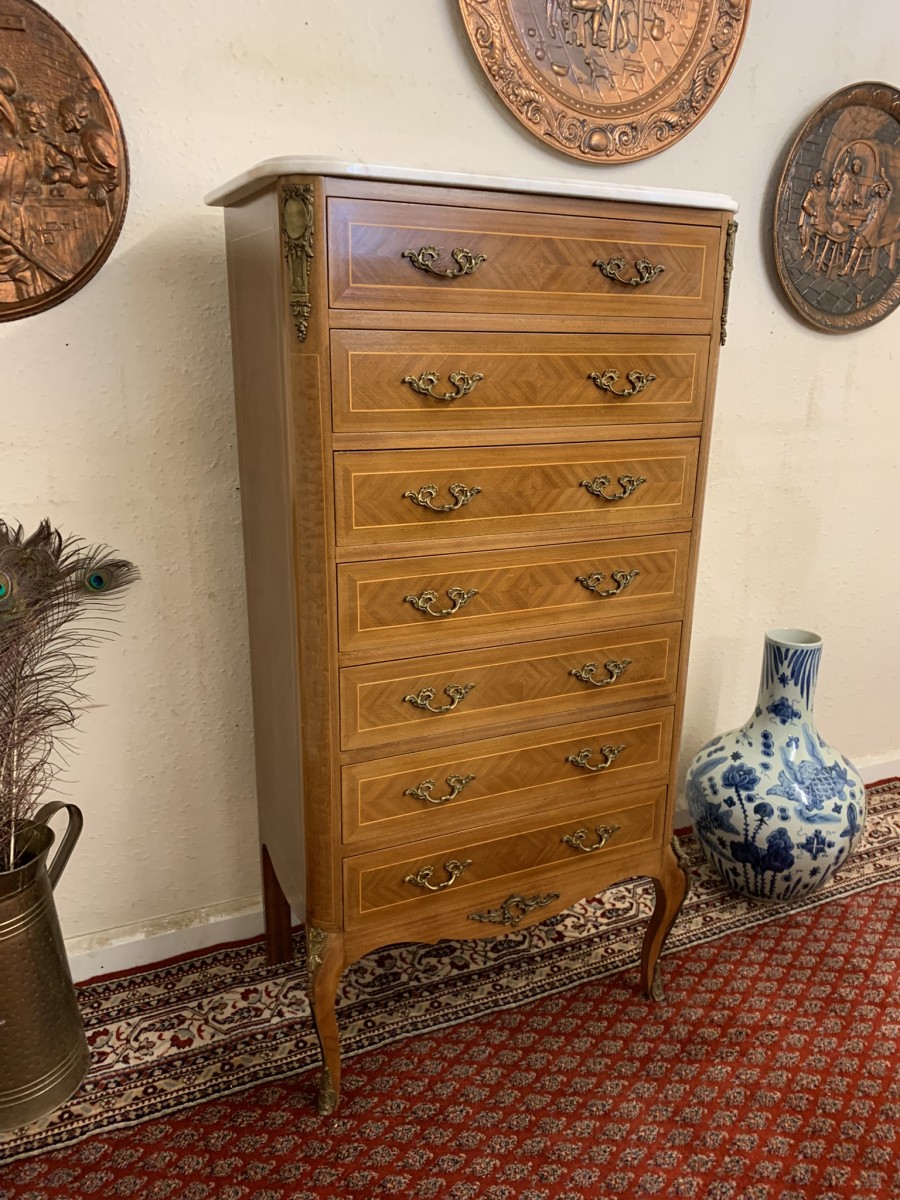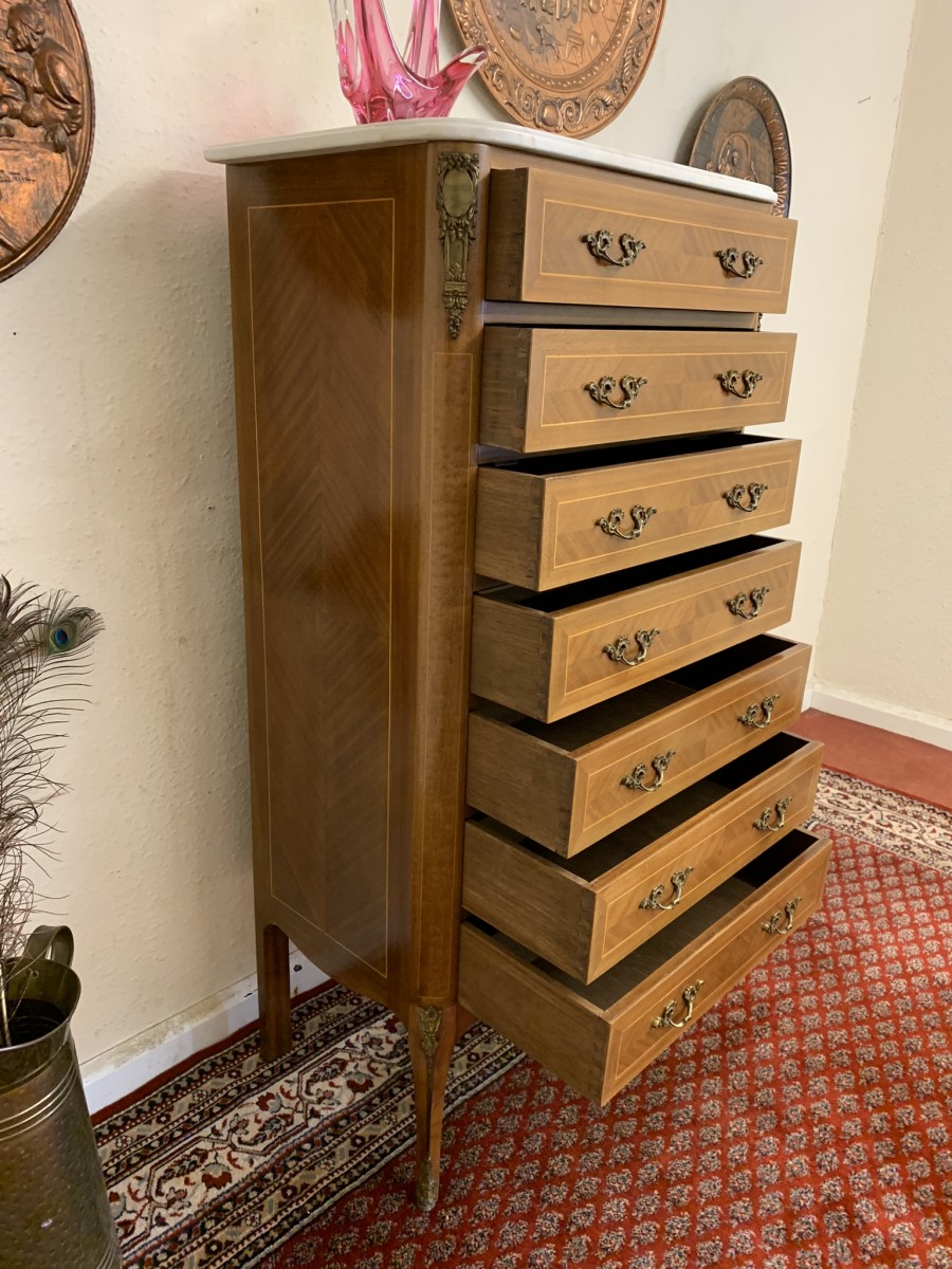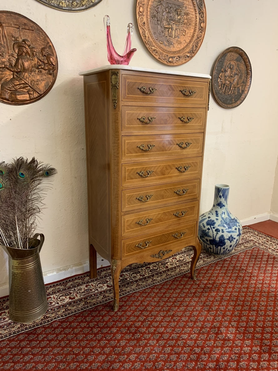 - Elegant Tall French Inlaid Mahogany Marble Topped Commode/chest Of Drawers