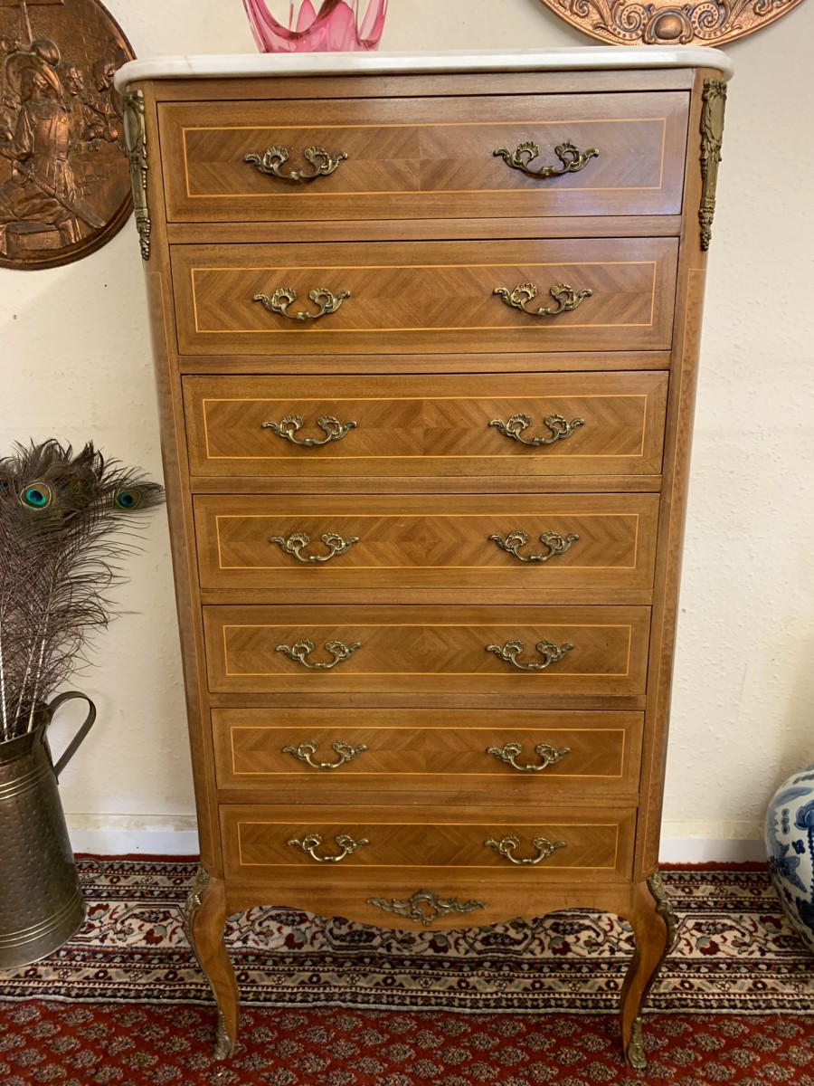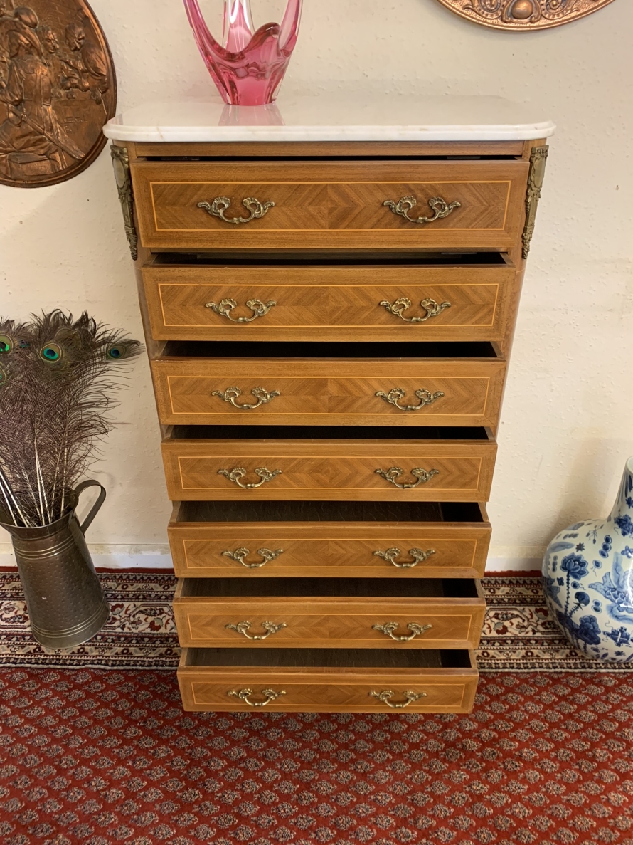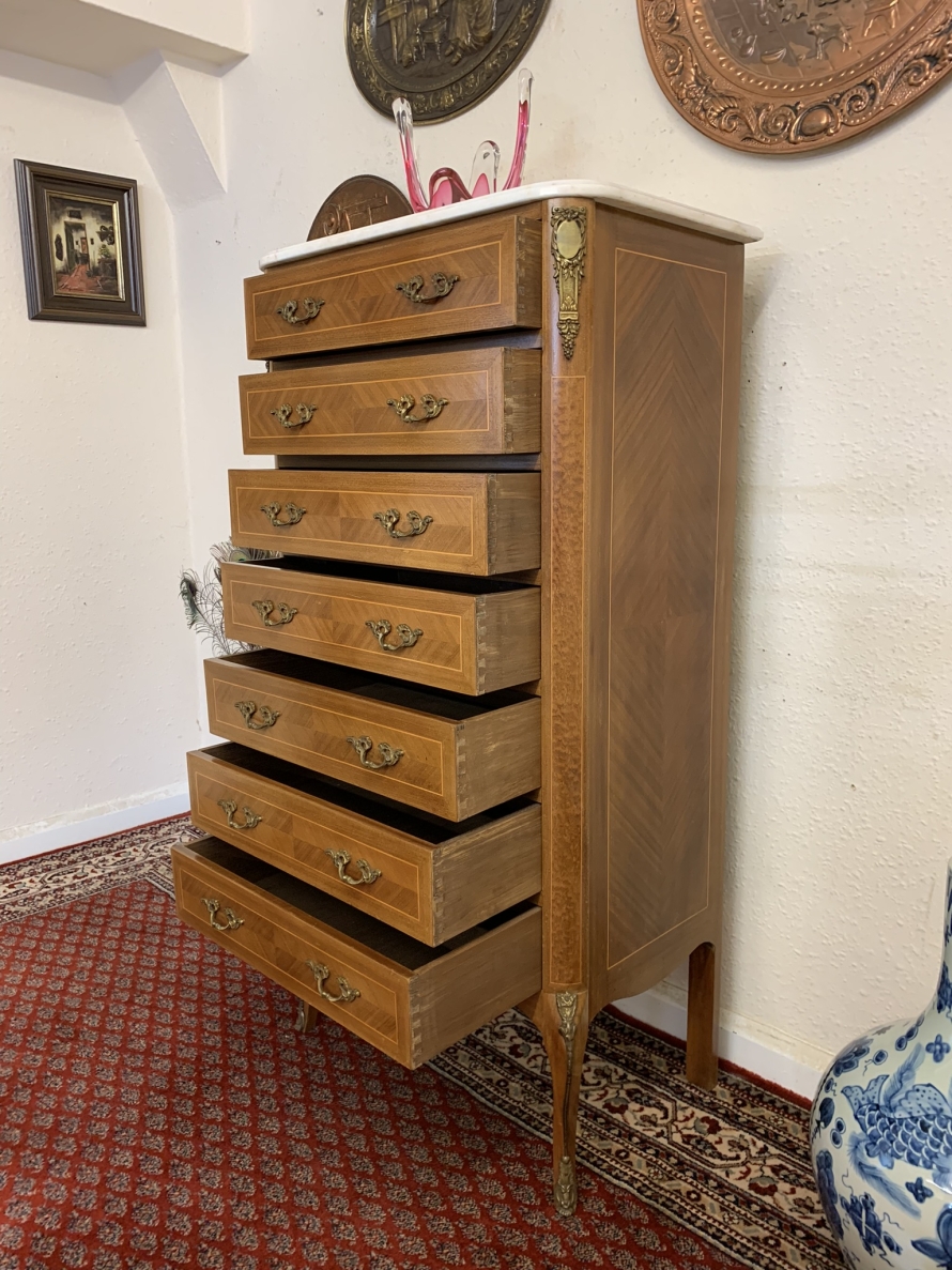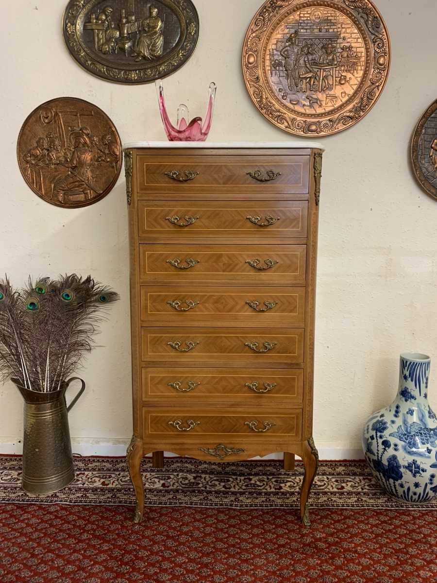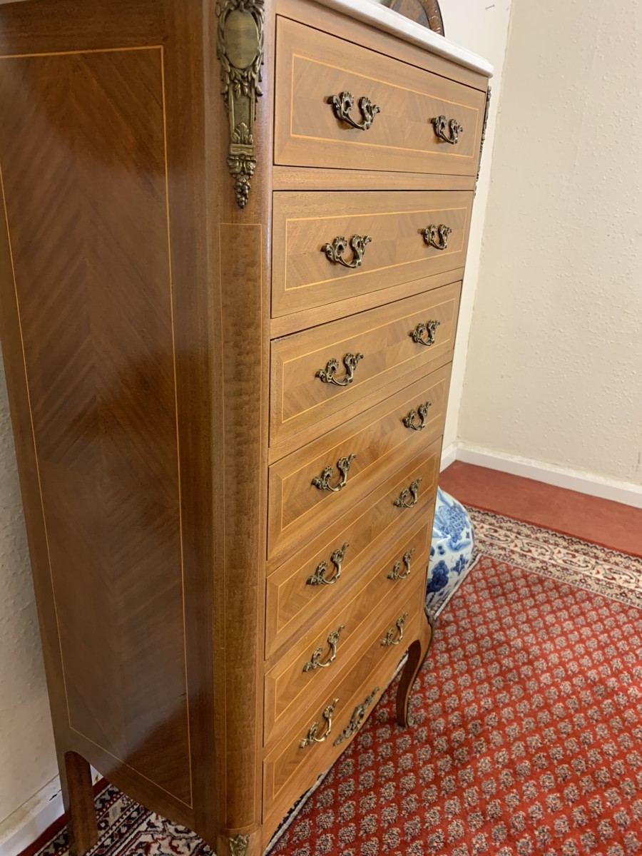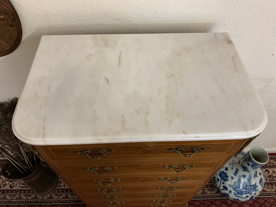 The striking white marble top sits above seven drawers, each drawer having string inlay decoration and a pair of ornate brass handles. Gilt mount's to the top corners, inlaid decoration to the sides, shaped skirt and standing on two elegant cabriole legs with decorative gilt mounts.
