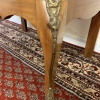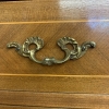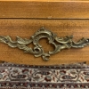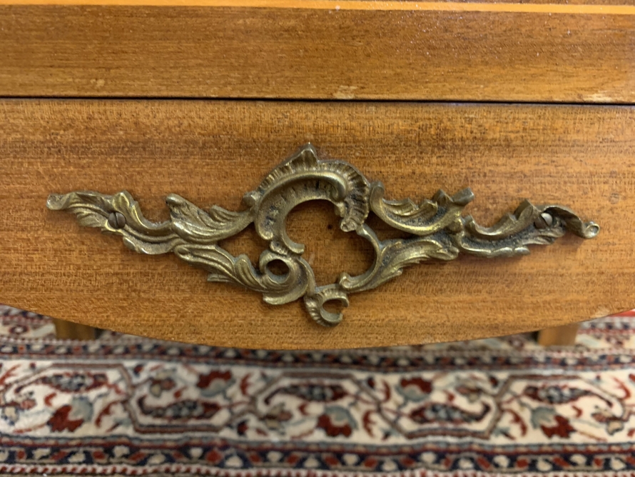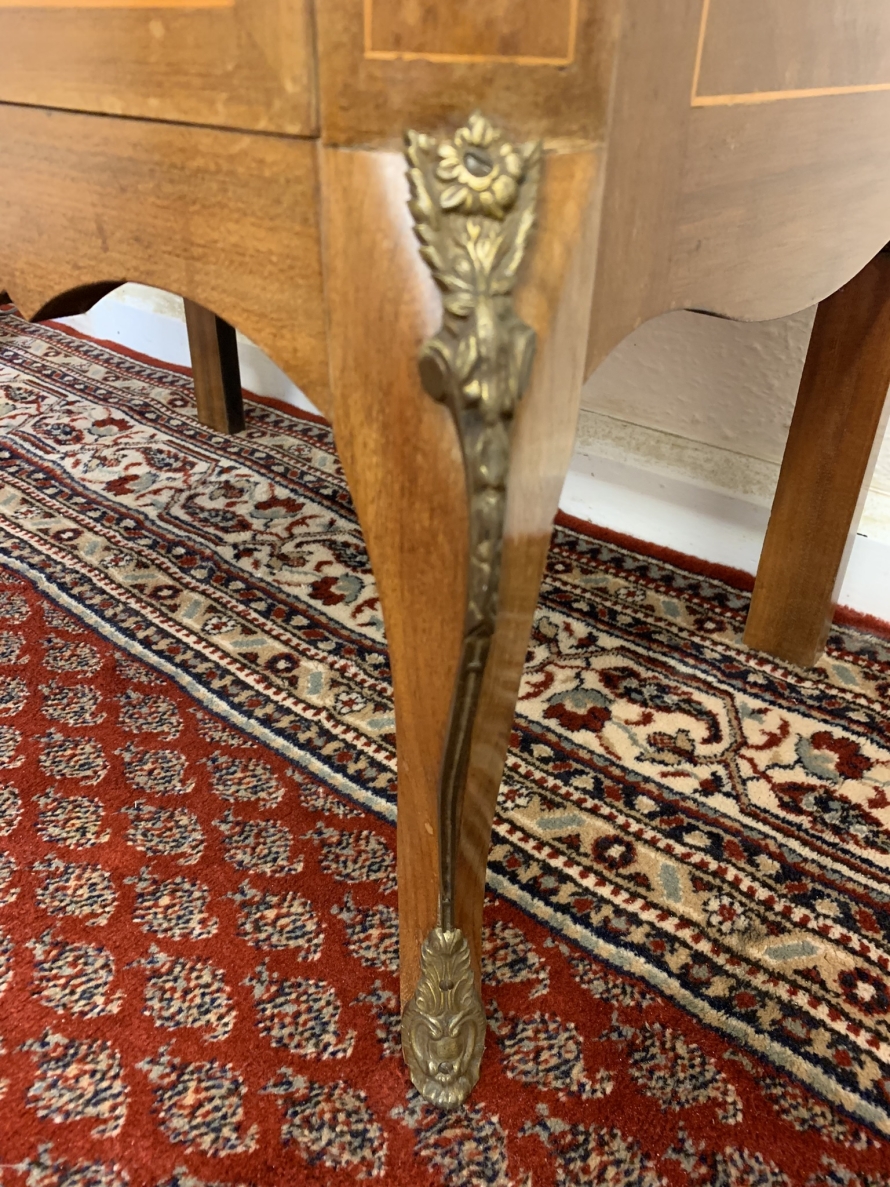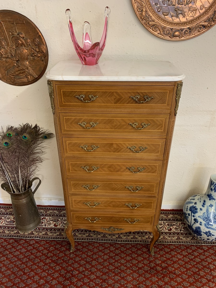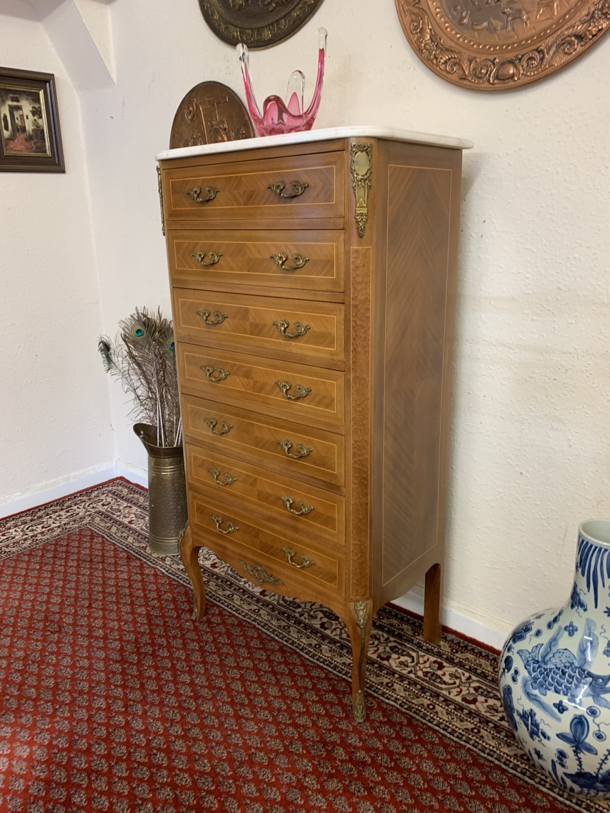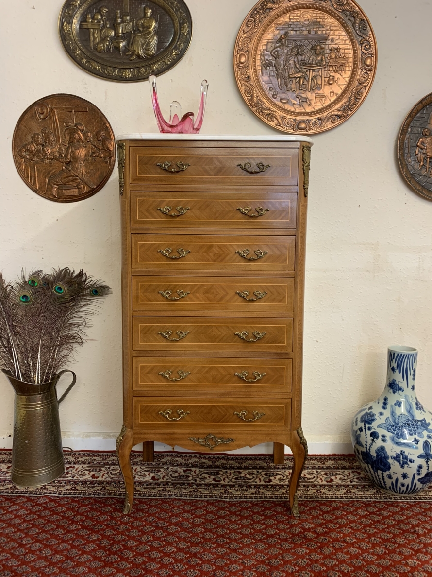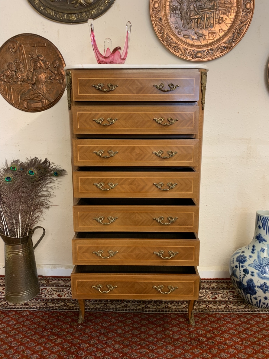The striking white marble top sits above seven drawers, each drawer having string inlay decoration and a pair of ornate brass handles. Gilt mount's to the top corners, inlaid decoration to the sides, shaped skirt and standing on two elegant cabriole legs with decorative gilt mounts.