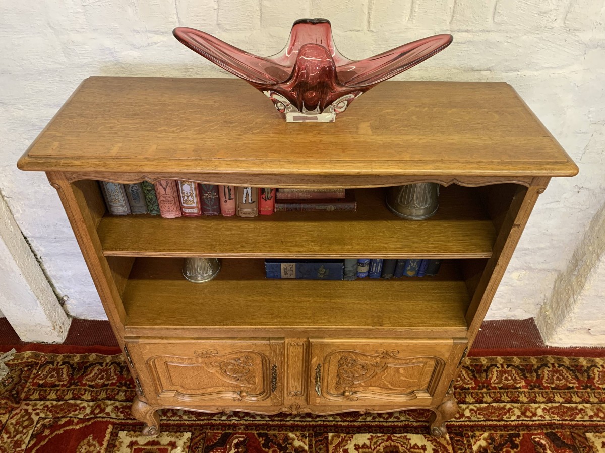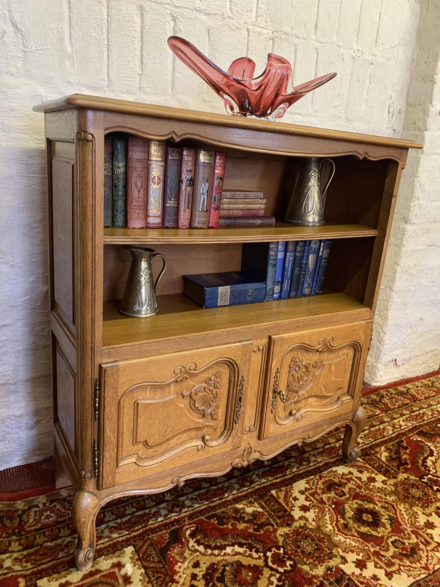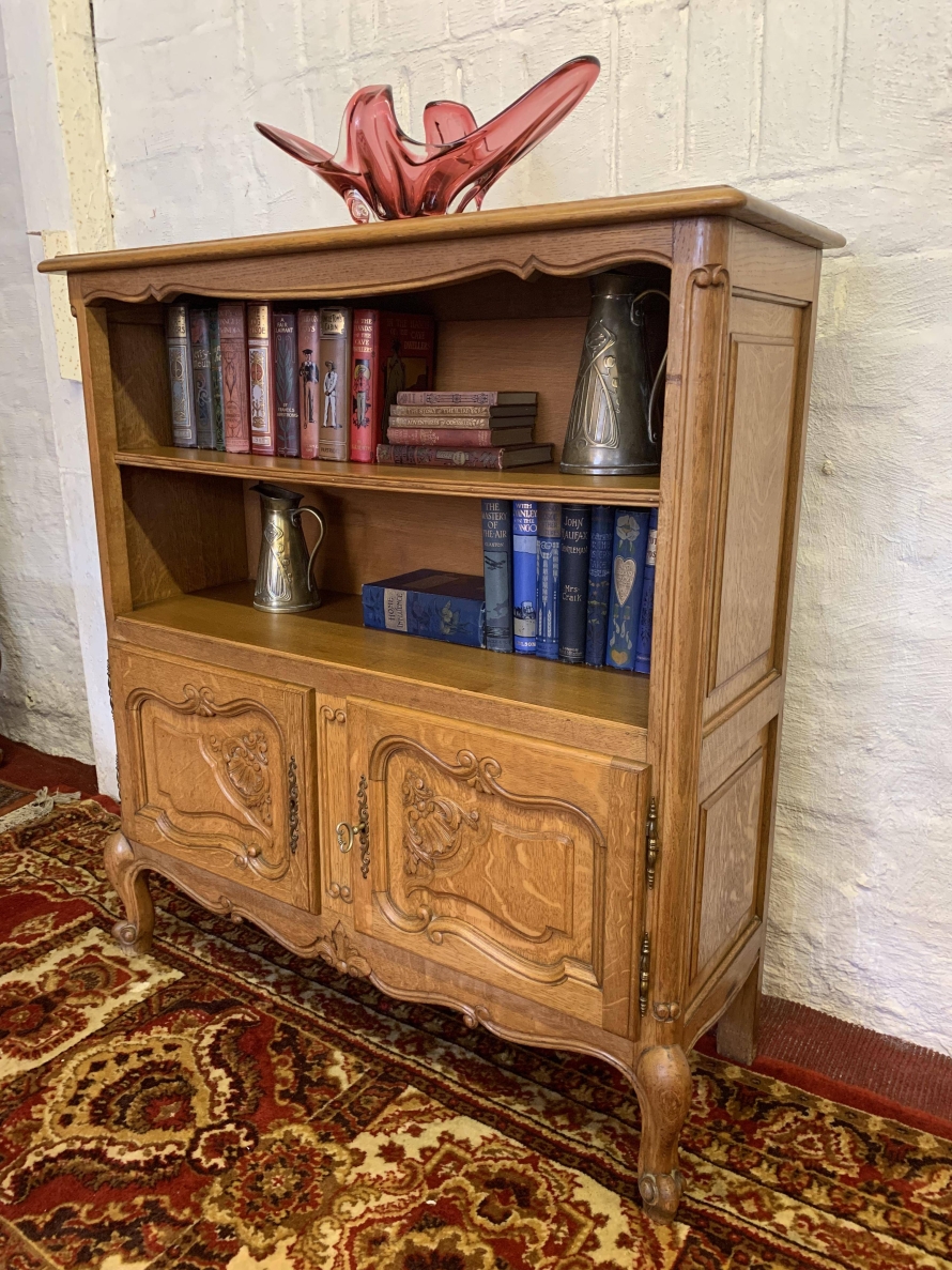 - Elegant Vintage French Carved Oak Open Bookcase With Cupboards Below – Now Sold