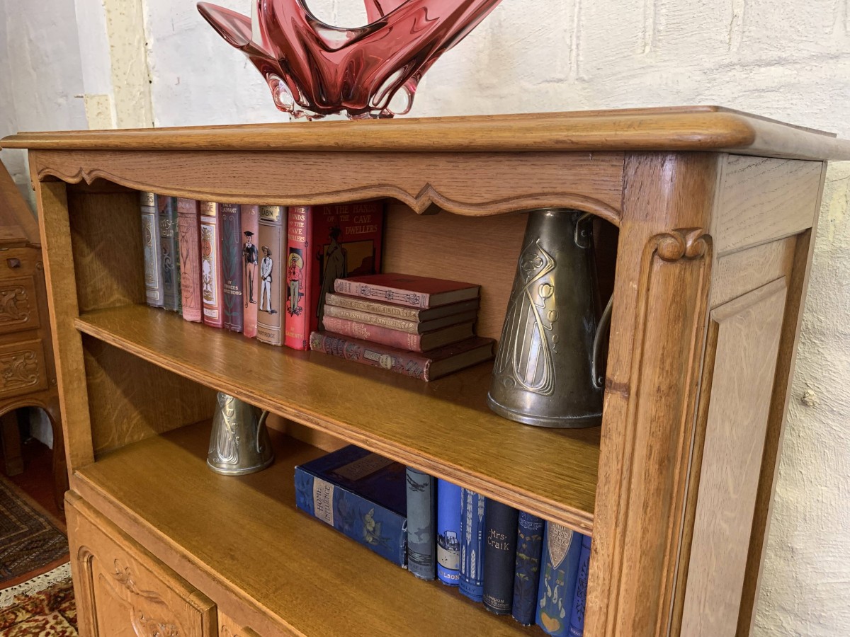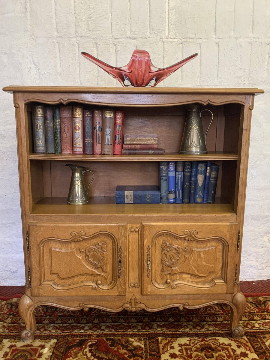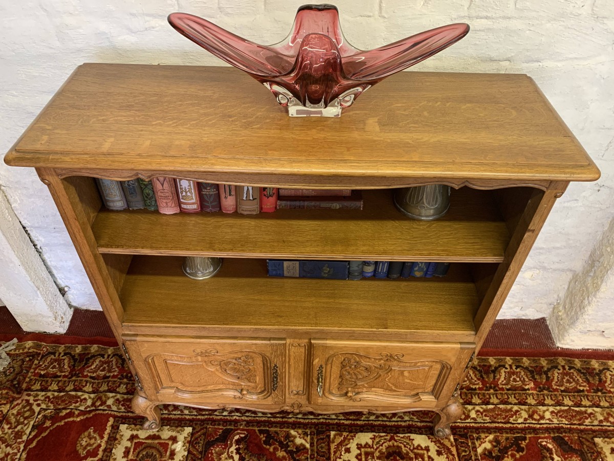 - Elegant Vintage French Carved Oak Open Bookcase With Cupboards Below – Now Sold