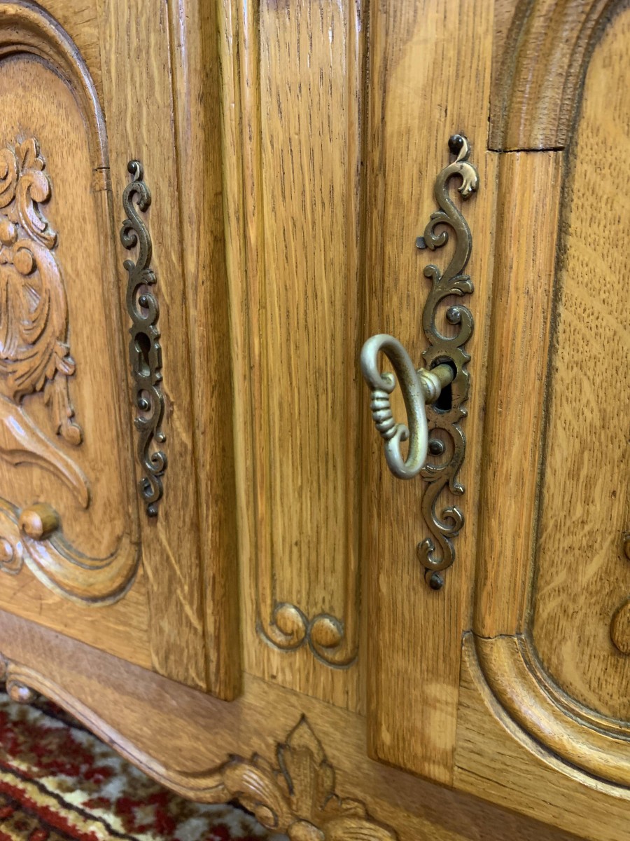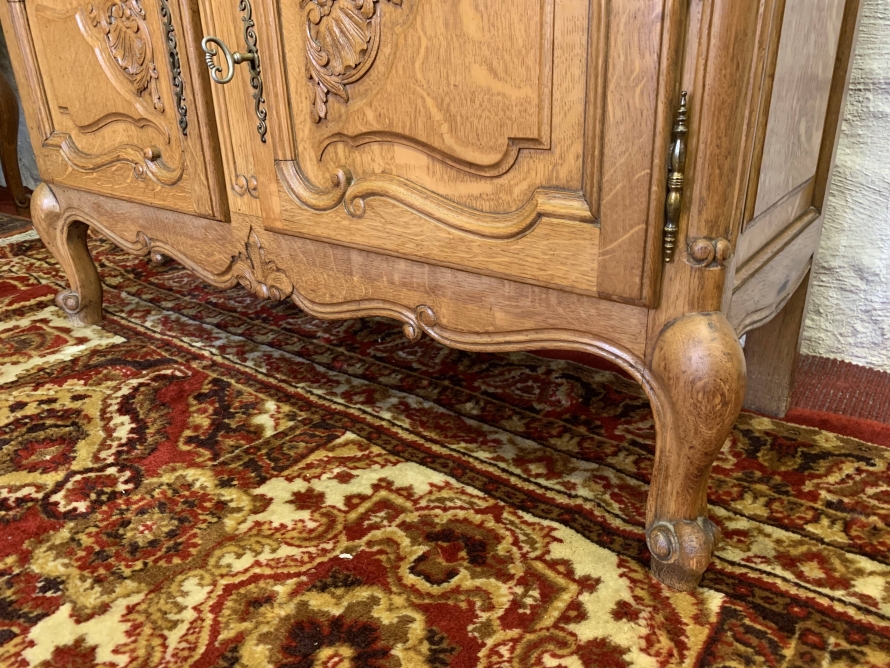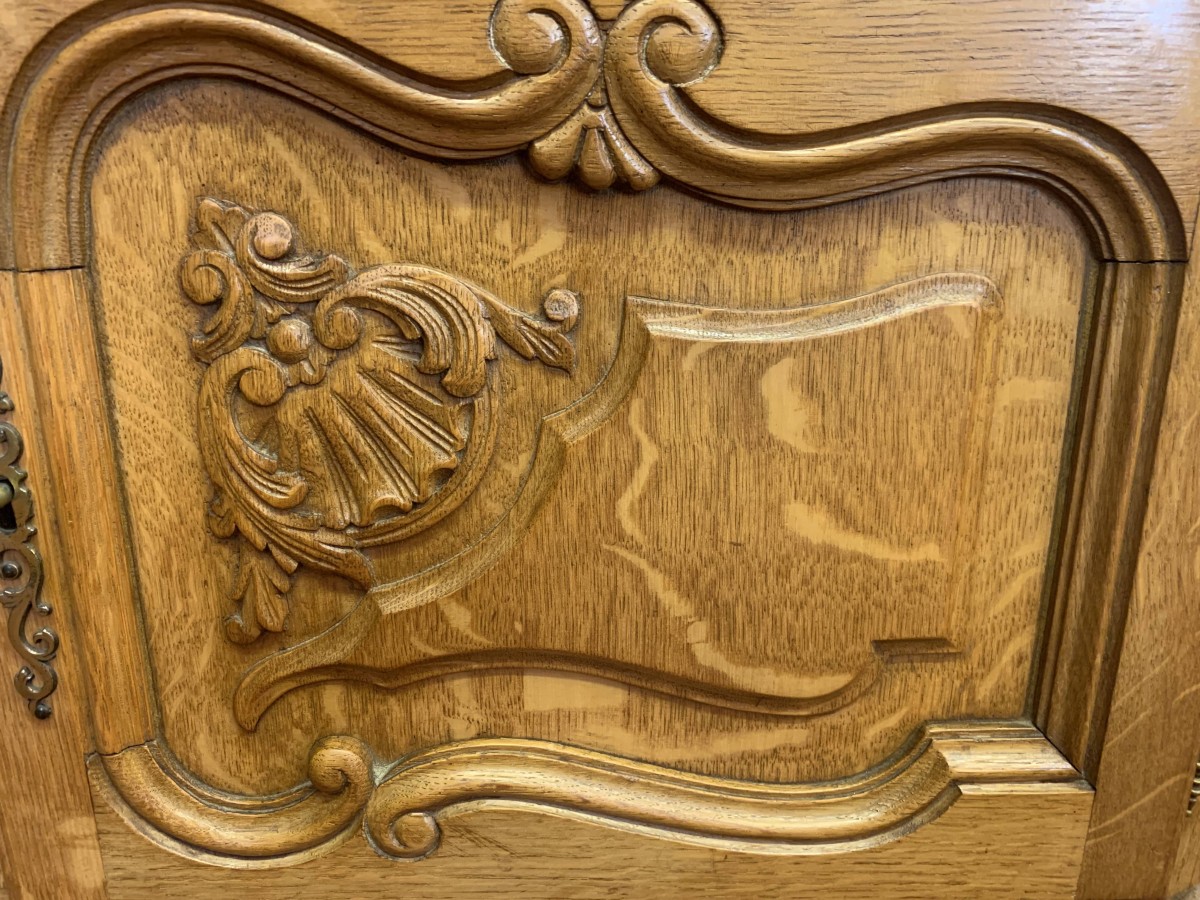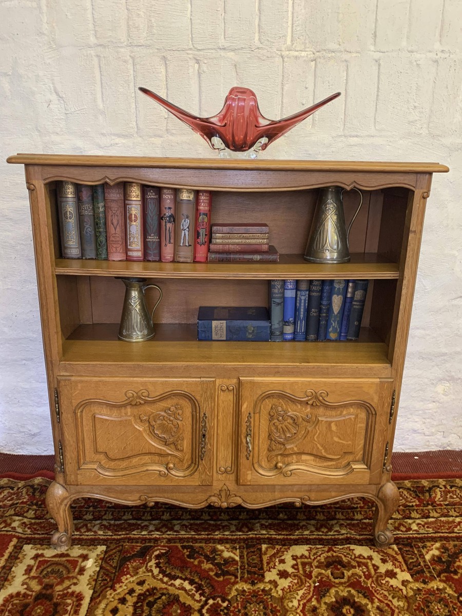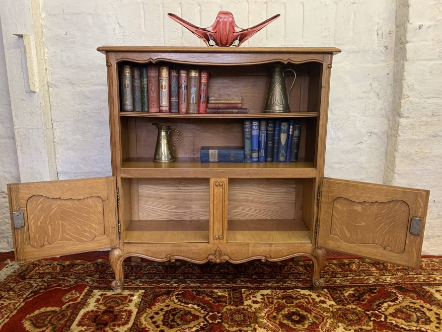 The oversailing top sits above an open section which has a removable shelf, below are a pair of carved recessed panelled lockable doors, the doors open to reveal a storage area. Recessed panelled sides, shaped skirt with ornate central carving this fantastic vintage French bookcase stands on two carved cabriole shaped legs to the front.