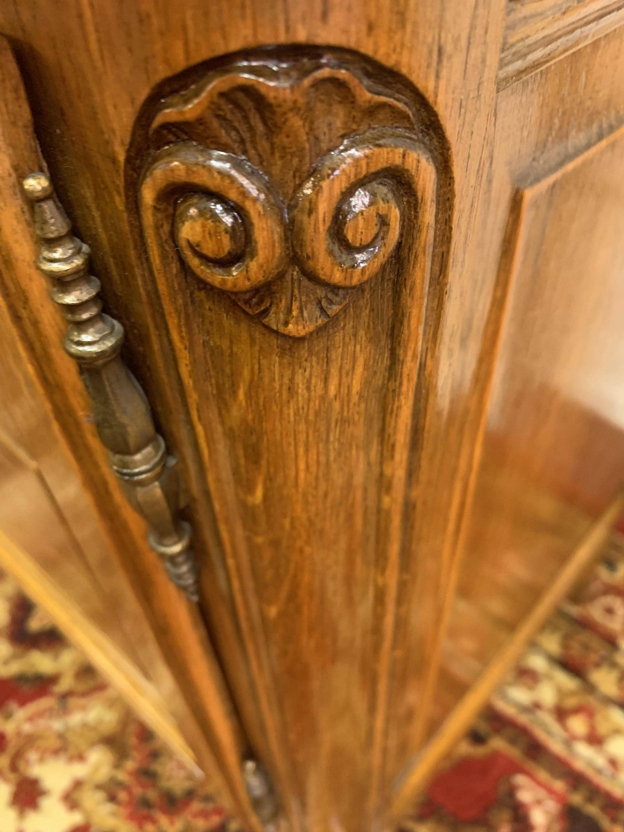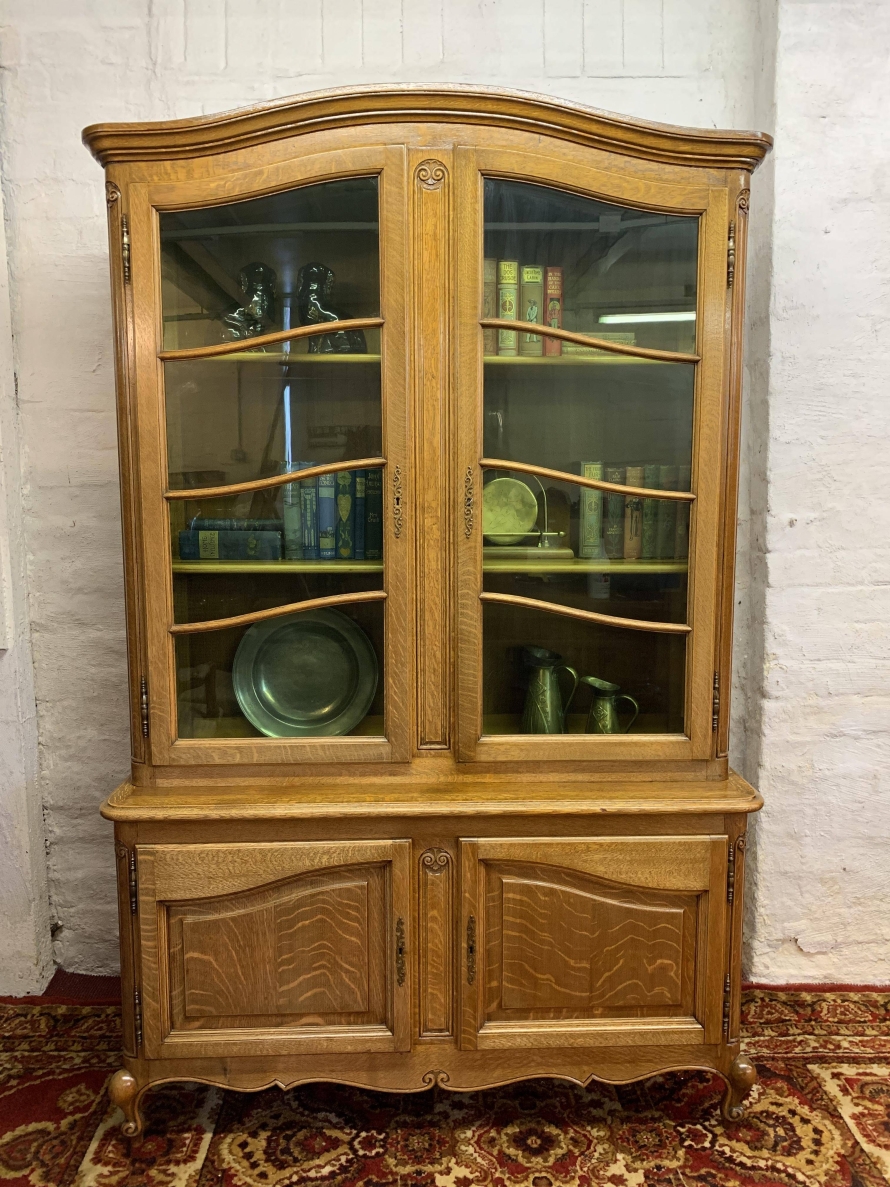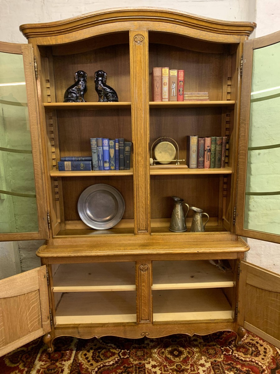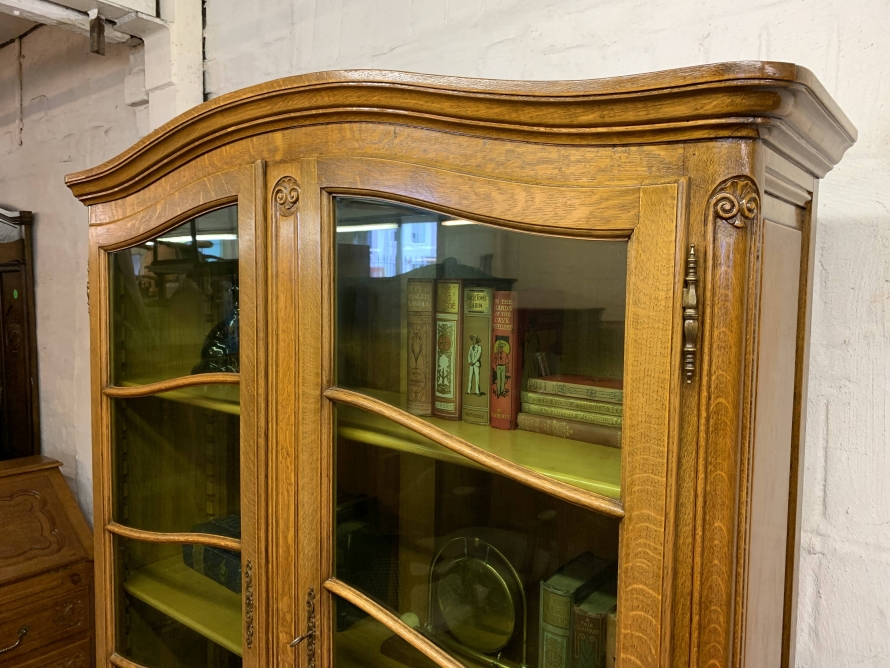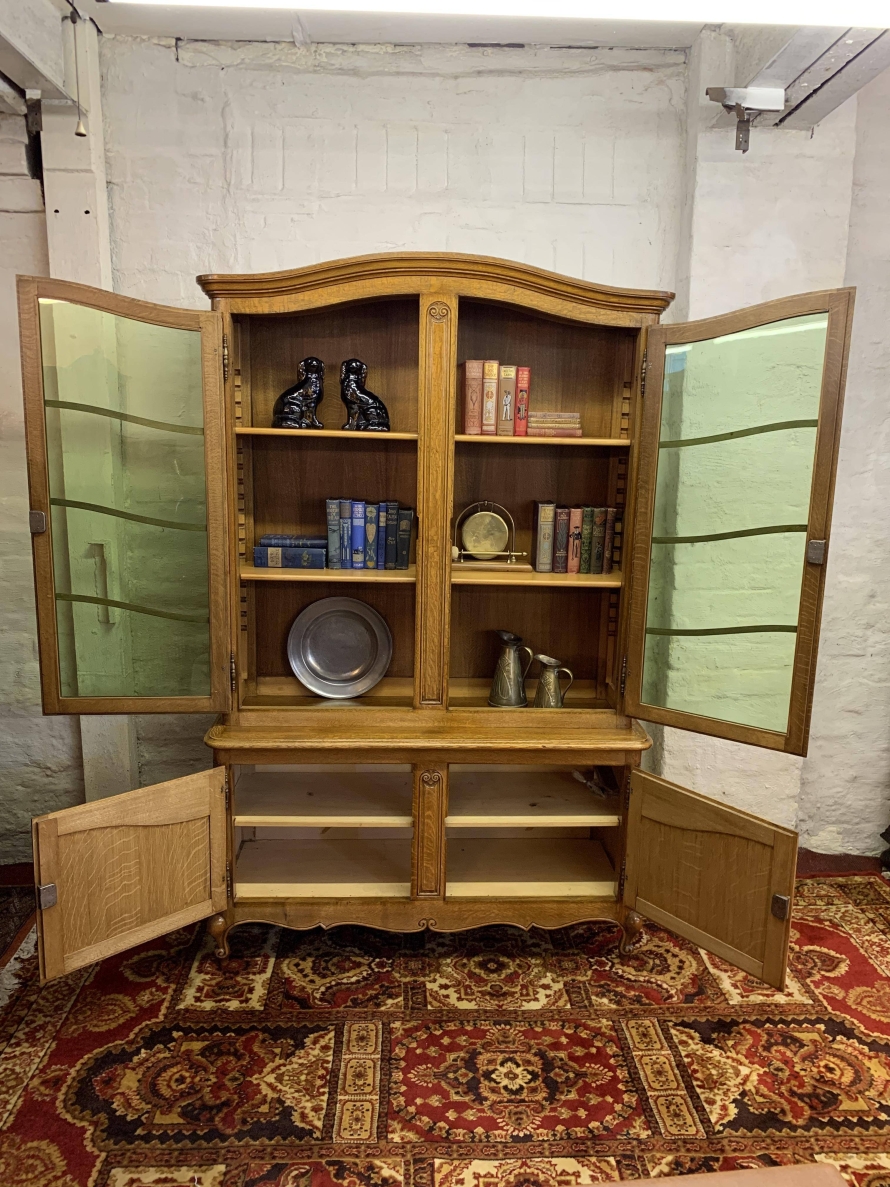 The shaped oversailing top sits above a pair of lockable glazed doors (glazing slightly tinted green), the doors open to reveal two adjustable/removable shelves. Below are a pair of lockable recessed panelled cupboard doors each door having brass hinges and decorative brass escutcheon. The doors open to reveal a removable shelf. Recessed panelled sides – this vitrine sits on two carved cabriole shaped legs to the front.