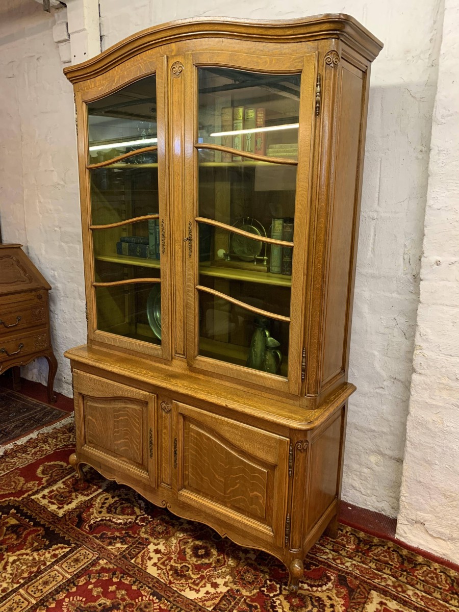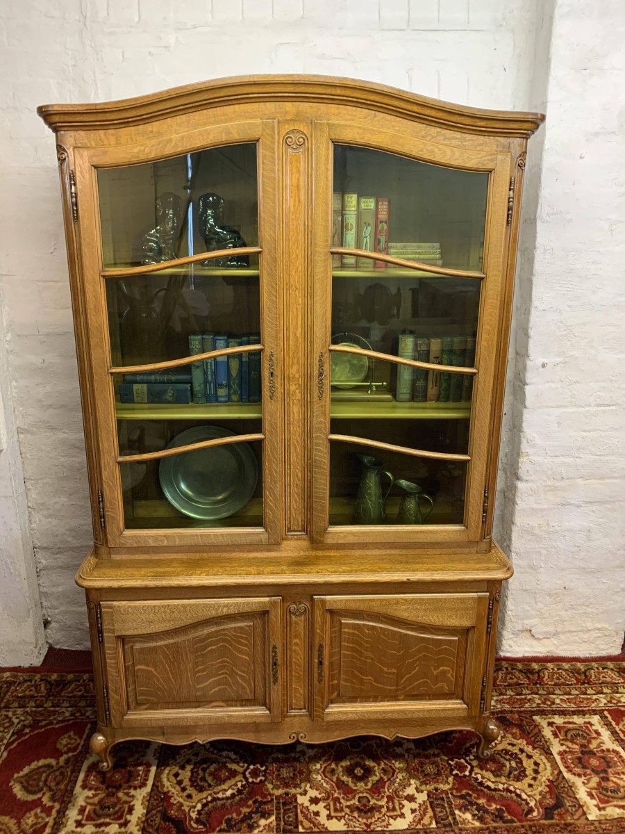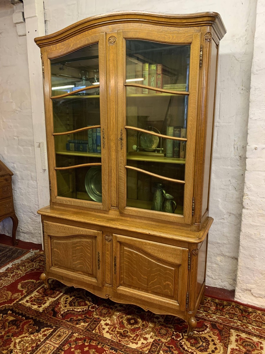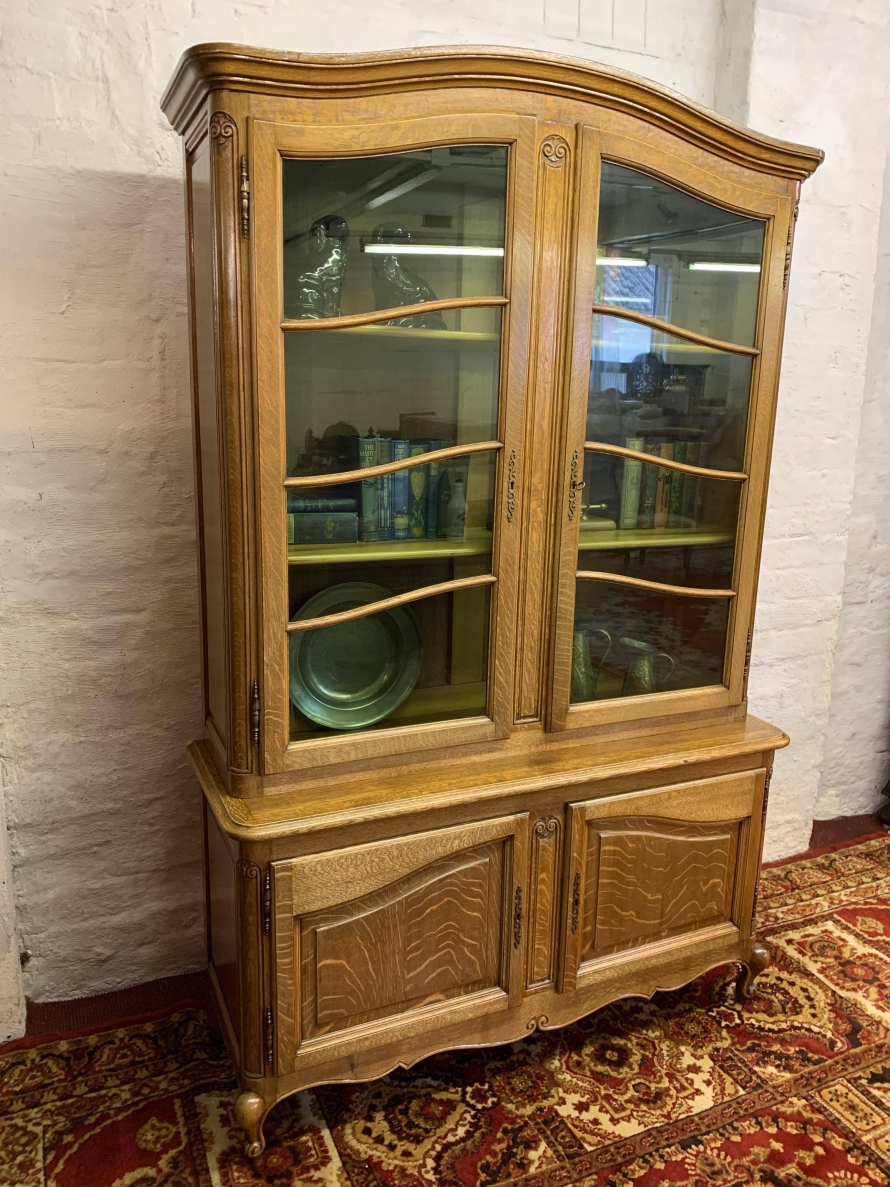 The shaped oversailing top sits above a pair of lockable glazed doors (glazing slightly tinted green), the doors open to reveal two adjustable/removable shelves. Below are a pair of lockable recessed panelled cupboard doors each door having brass hinges and decorative brass escutcheon. The doors open to reveal a removable shelf. Recessed panelled sides – this vitrine sits on two carved cabriole shaped legs to the front.