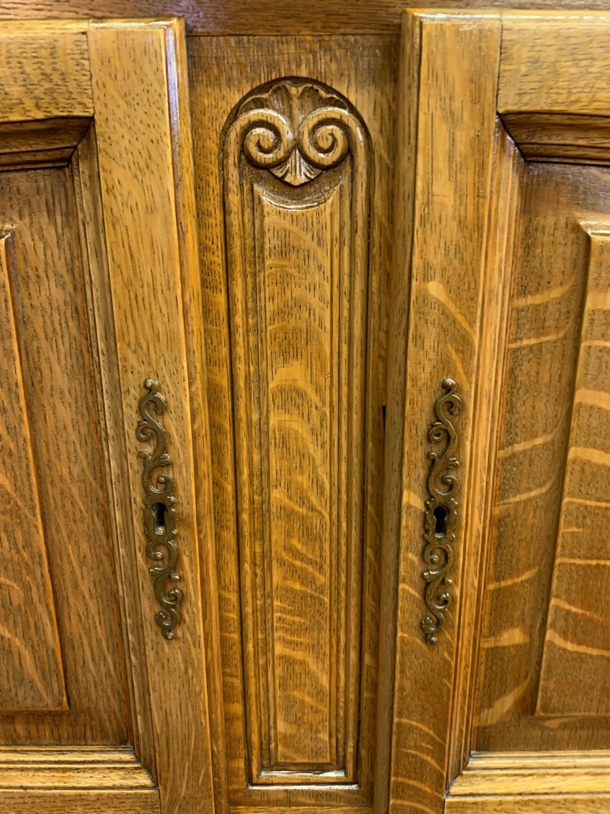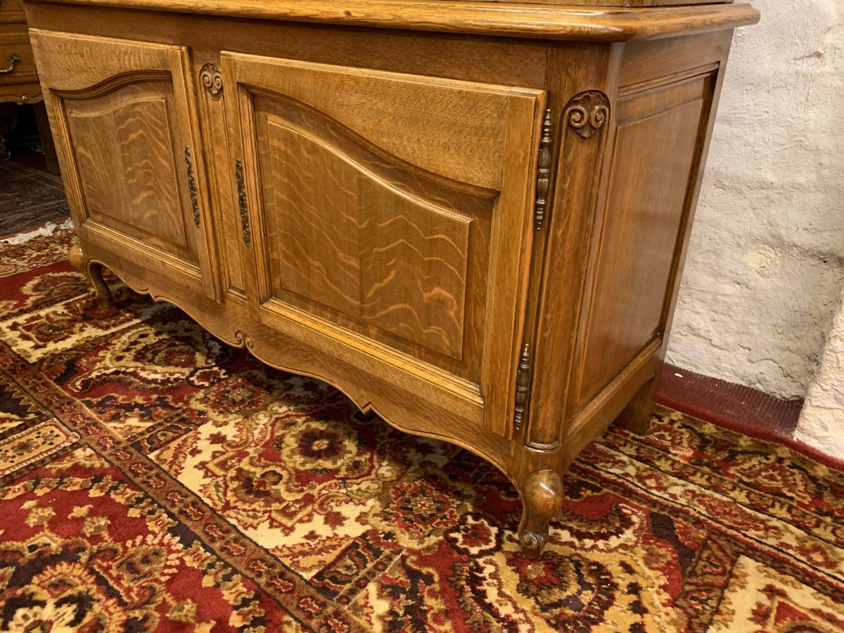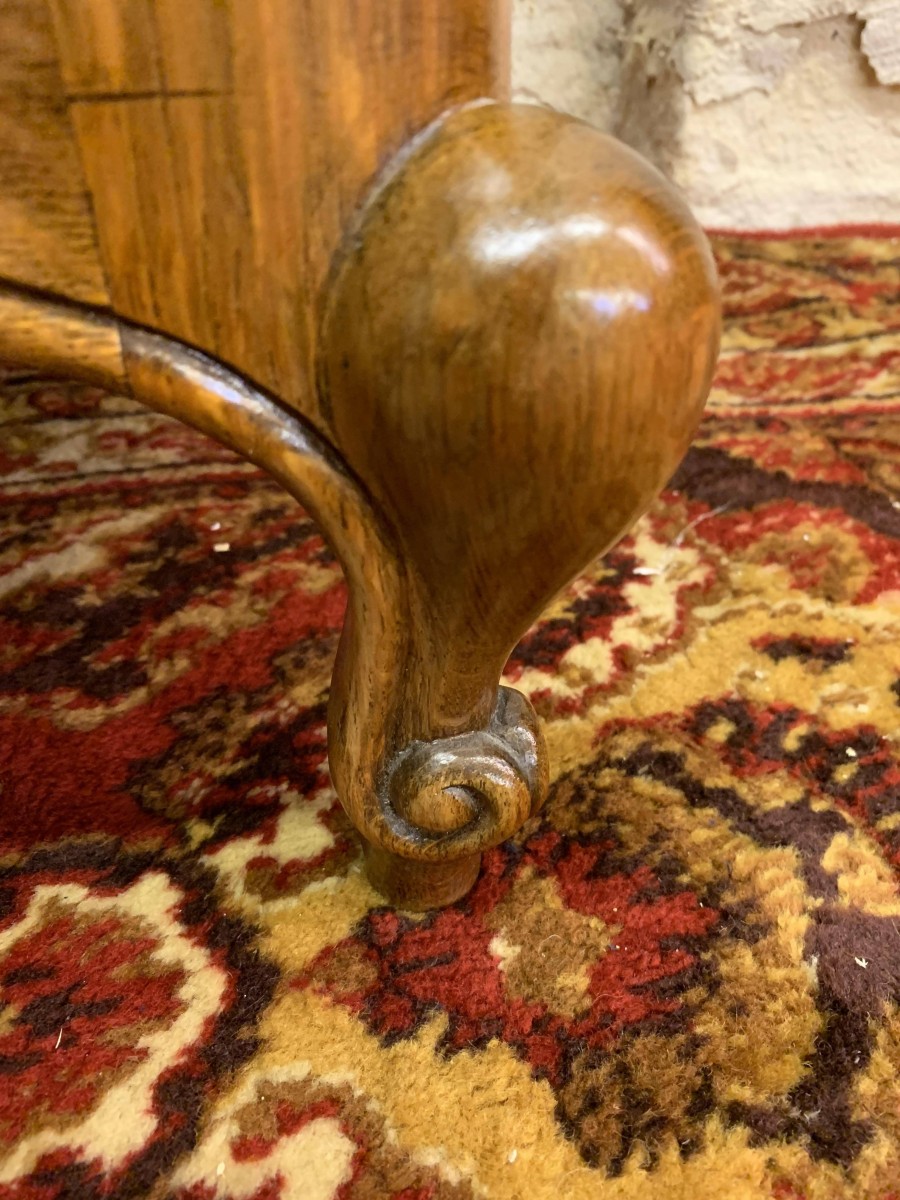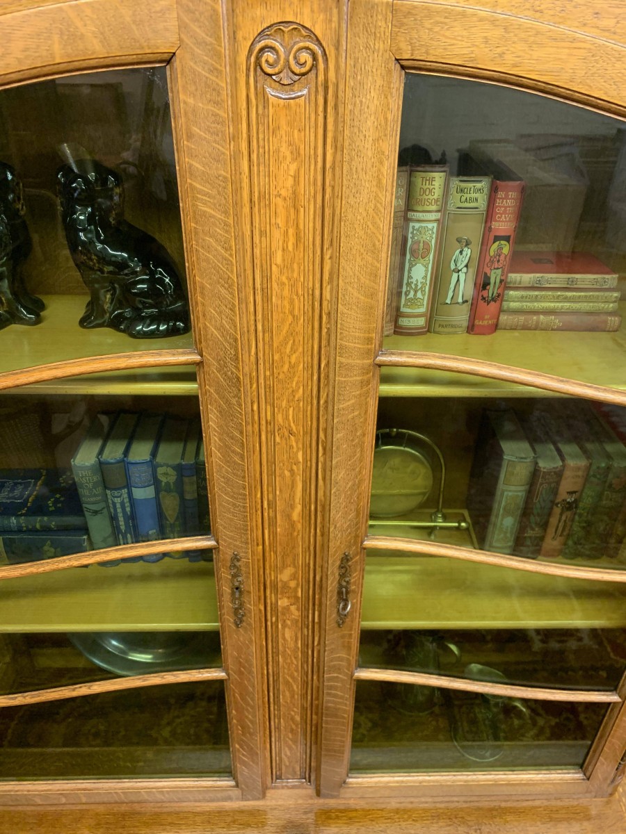 The shaped oversailing top sits above a pair of lockable glazed doors (glazing slightly tinted green), the doors open to reveal two adjustable/removable shelves. Below are a pair of lockable recessed panelled cupboard doors each door having brass hinges and decorative brass escutcheon. The doors open to reveal a removable shelf. Recessed panelled sides – this vitrine sits on two carved cabriole shaped legs to the front.