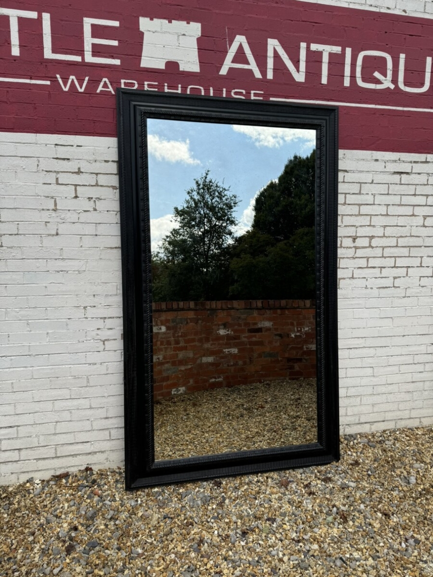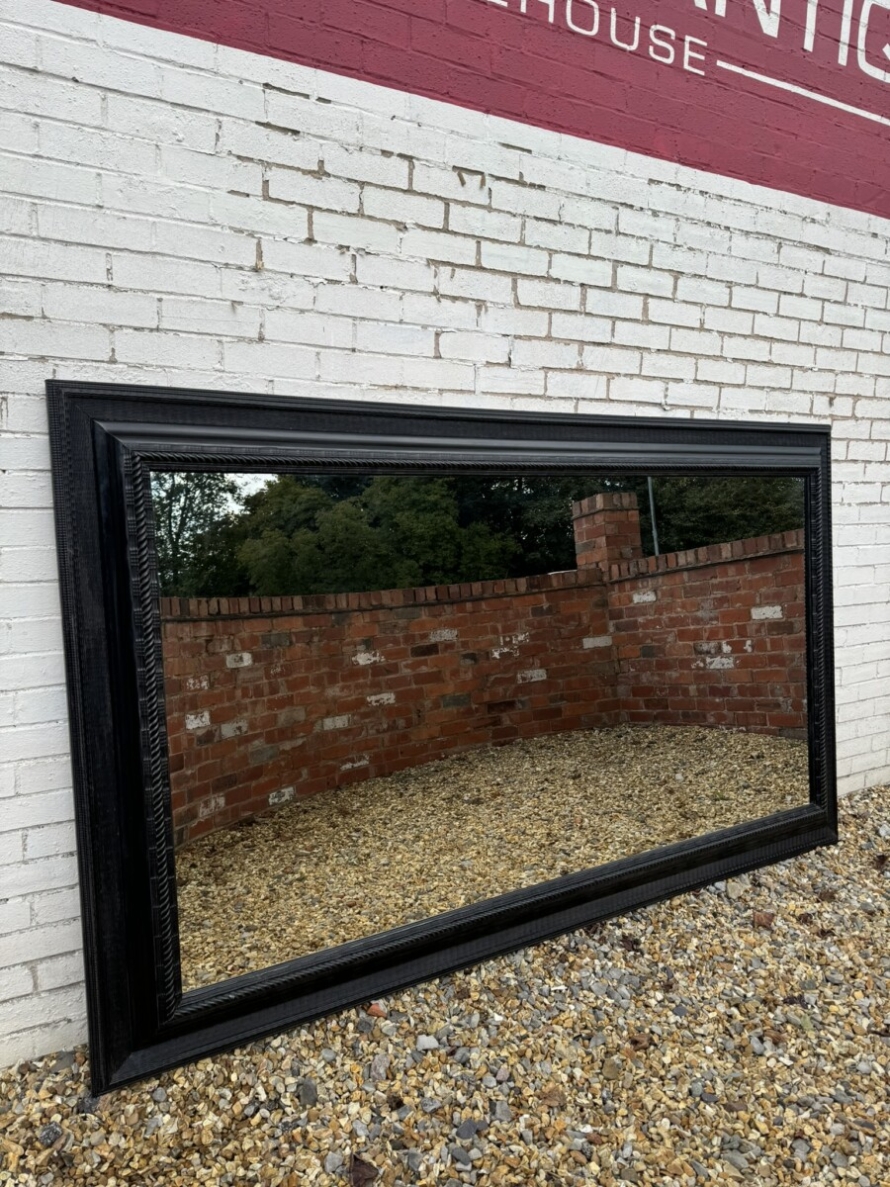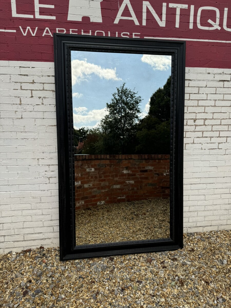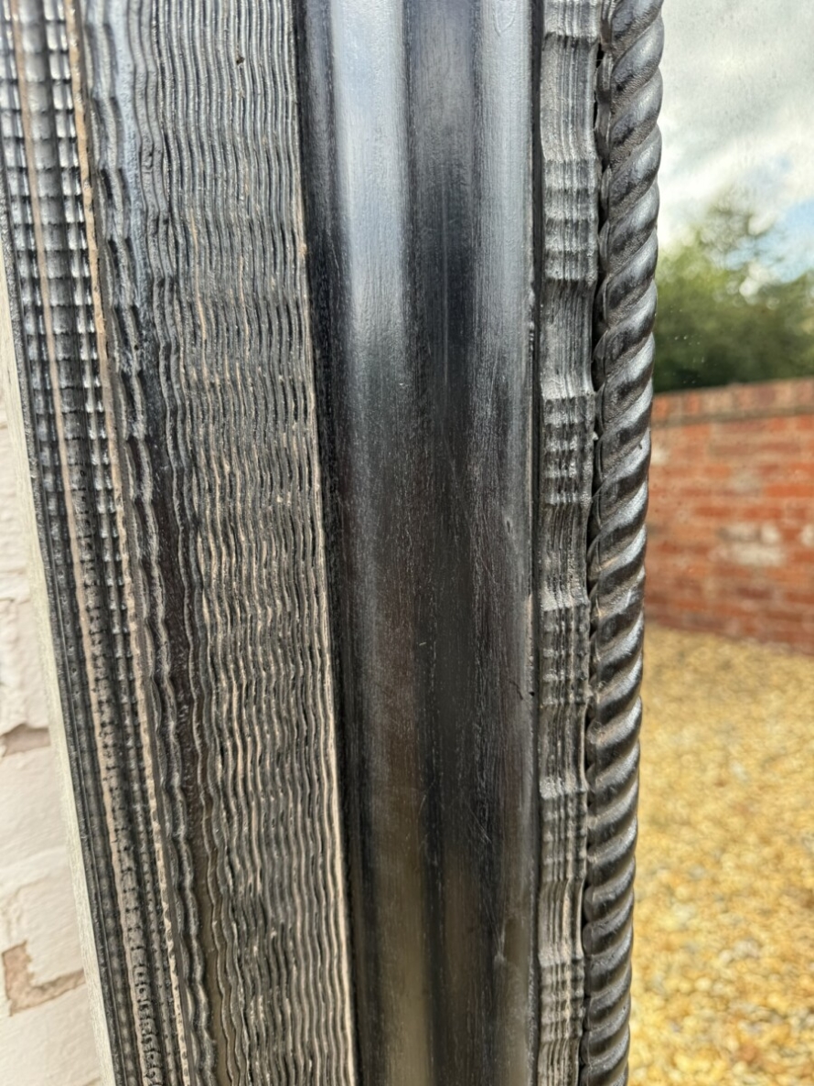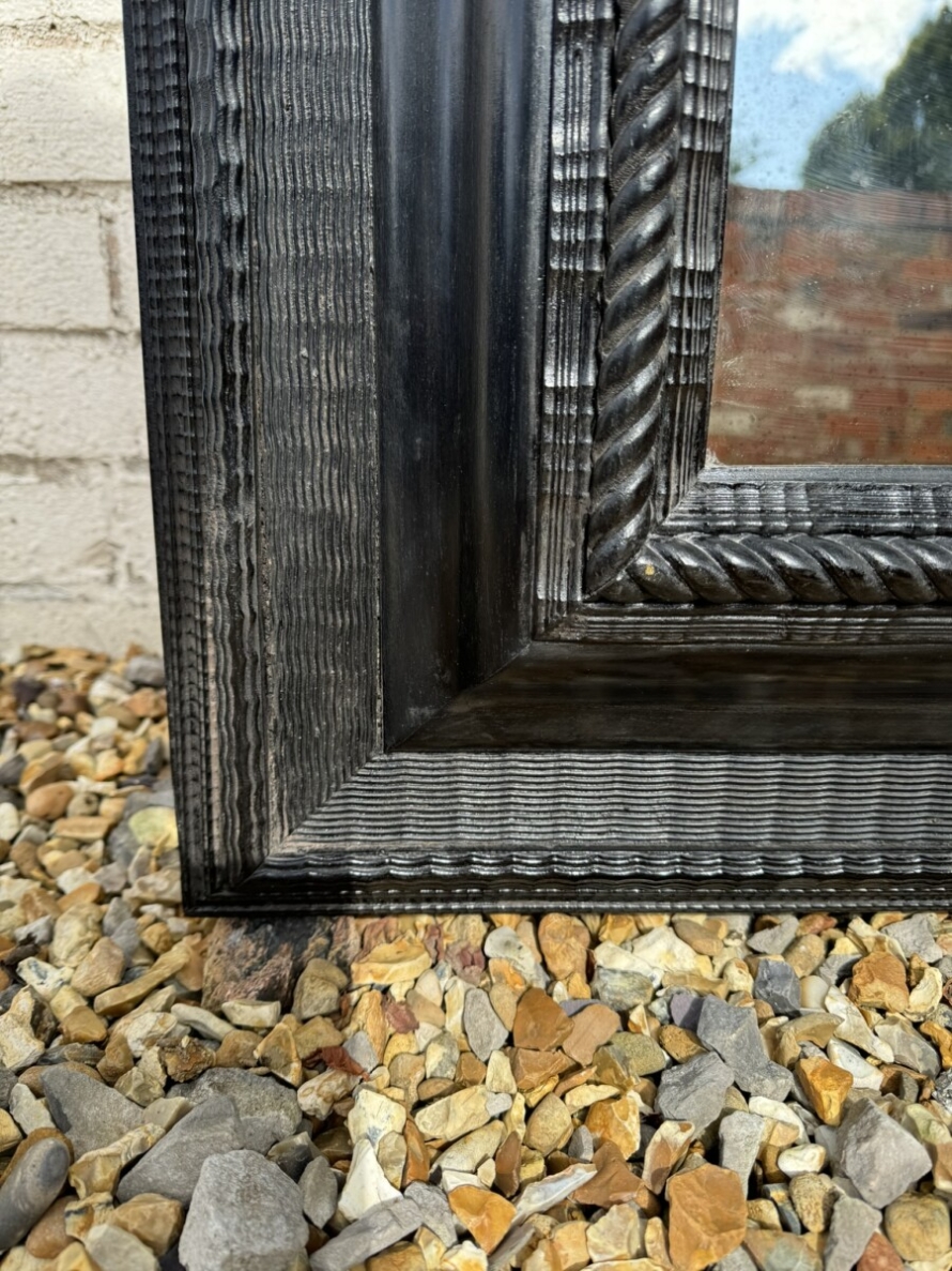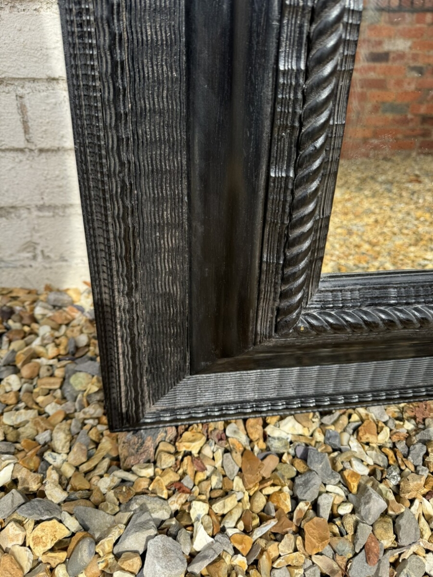 This impressive mirror has a carved black frame. The mirror is foxed to give a fabulous aged appearance.