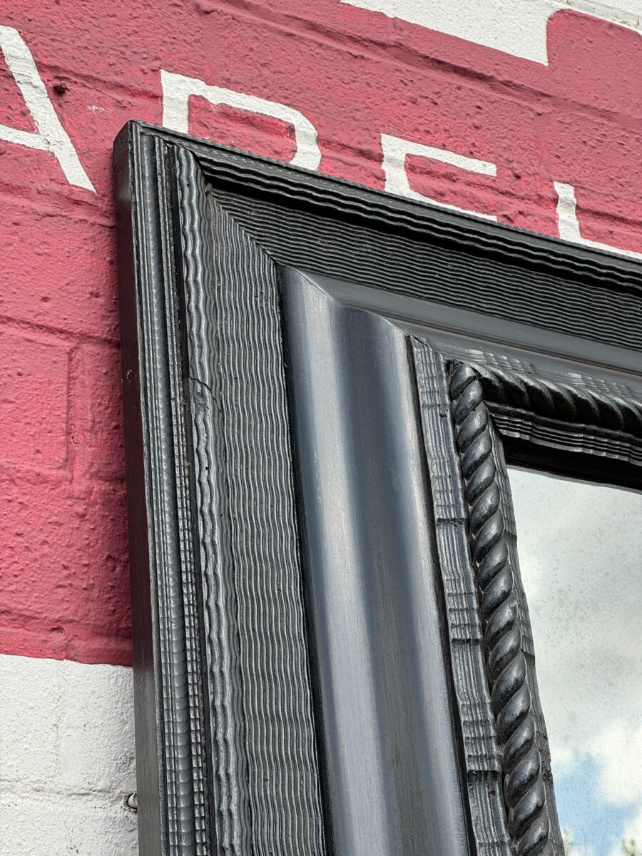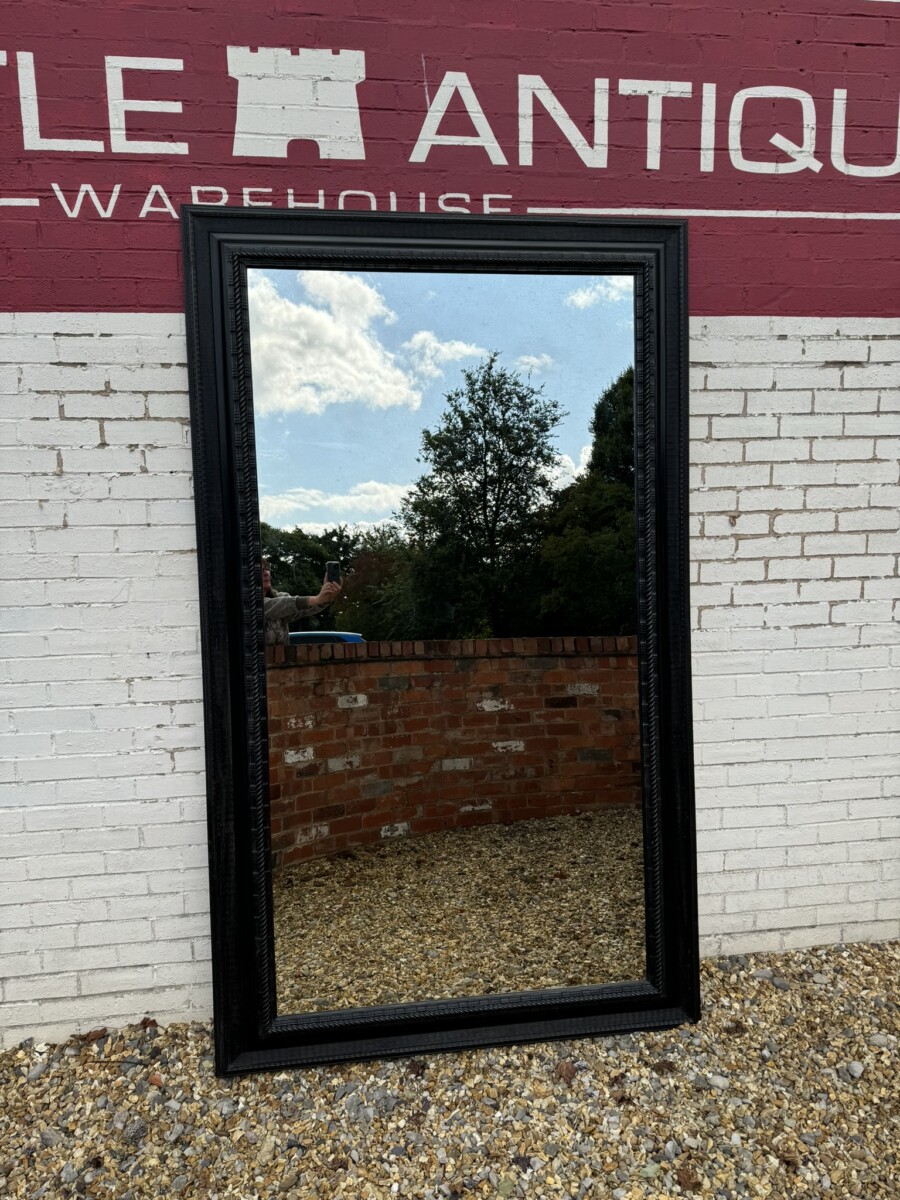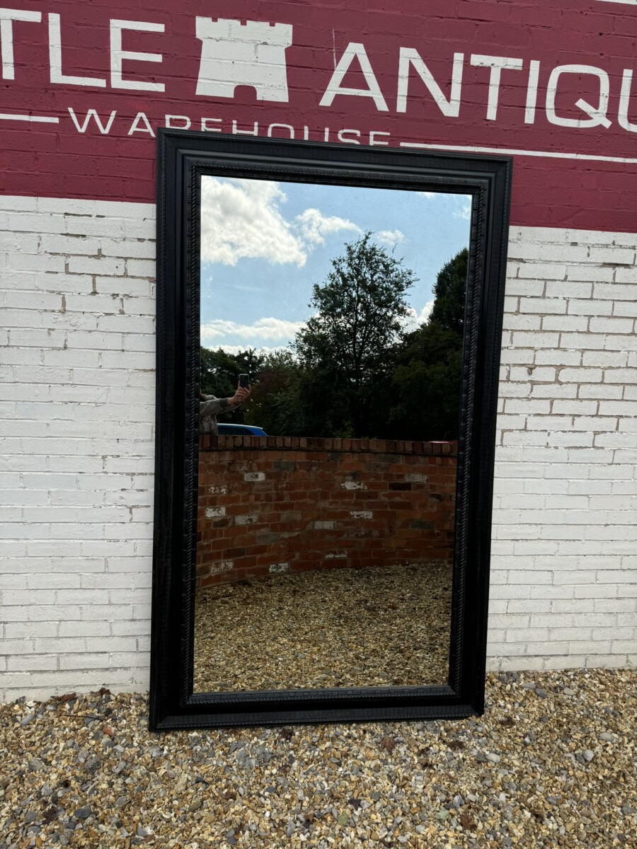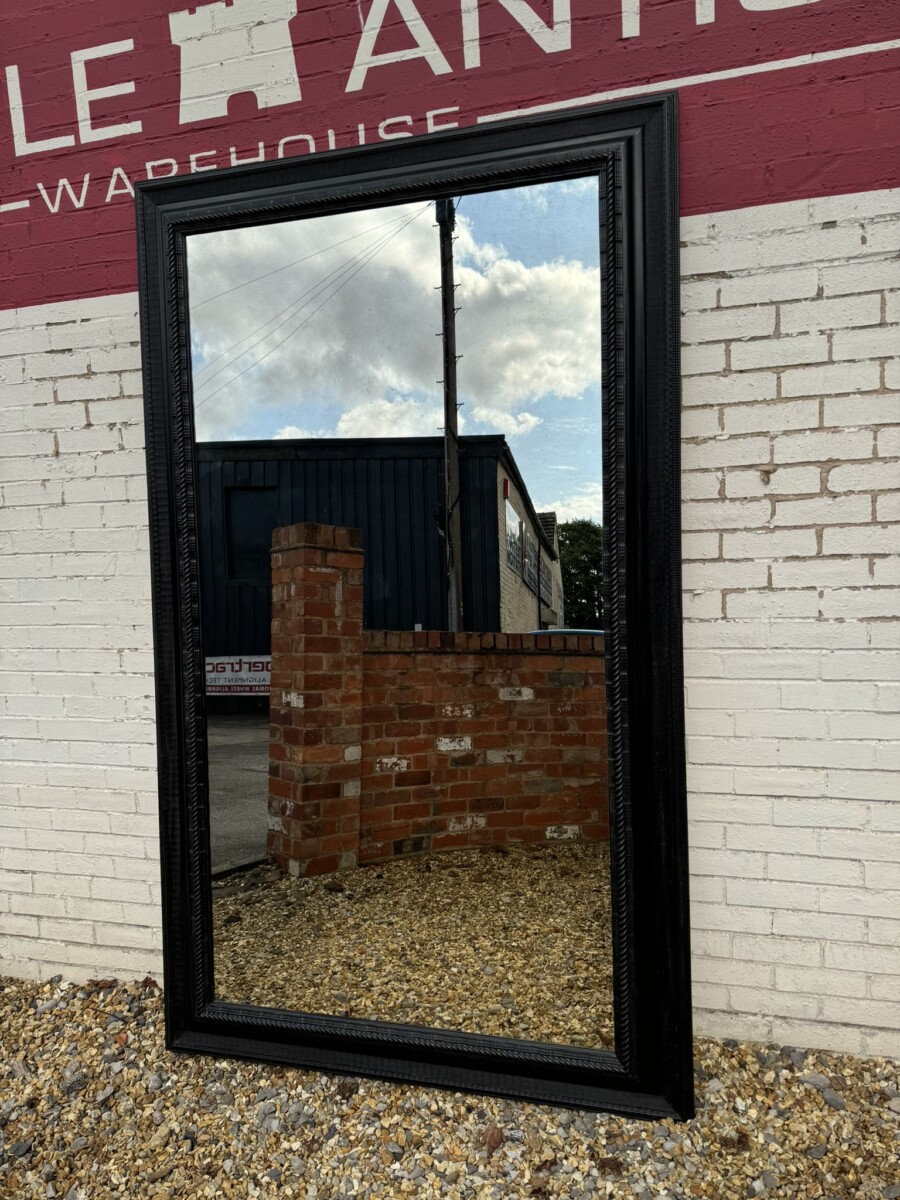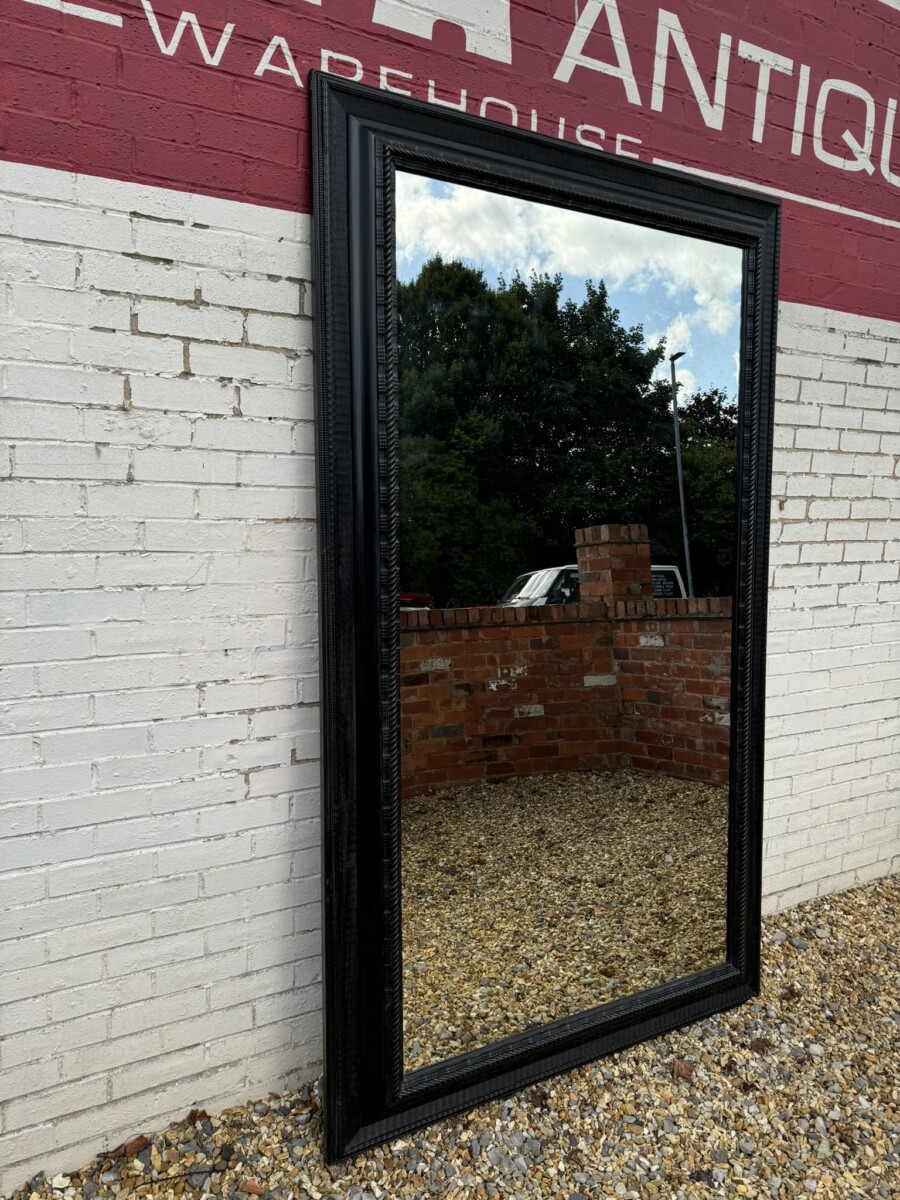 This impressive mirror has a carved black frame. The mirror is foxed to give a fabulous aged appearance.