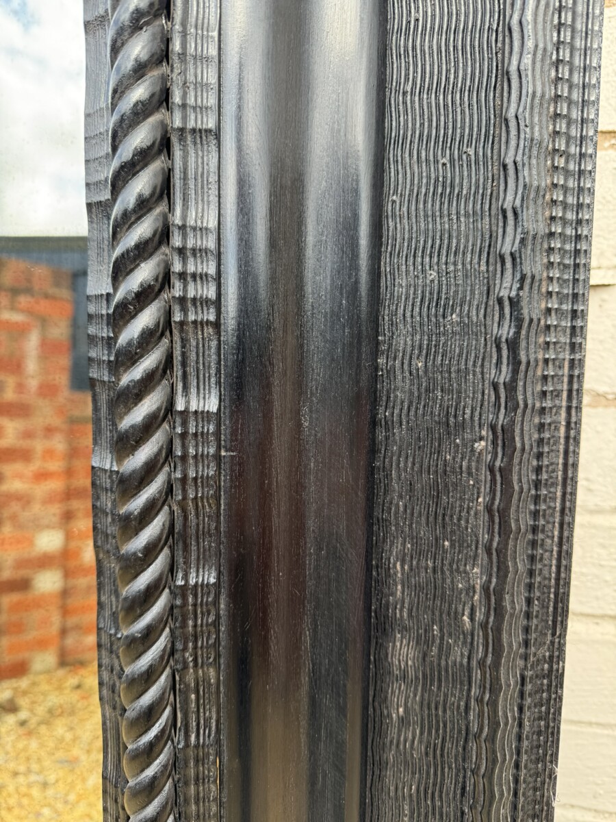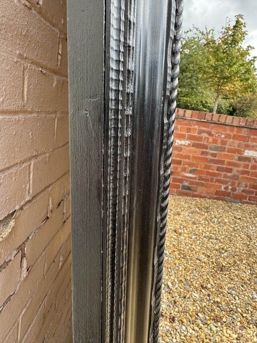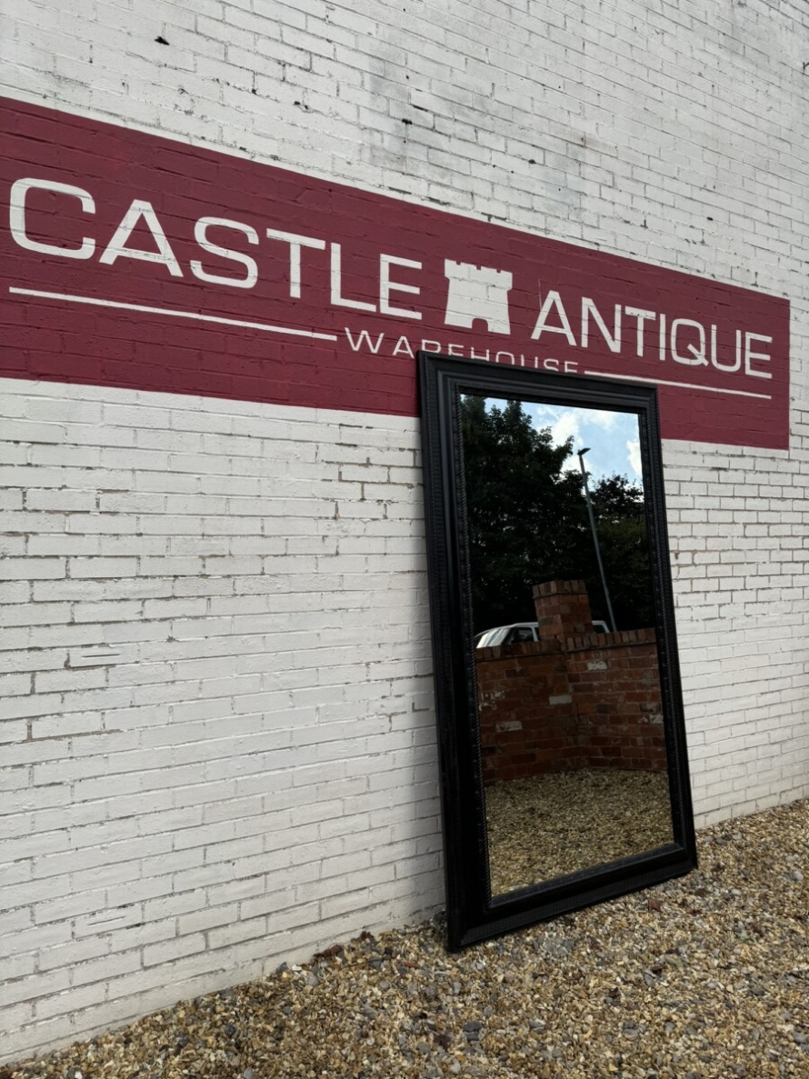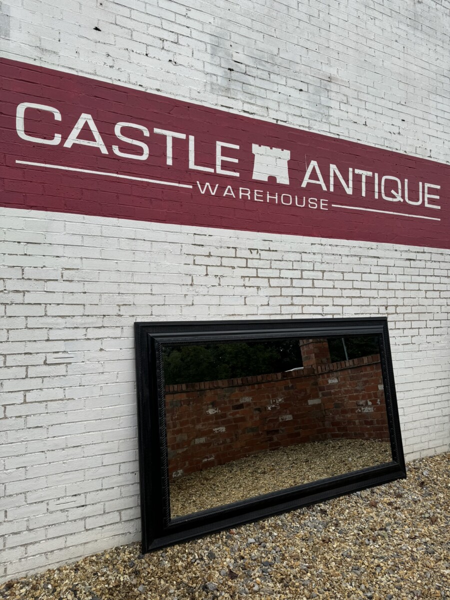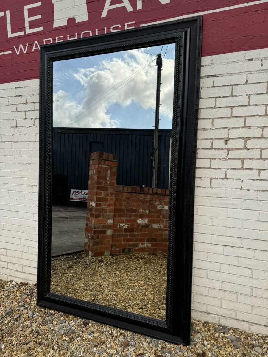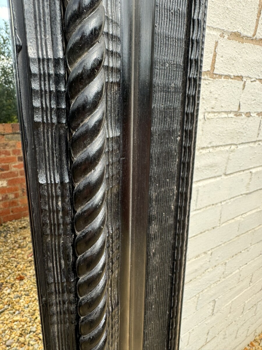 This impressive mirror has a carved black frame. The mirror is foxed to give a fabulous aged appearance.