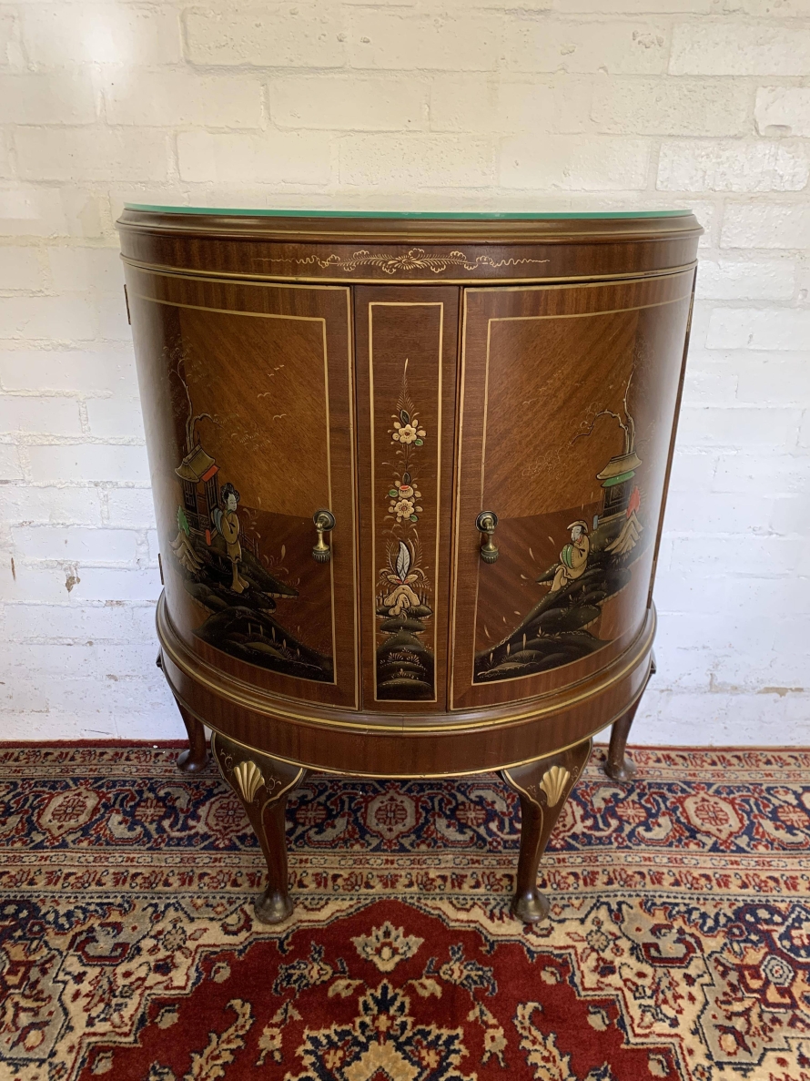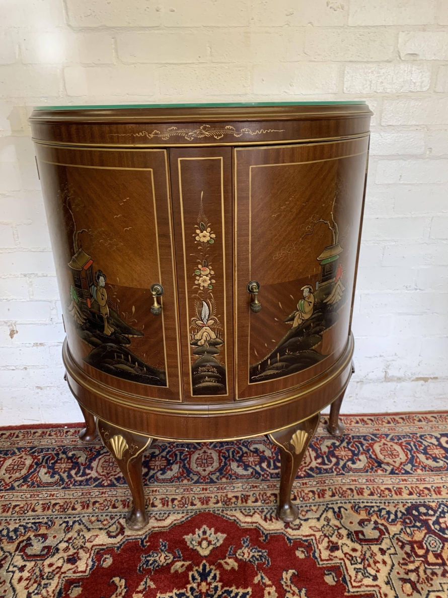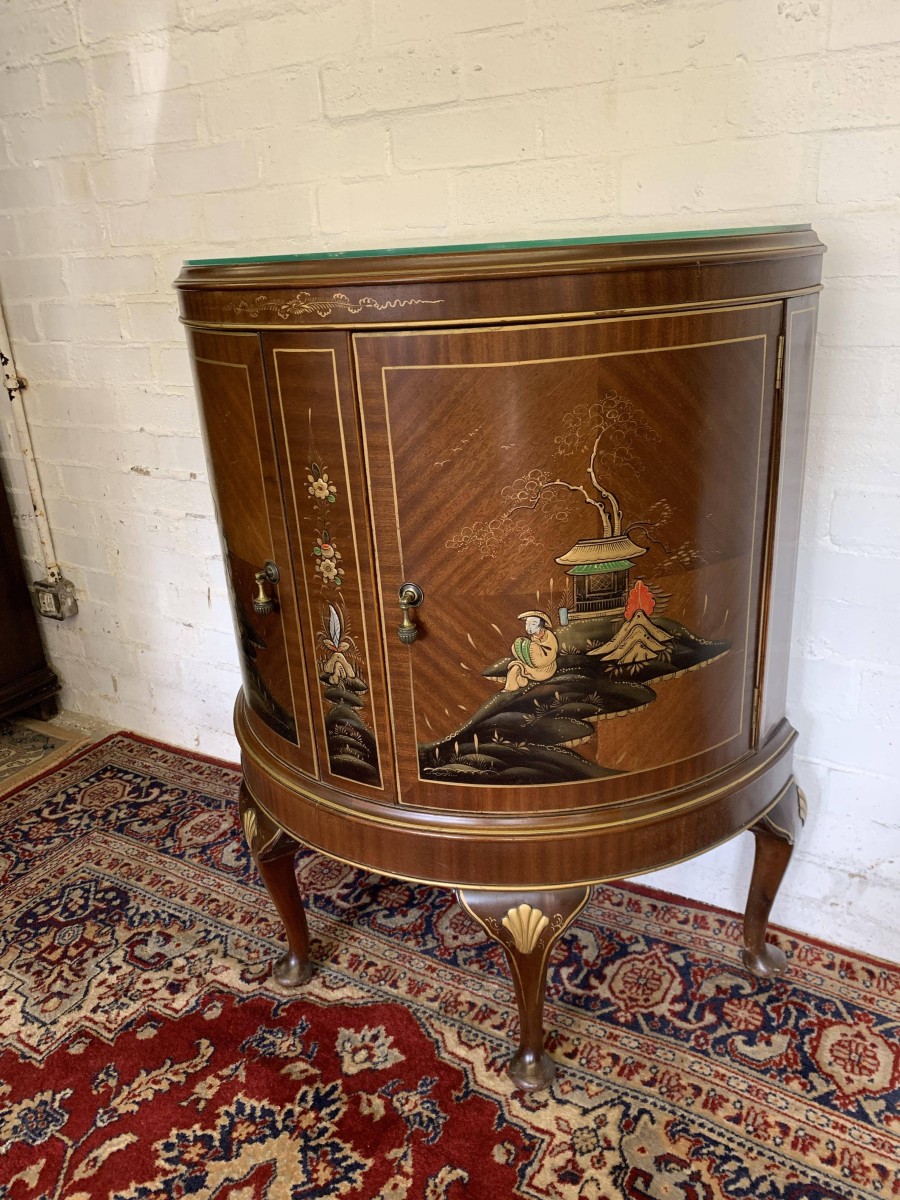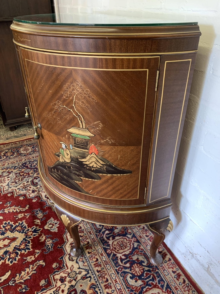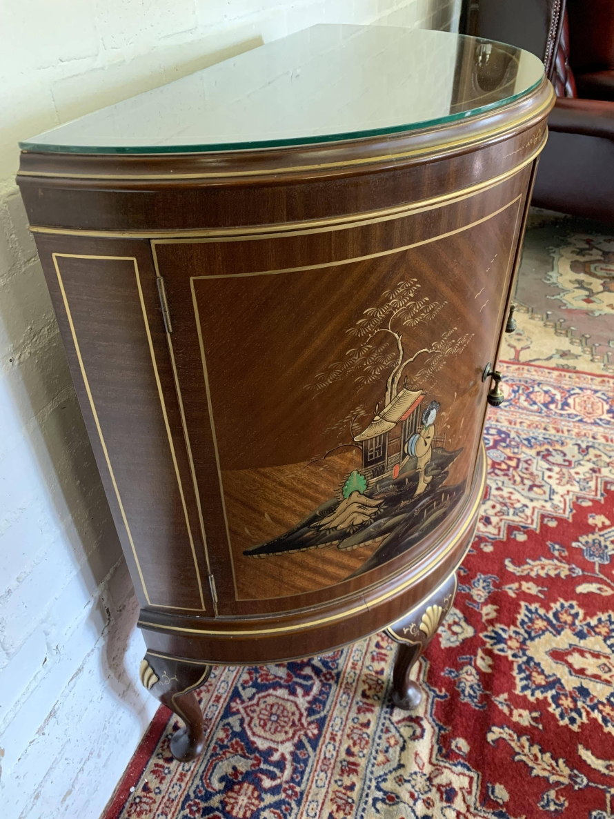 The inlaid top has a glass protector. The cabinet has two doors, each with brass drop handle. The door opens to reveal a glass shelf. Smothered in gorgeous chinoiserie decoration this fabulous demi lune side cabinet stands on four cabriole shaped legs.