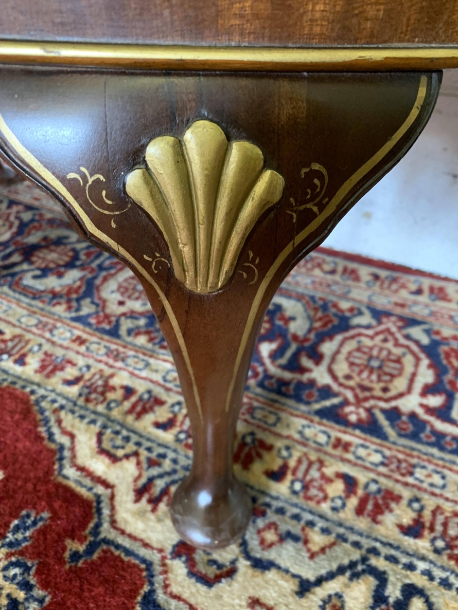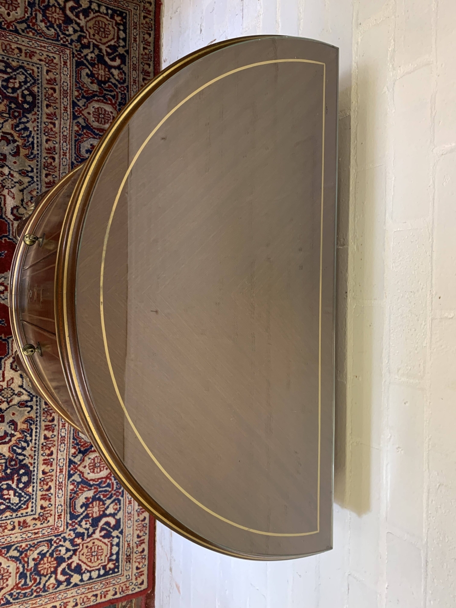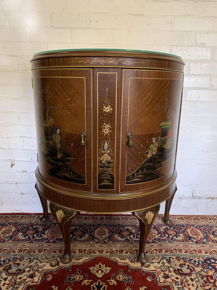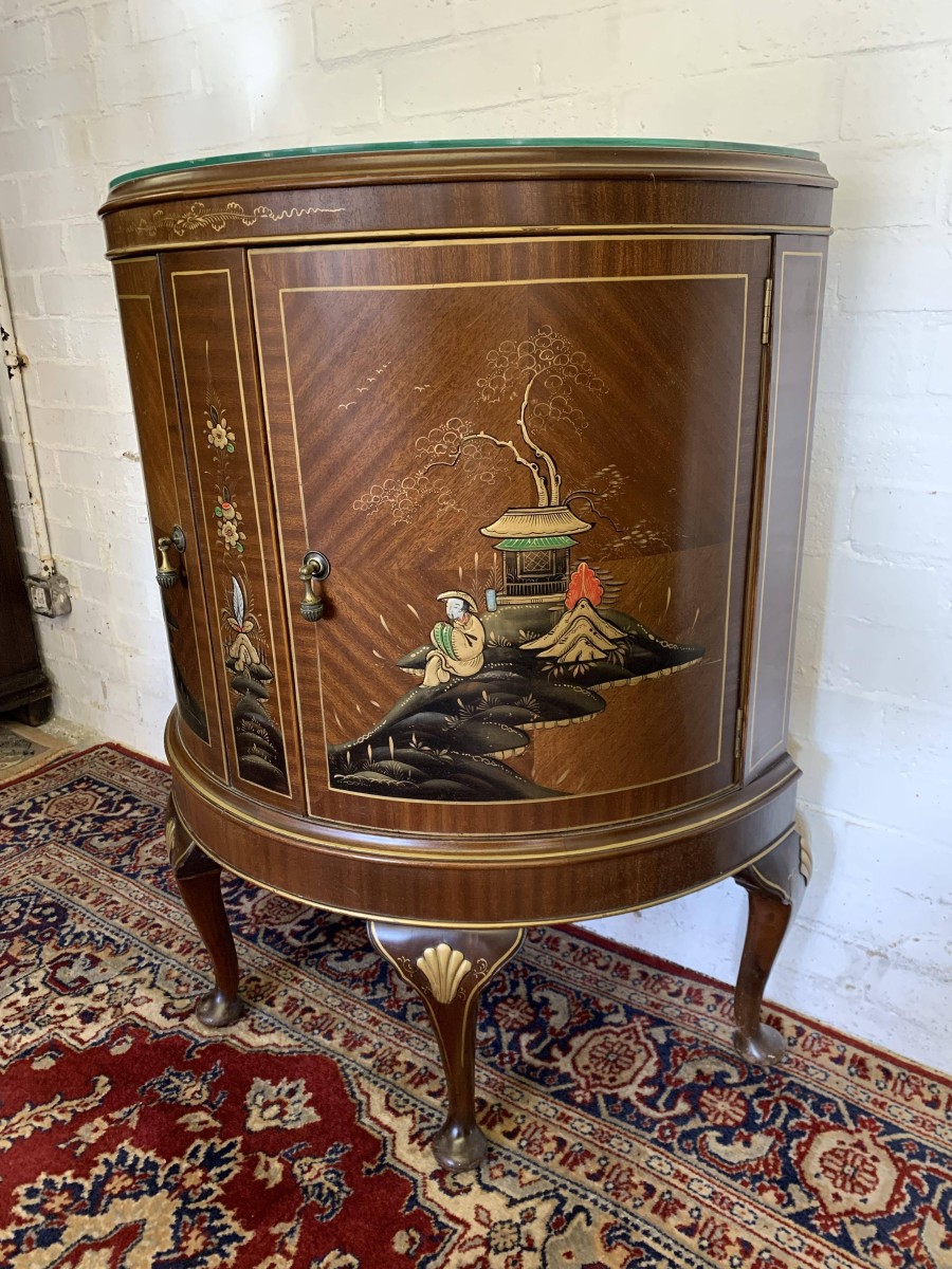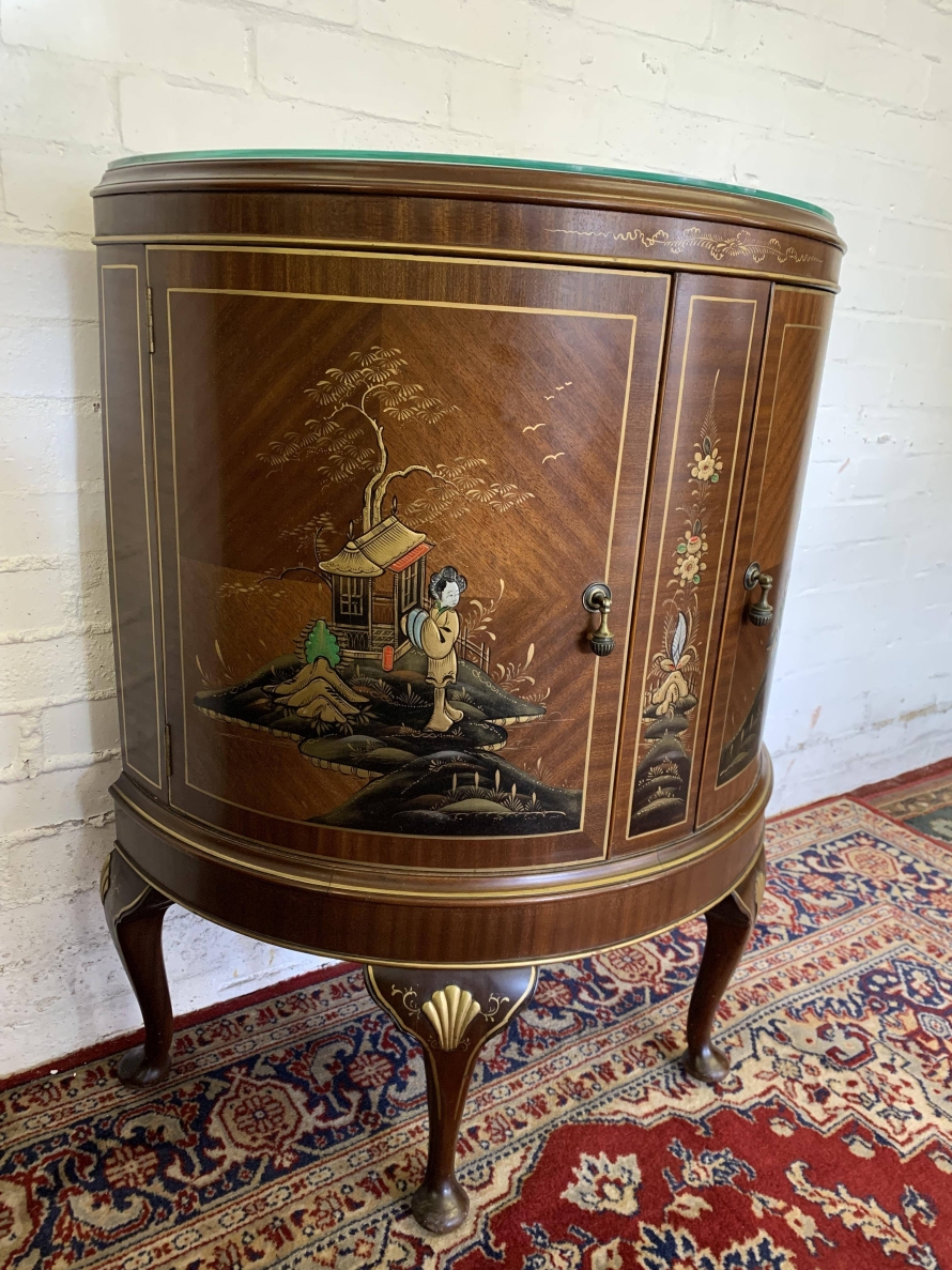 The inlaid top has a glass protector. The cabinet has two doors, each with brass drop handle. The door opens to reveal a glass shelf. Smothered in gorgeous chinoiserie decoration this fabulous demi lune side cabinet stands on four cabriole shaped legs.