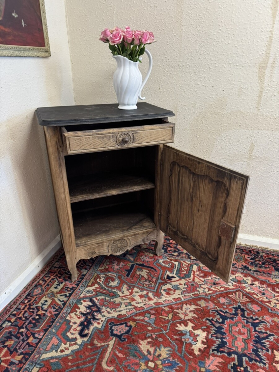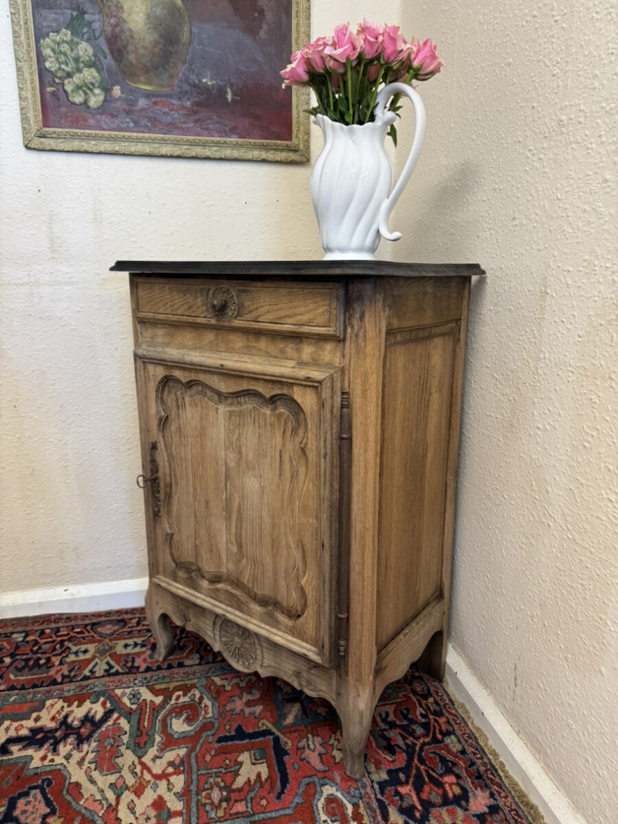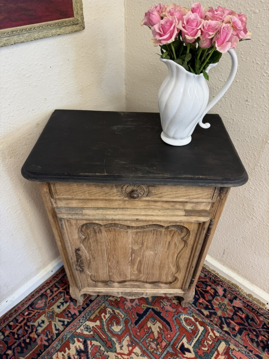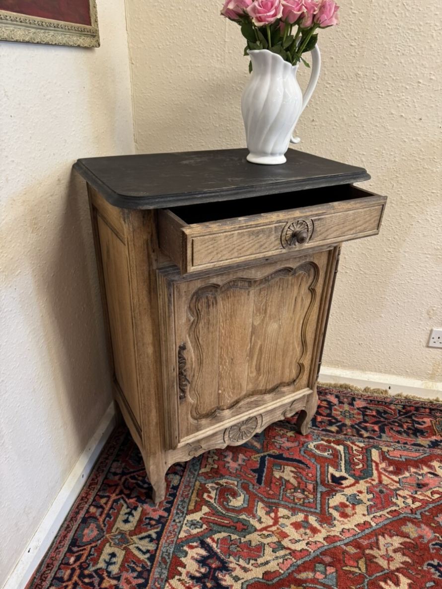 The cupboard dates circa 1860. The black painted top sits above a drawer, the drawer having a turned handle and carved decoration. Below is a lockable shaped recessed panelled door, the door having an iron hinge, escutcheon and key. The door opens to reveal a removable shelf. Recessed panelled sides, shaped skirt with central carving and standing on two shaped legs to the front.