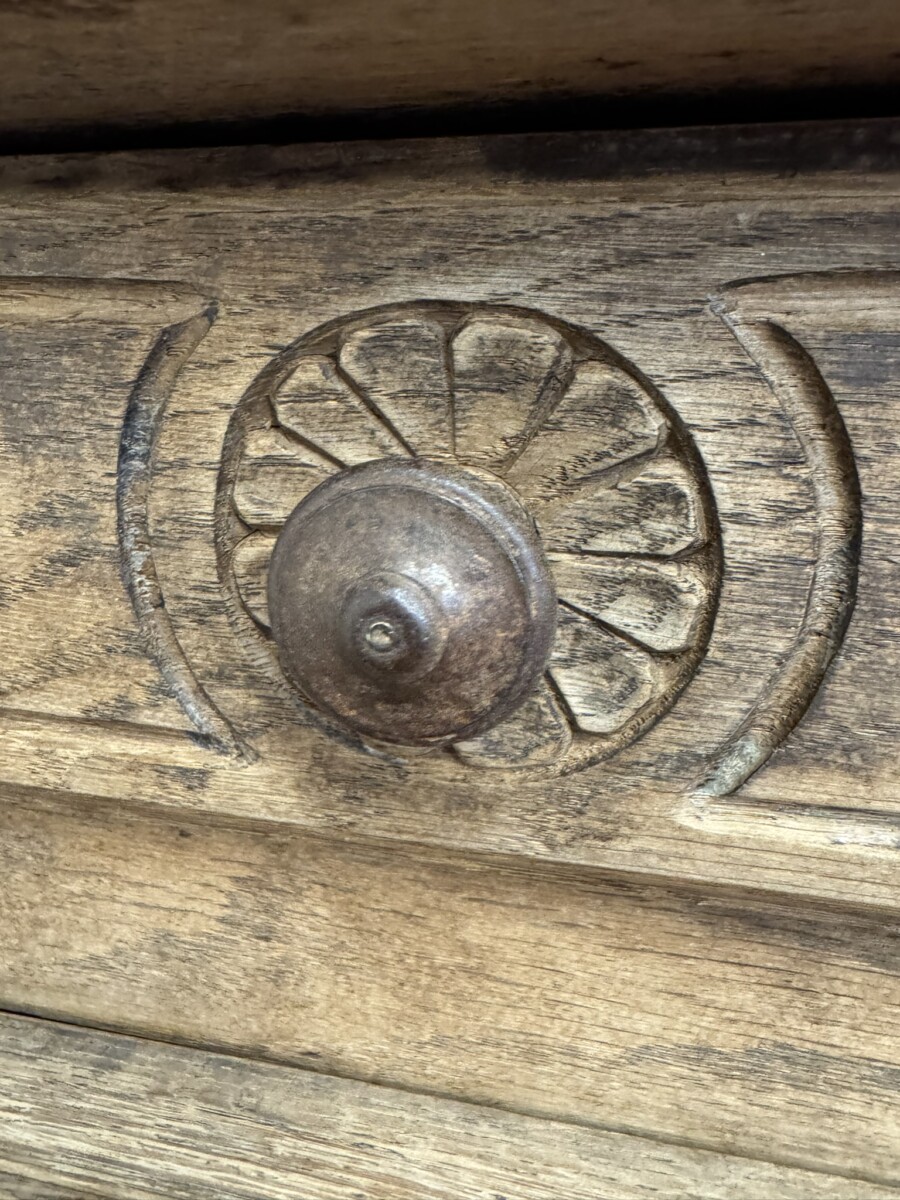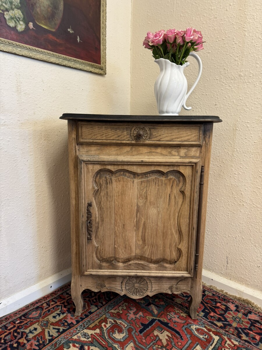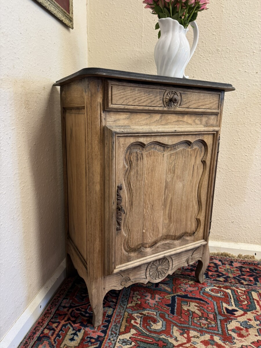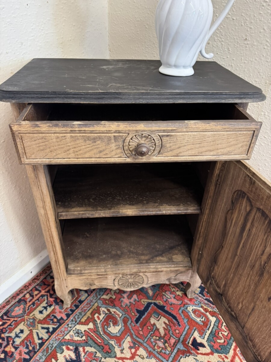 The cupboard dates circa 1860. The black painted top sits above a drawer, the drawer having a turned handle and carved decoration. Below is a lockable shaped recessed panelled door, the door having an iron hinge, escutcheon and key. The door opens to reveal a removable shelf. Recessed panelled sides, shaped skirt with central carving and standing on two shaped legs to the front.