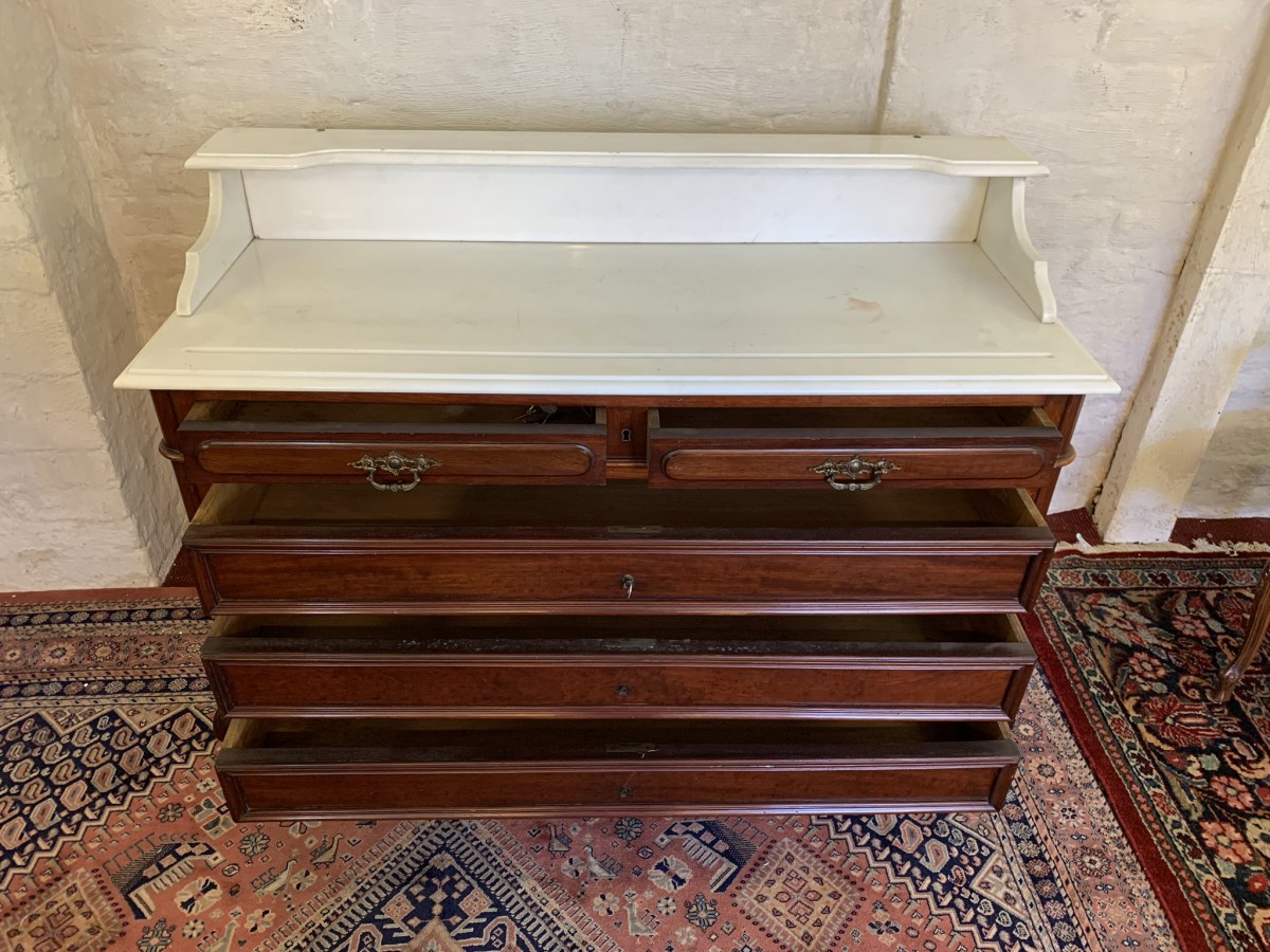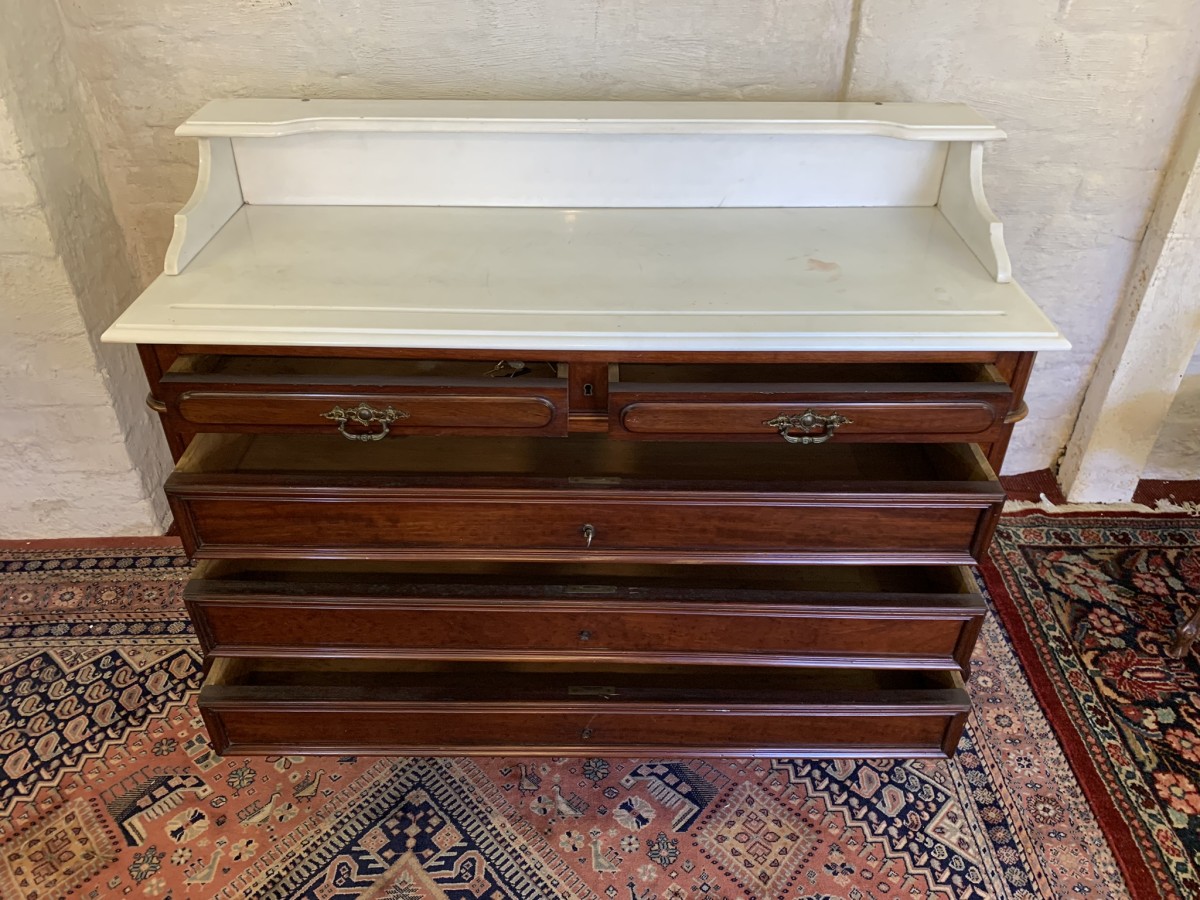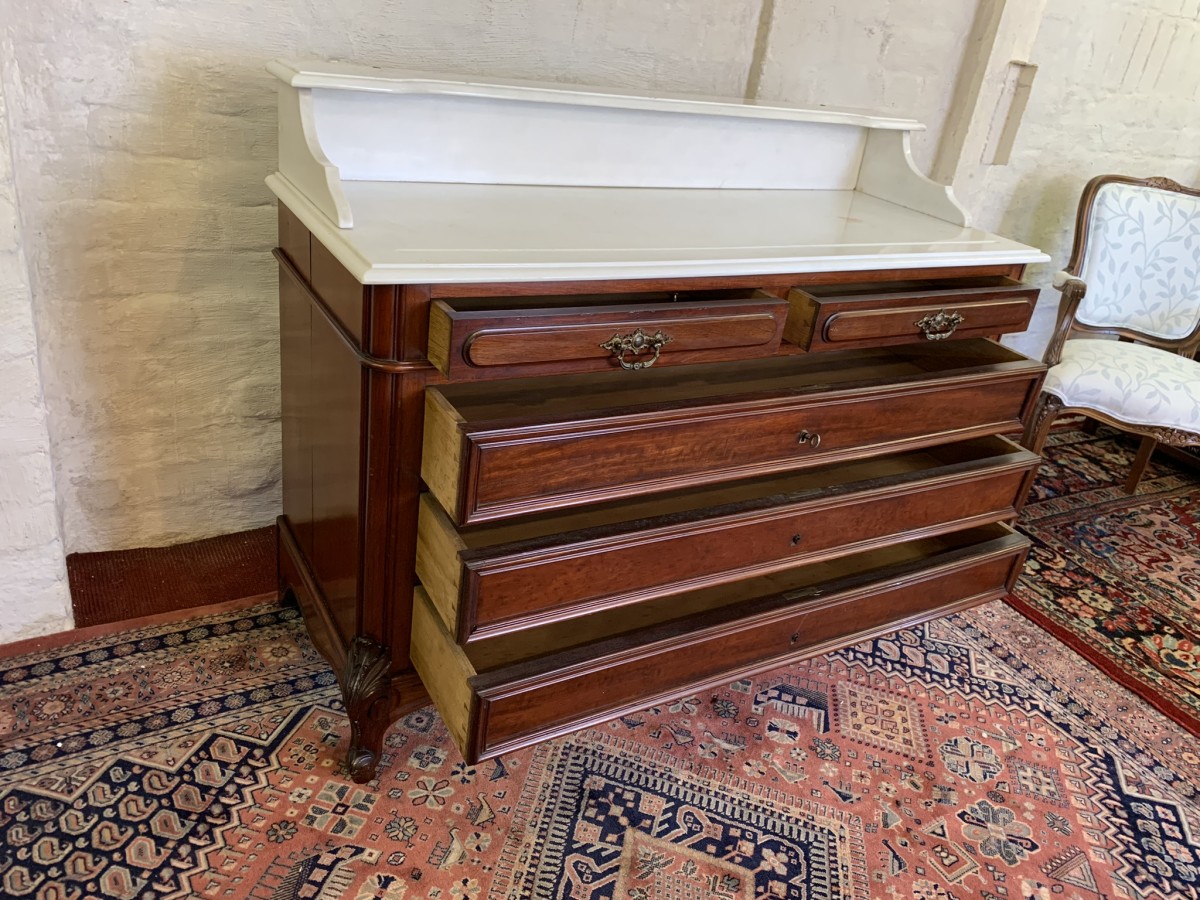 Made in fabulous mahogany the commode dates circa 1885. The marble top has a shaped shelf, below are two short drawers, each drawer having an ornate brass handle which sit above three lockable long drawers. This fine quality commode sits on two carved cabriole shaped legs to the front.