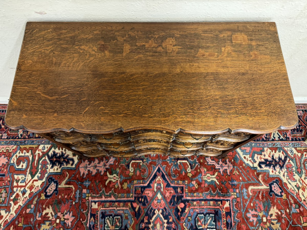 This fantastic French commode dates circa 1910 and is in excelent condition. The shaped oversailing top sits above three ornately carved shaped drawers, each drawer having a pair of carved handles. Recessed panelled sides shaped skirt which is elaborately carved to the front this; exceptional French commode stands on two carved cabriole shaped legs to the front.