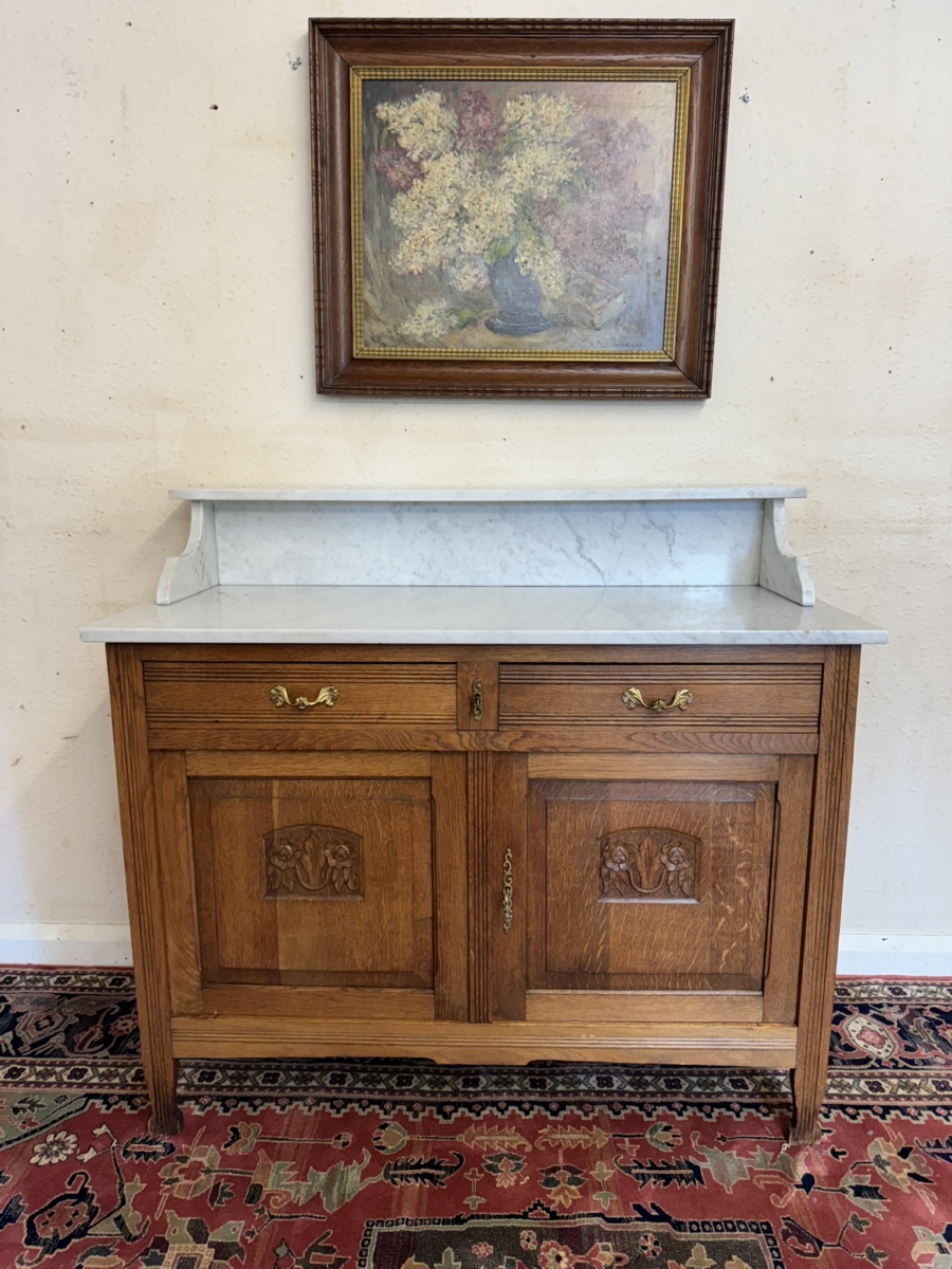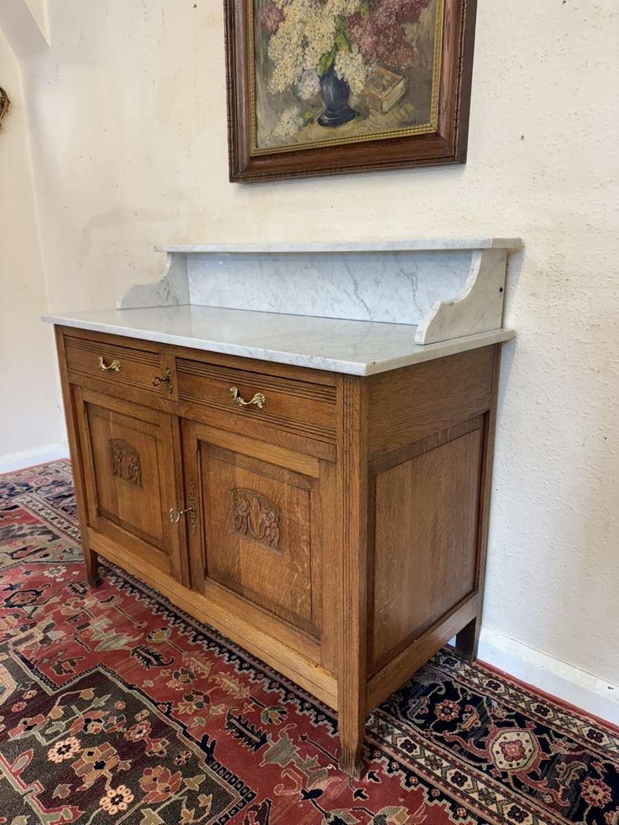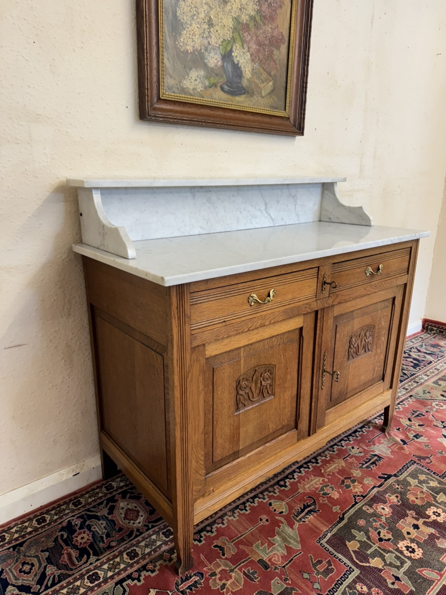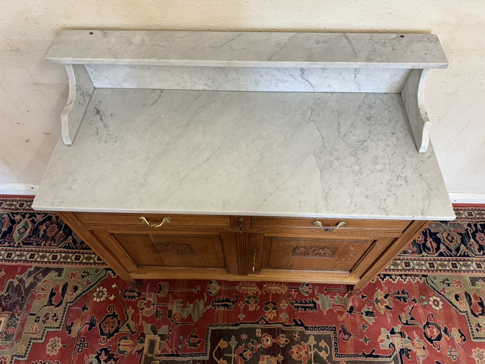 This fine piece dates circa 1900. Cararra white marble top with shelf sits above two carved drawers, each drawer having an ornate brass handle, below are a pair of carved recessed panelled lockable doors, the doors open to reveal a removable shelf. Recessed panelled sides and standing on reeded legs with shaped feet.