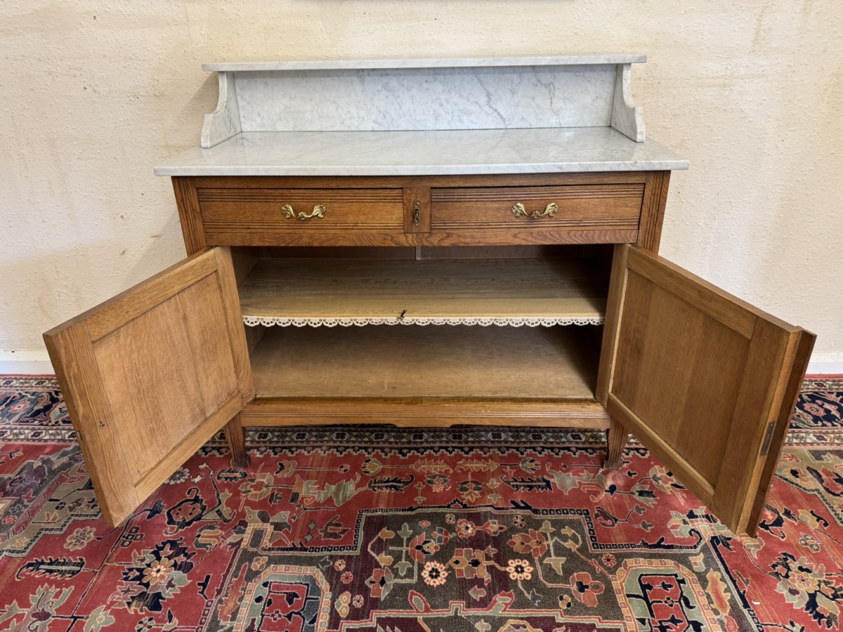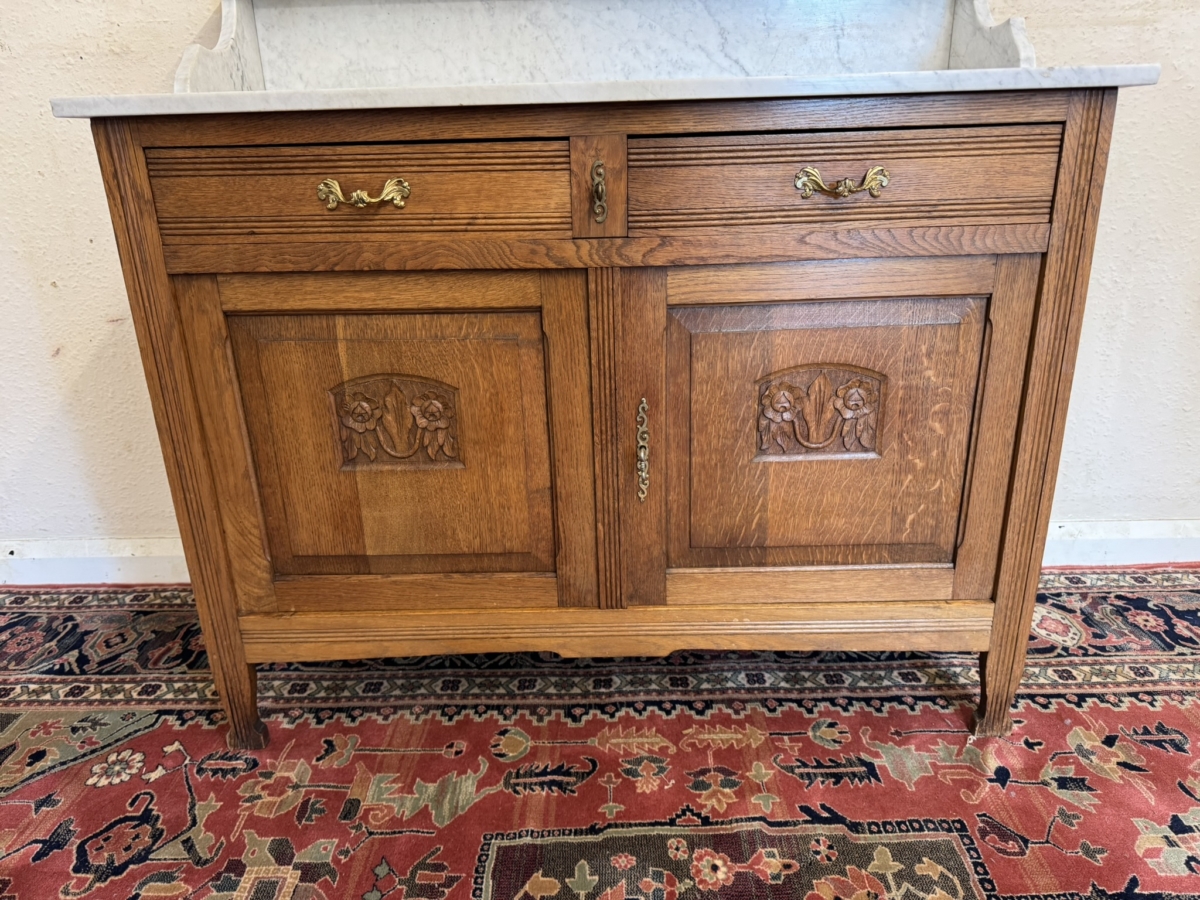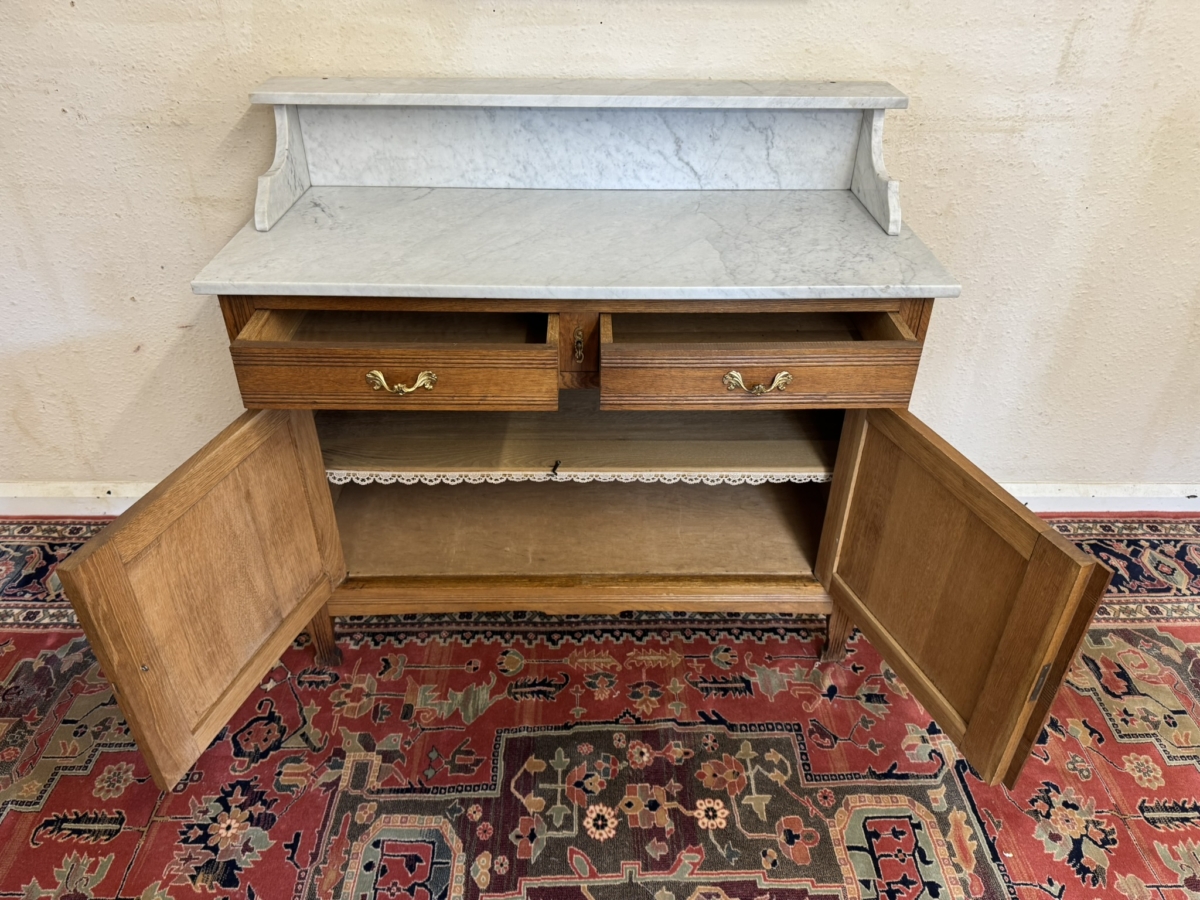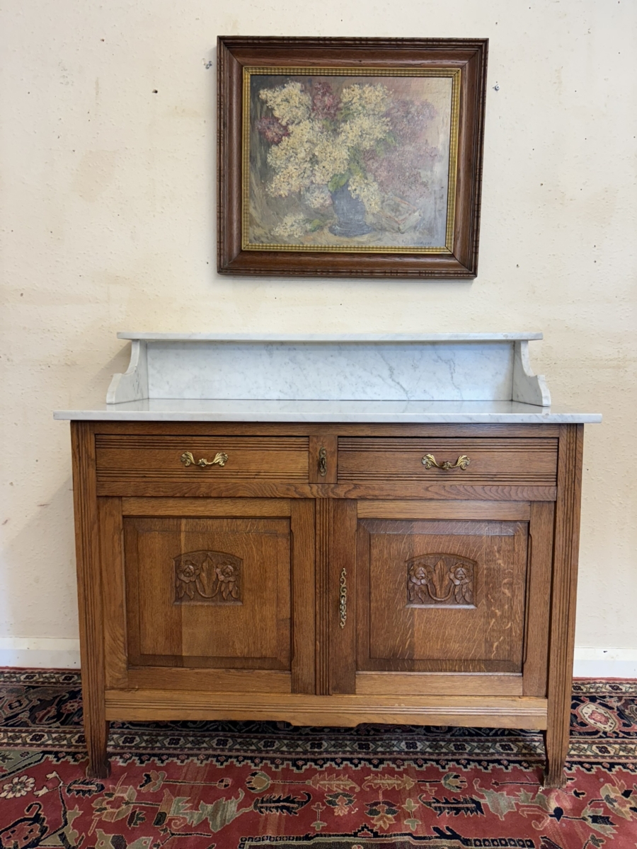 This fine piece dates circa 1900. Cararra white marble top with shelf sits above two carved drawers, each drawer having an ornate brass handle, below are a pair of carved recessed panelled lockable doors, the doors open to reveal a removable shelf. Recessed panelled sides and standing on reeded legs with shaped feet.