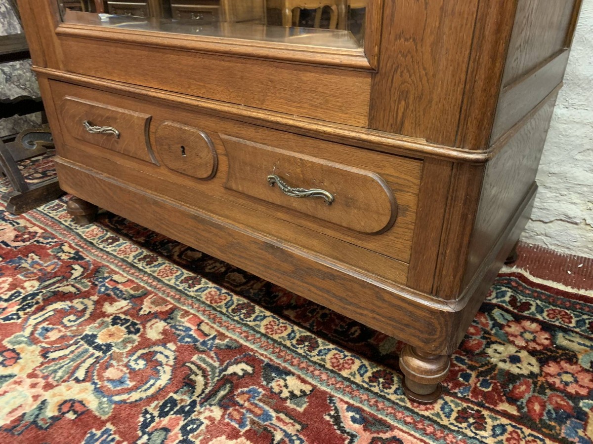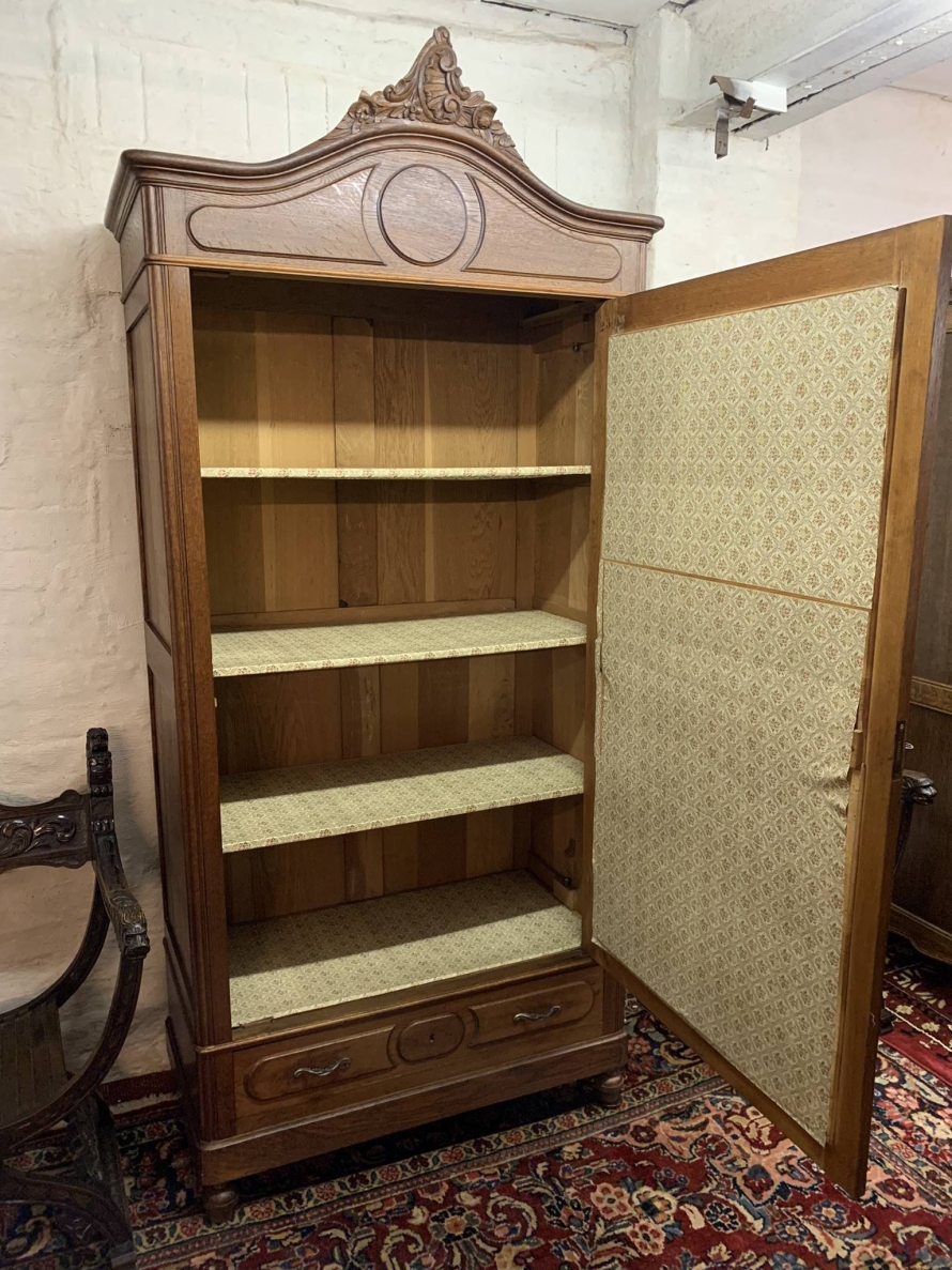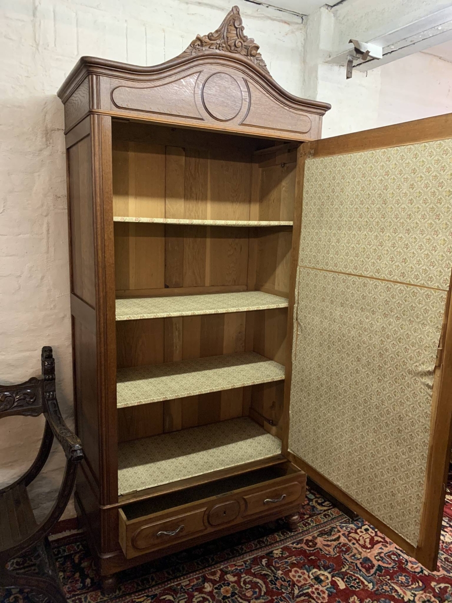 The shaped oversailing top rises up to a central decorative carving. Below is a lockable full length bevel edged mirrored door. The door opens to reveal three removable shelves. Below is a carved drawer, the drawer having a pair of ornate handles. Recessed panelled sides this fabulous armoire which dates circa 1880 sits on two turned feet to the front.
