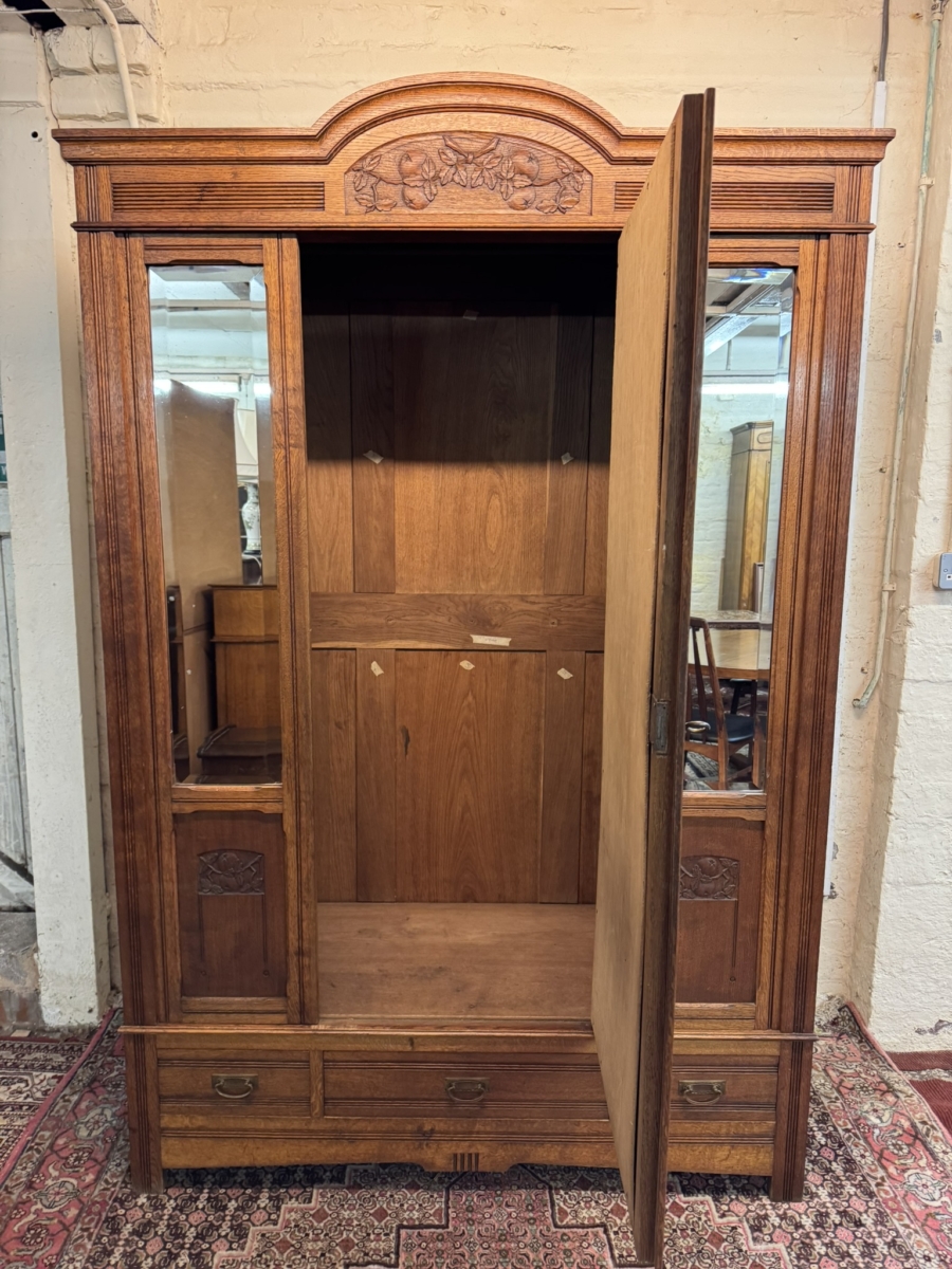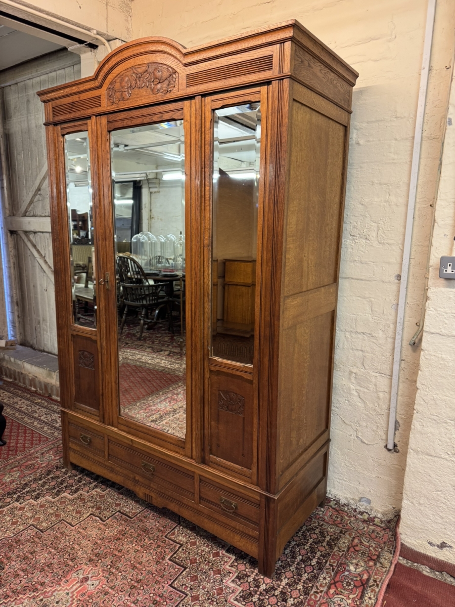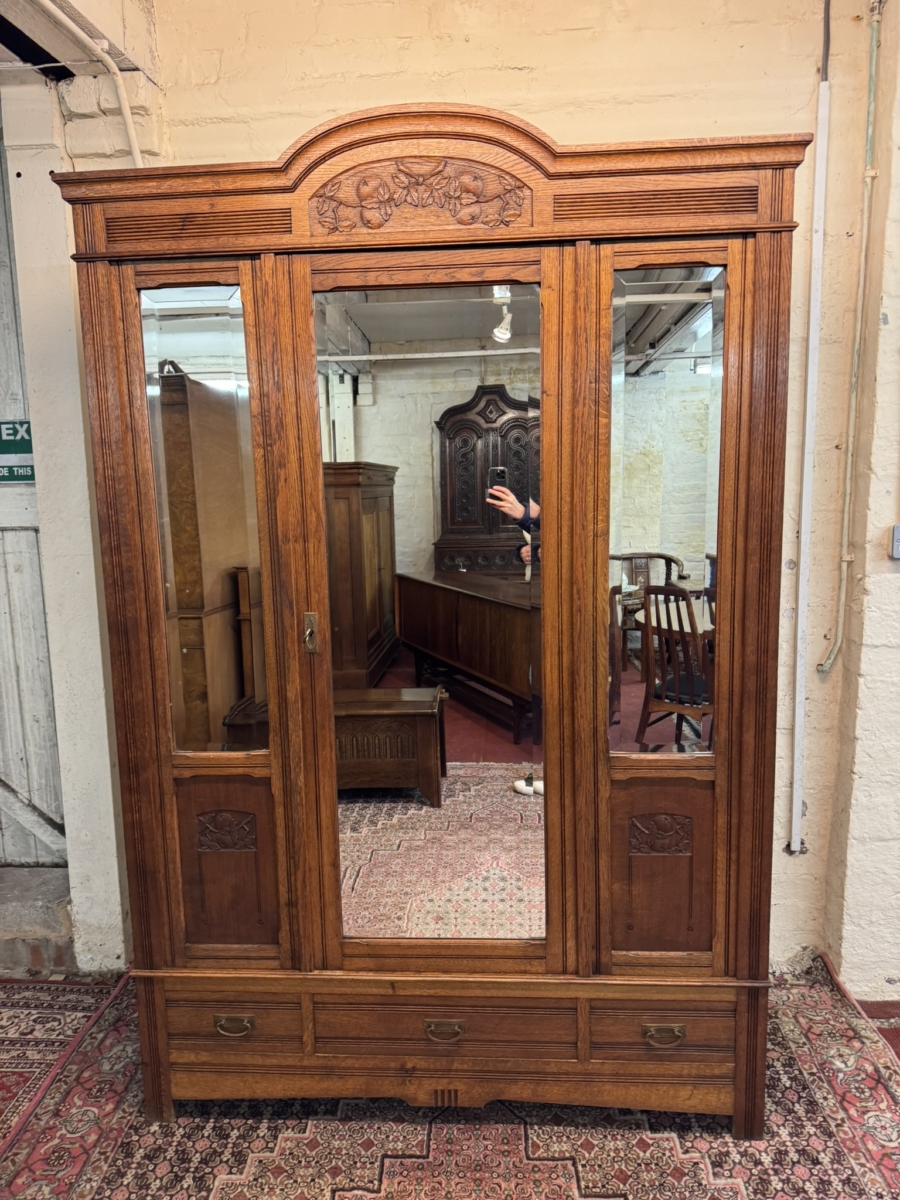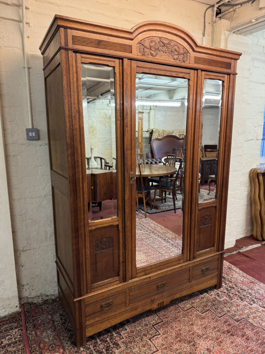 The arched over sailing top has central decorative carving, below is a central bevel edged full length mirror door, the door opens to reveal a hanging rail. The door is flanked by a pair of fixed mirrored and glazed panels, below are three handy storage drawers. Recessed panelled sides and standing on block feet. Please note this armoire completely splits down for easy transportation and delivery into any home.