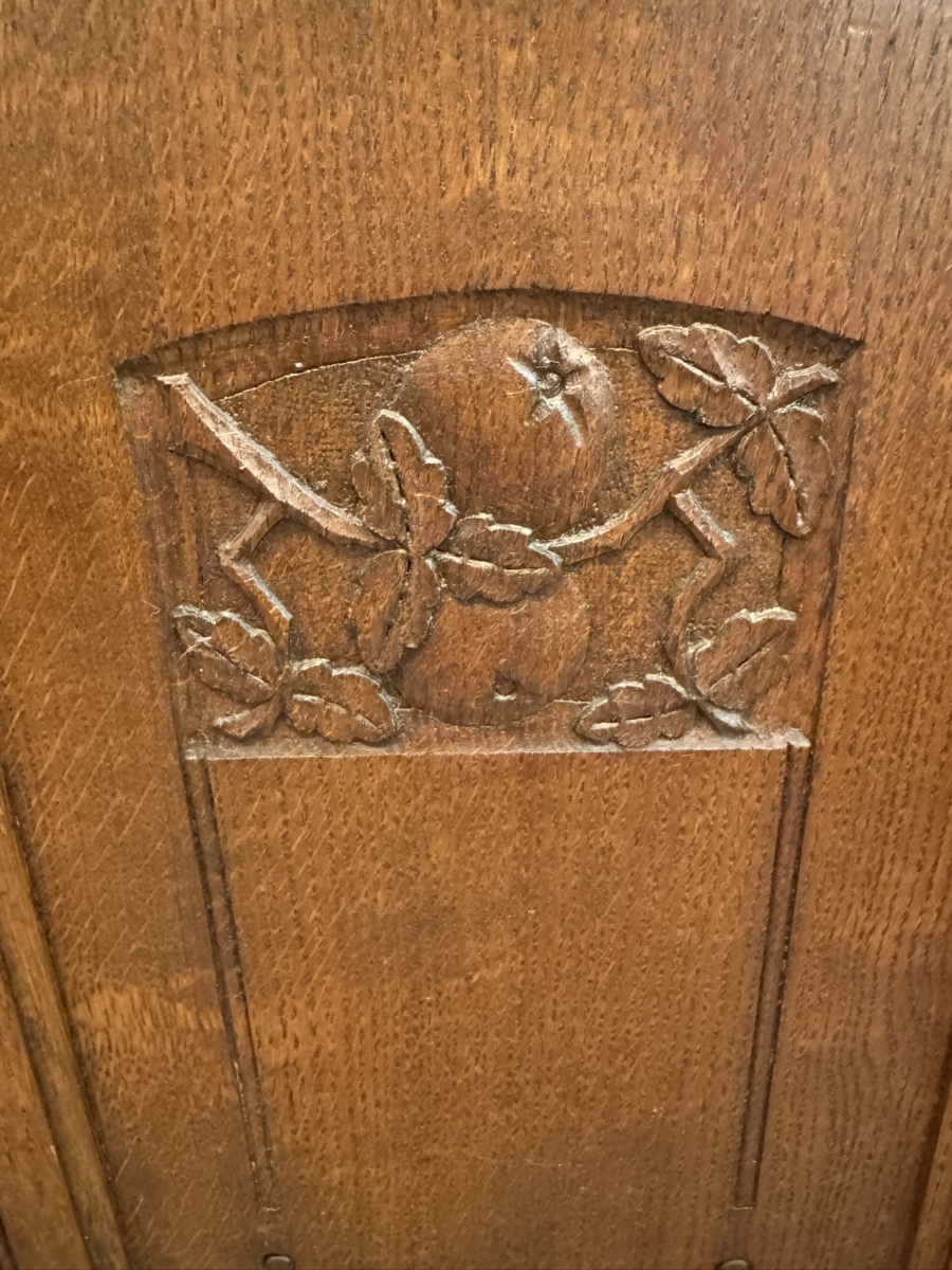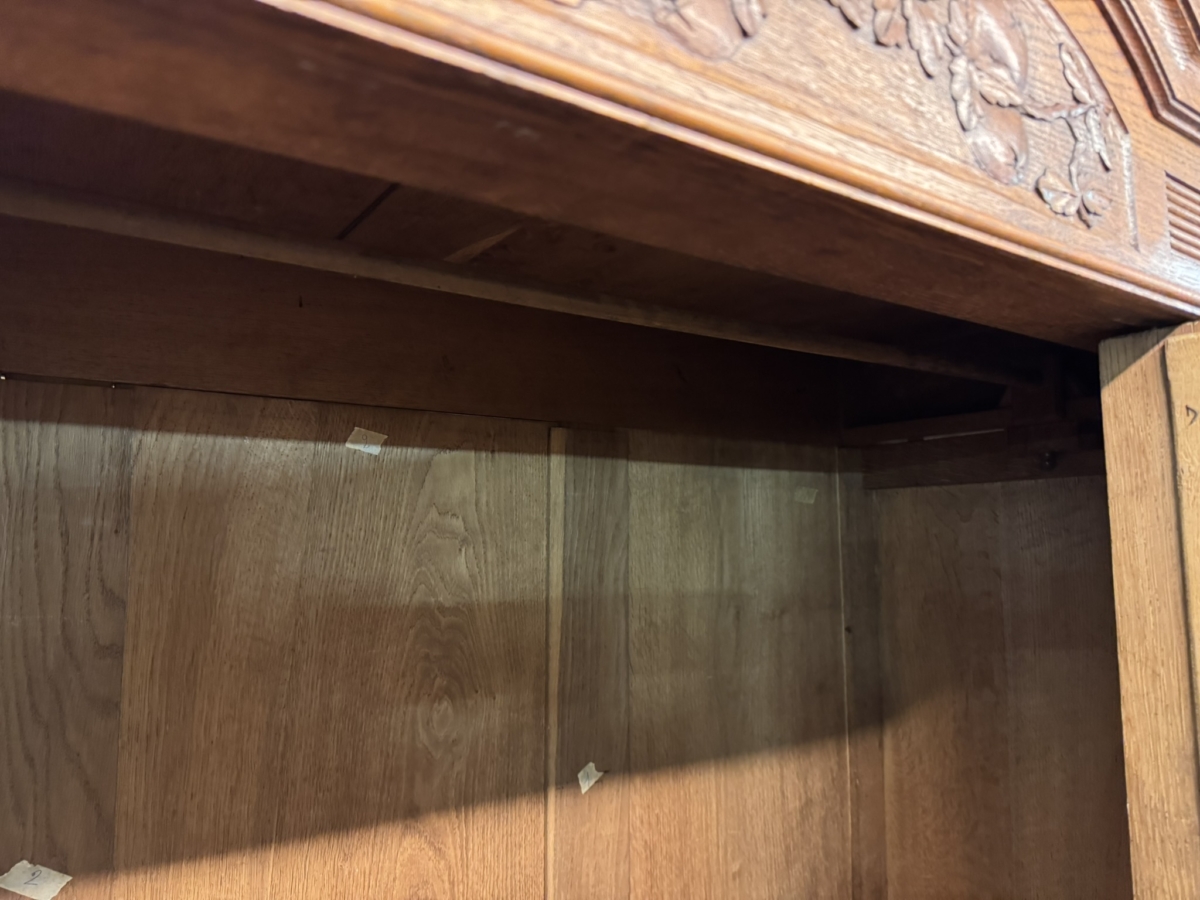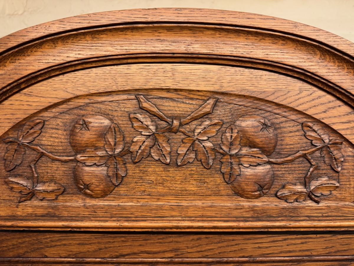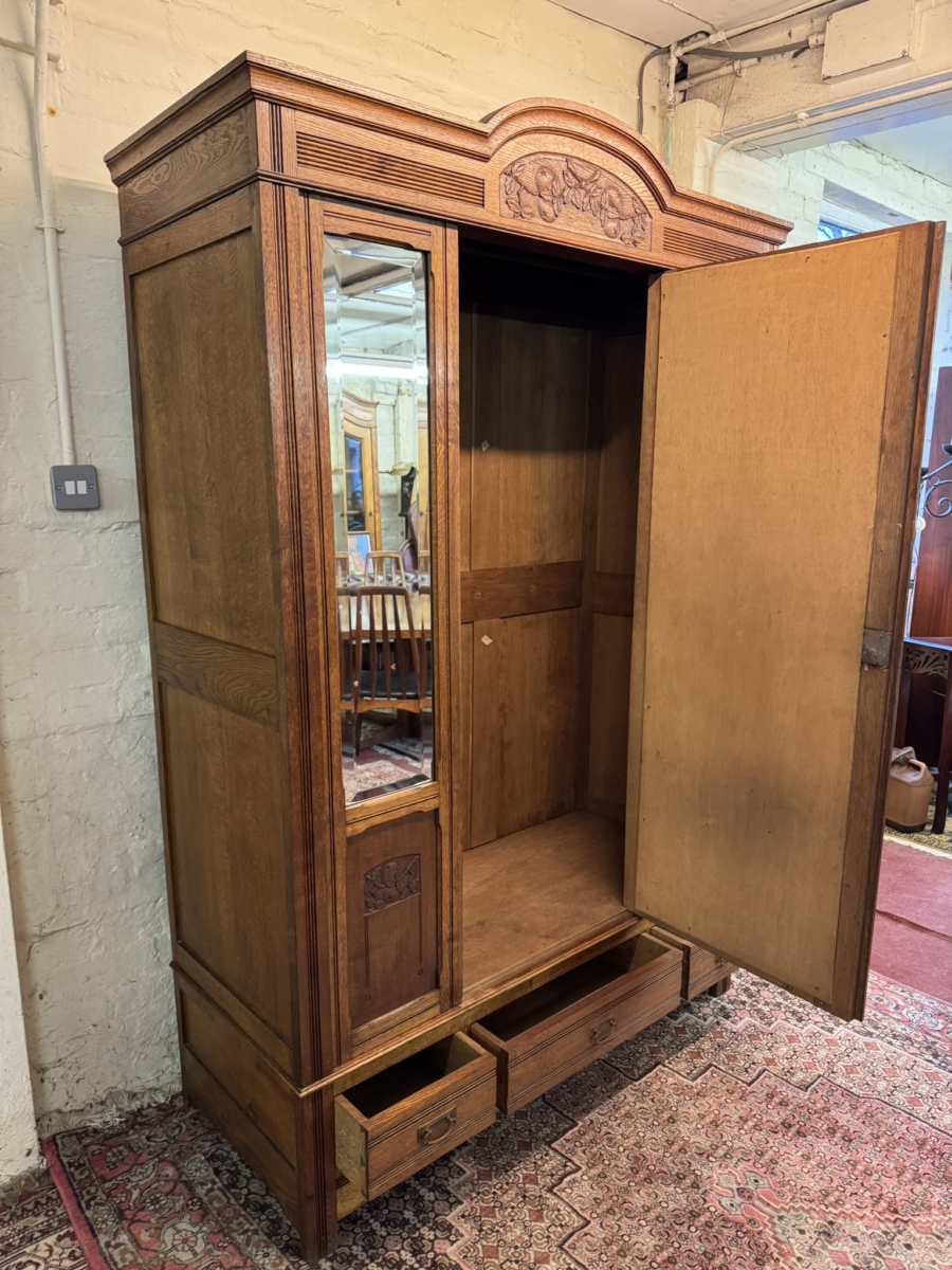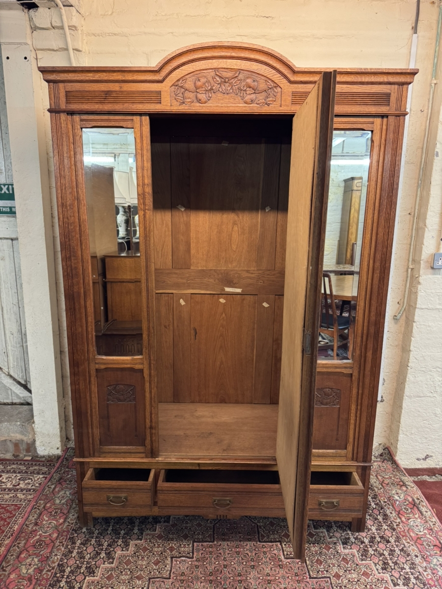 The arched over sailing top has central decorative carving, below is a central bevel edged full length mirror door, the door opens to reveal a hanging rail. The door is flanked by a pair of fixed mirrored and glazed panels, below are three handy storage drawers. Recessed panelled sides and standing on block feet. Please note this armoire completely splits down for easy transportation and delivery into any home.