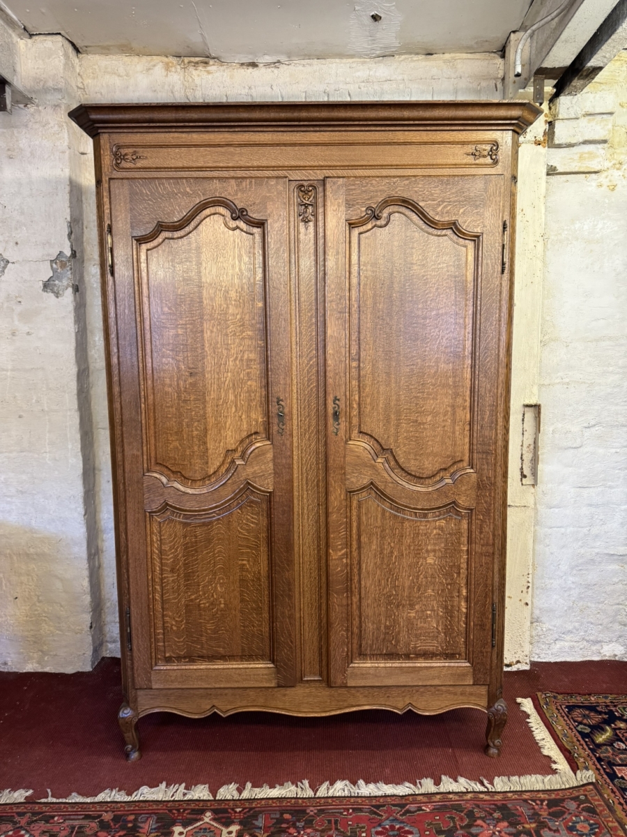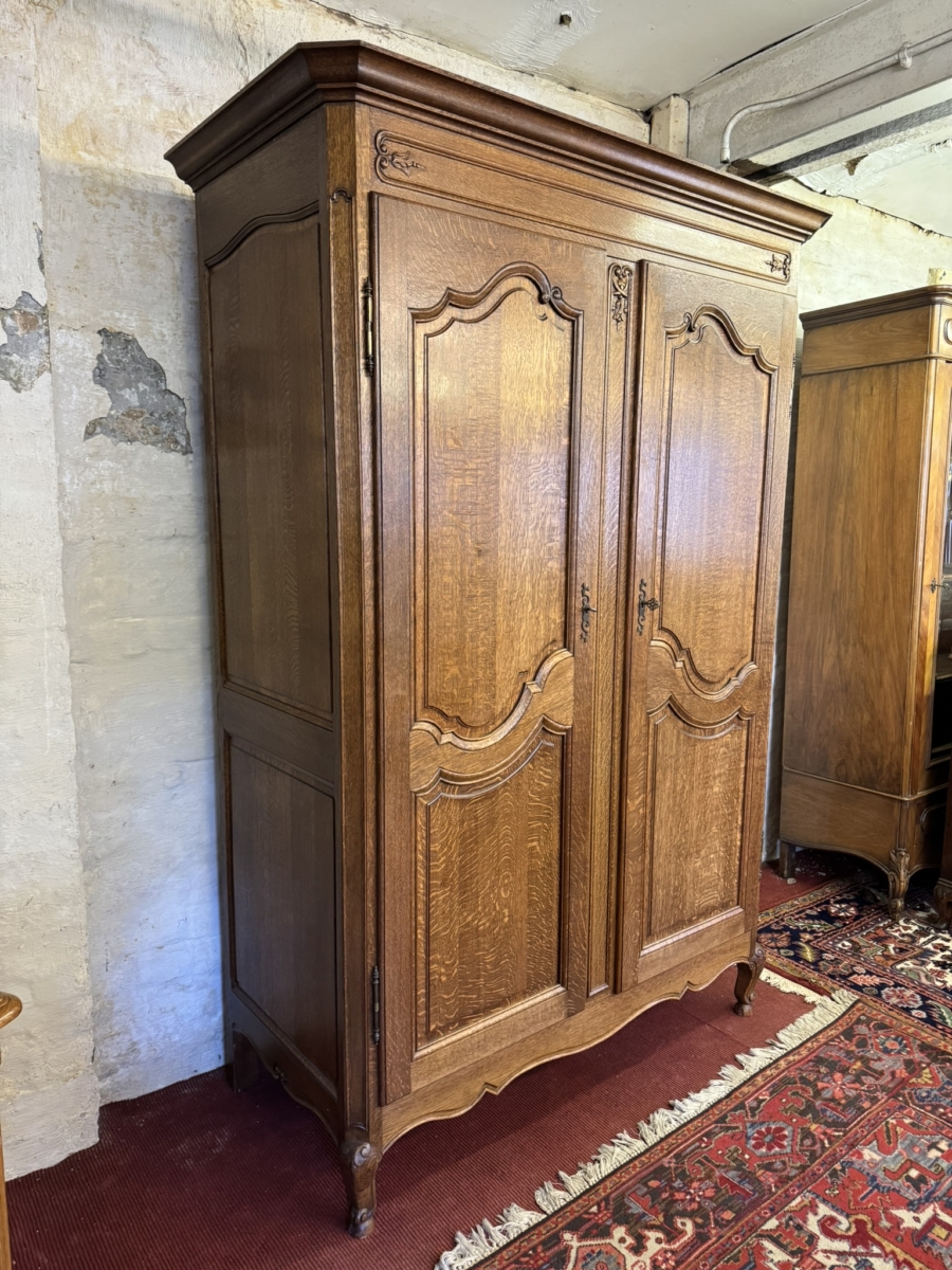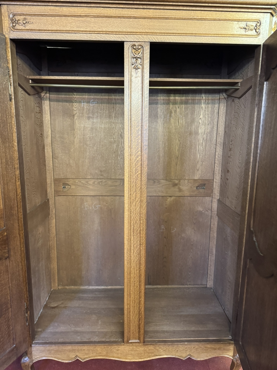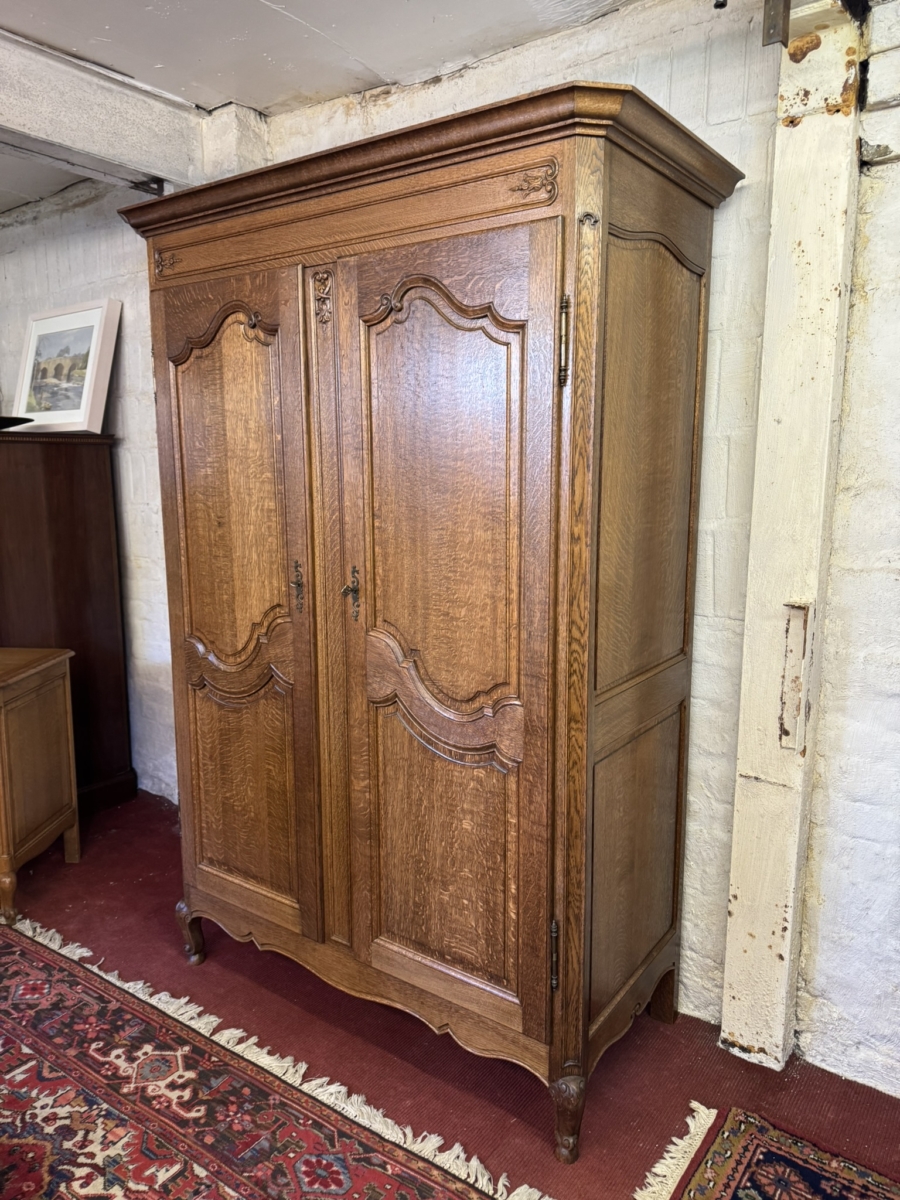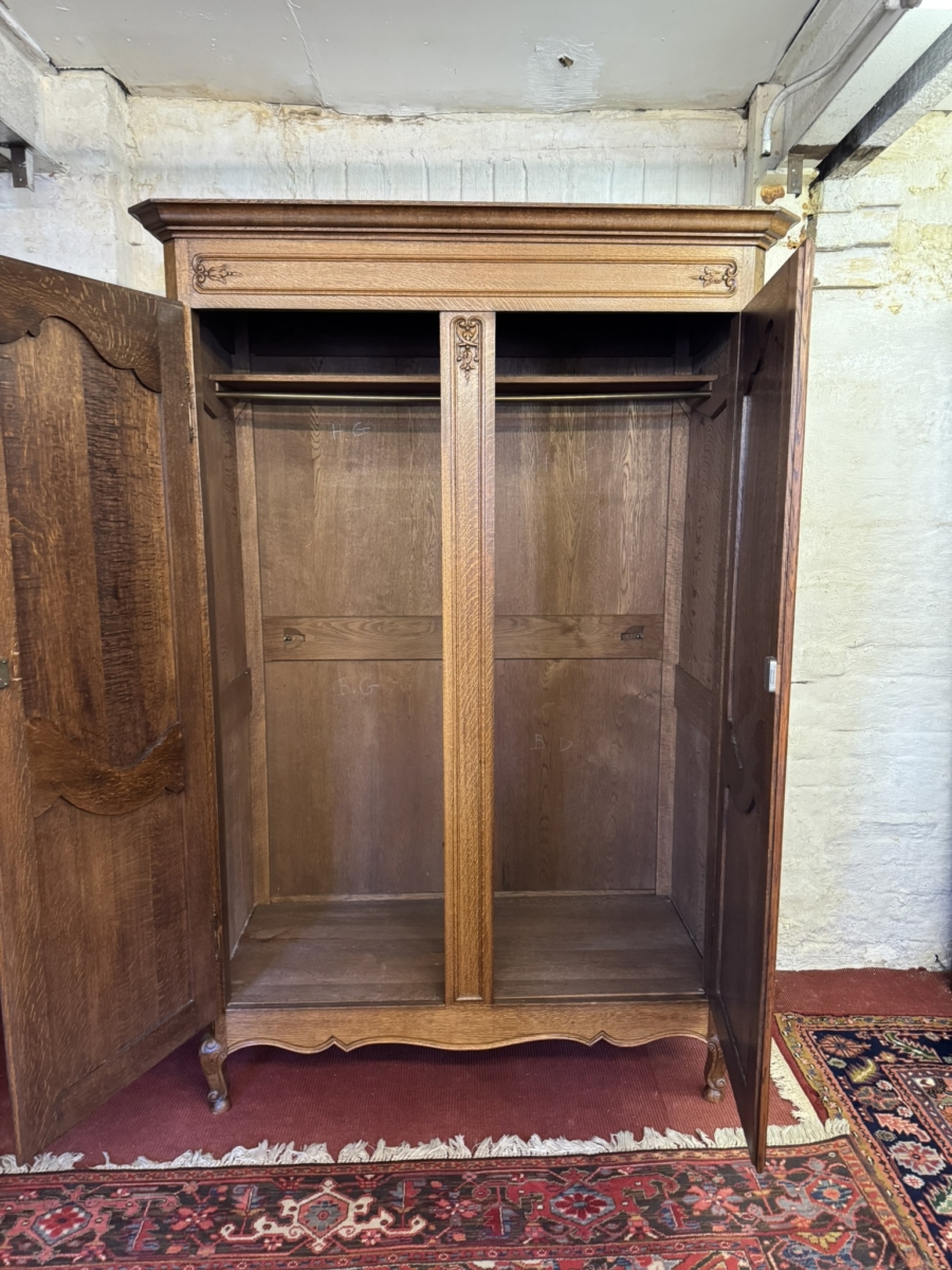 This fantastic armoire dates circa 1920. The stepped cornice sits above a pair of lockable shaped recessed panelled doors, each door has brass hinges, escutcheon and key. The doors open to reveal a wooden shelf above a brass hanging rail. Fielded panelled sides, shaped skirt and standing on two carved cabriole shaped legs to the front.