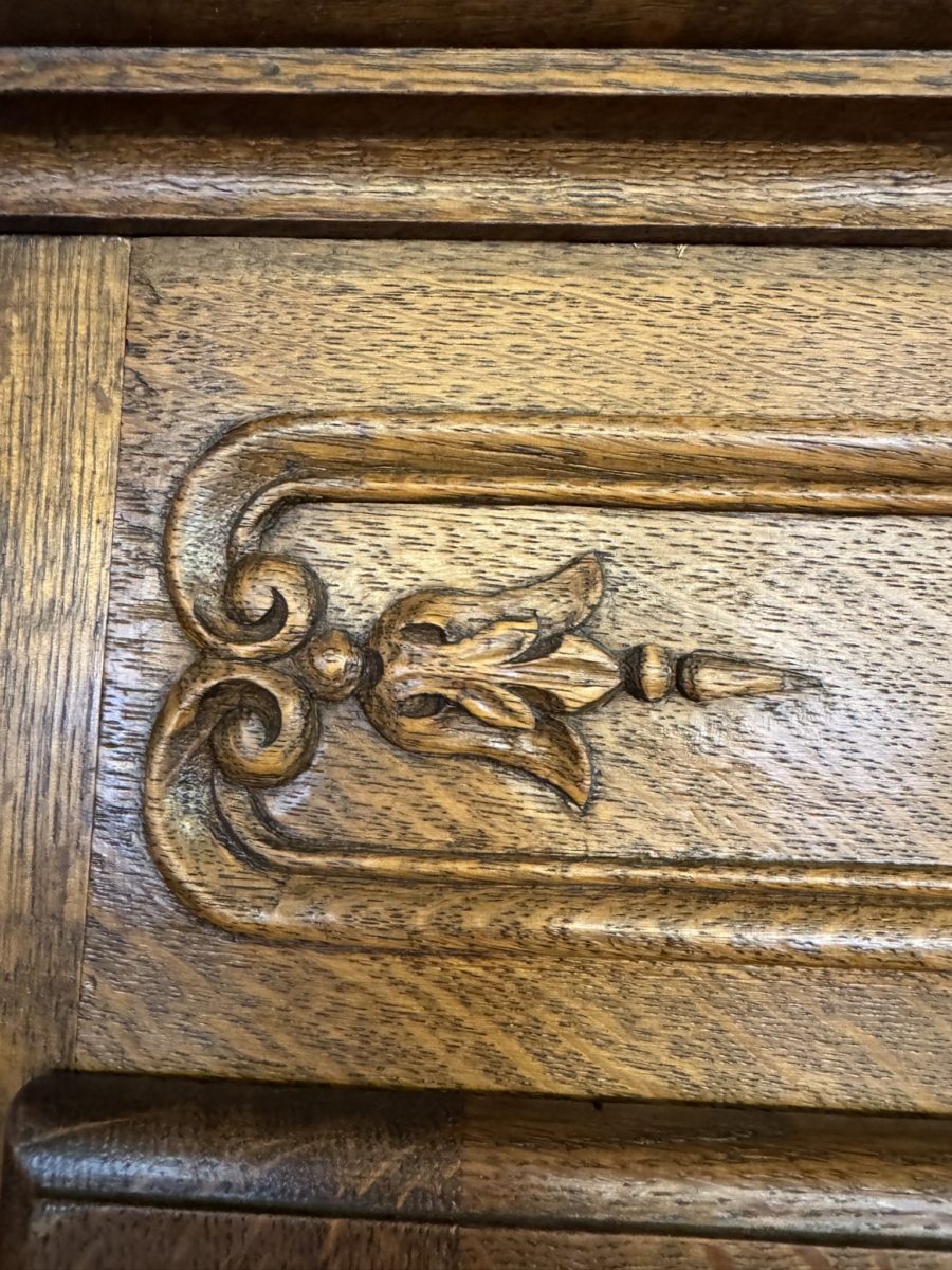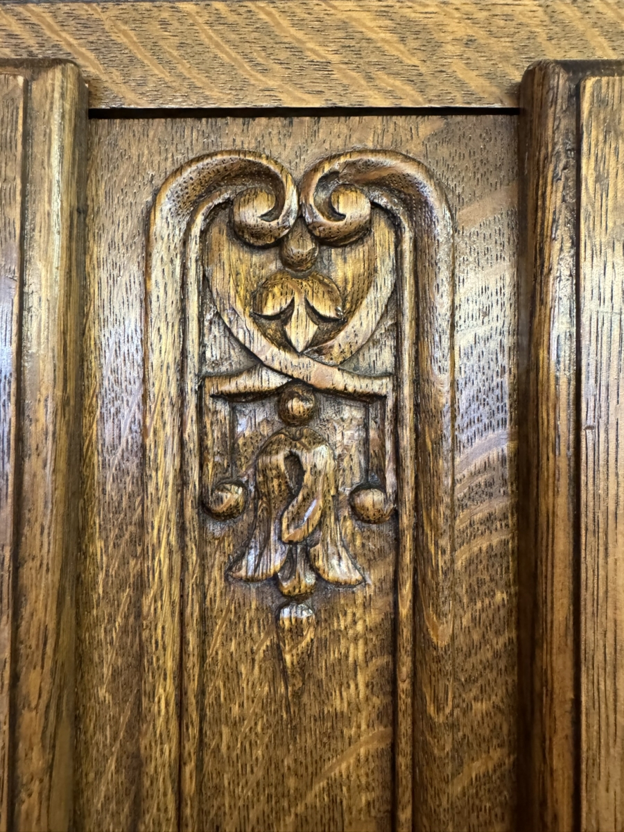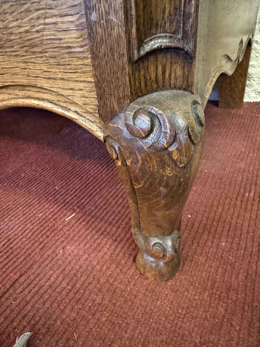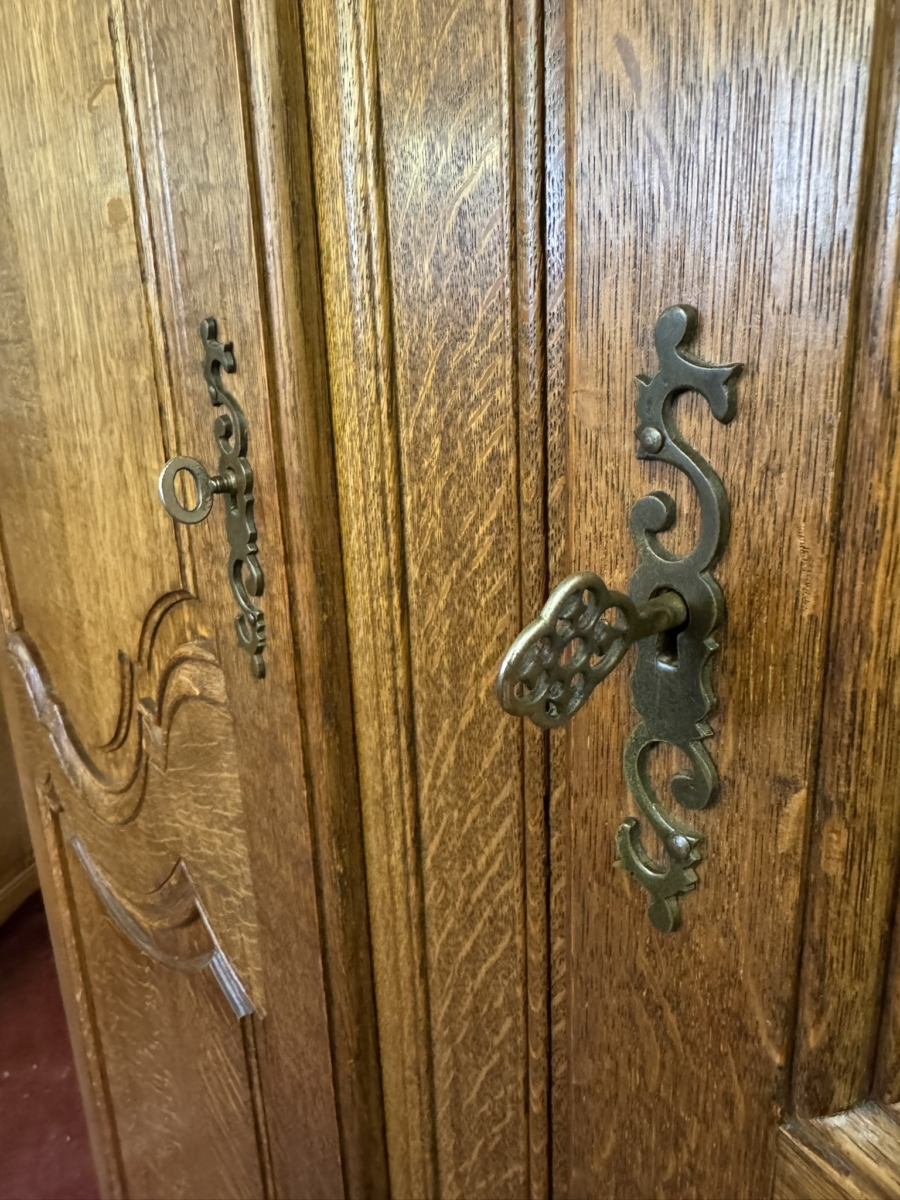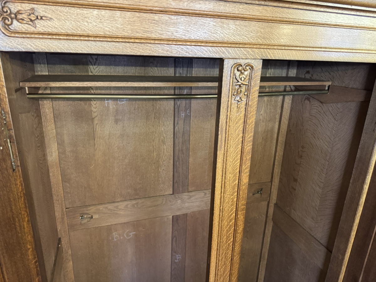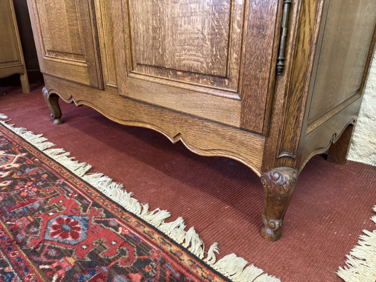 This fantastic armoire dates circa 1920. The stepped cornice sits above a pair of lockable shaped recessed panelled doors, each door has brass hinges, escutcheon and key. The doors open to reveal a wooden shelf above a brass hanging rail. Fielded panelled sides, shaped skirt and standing on two carved cabriole shaped legs to the front.