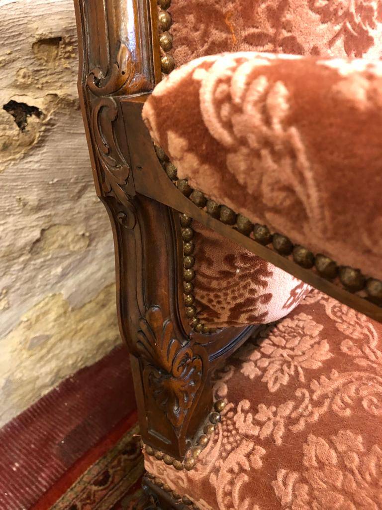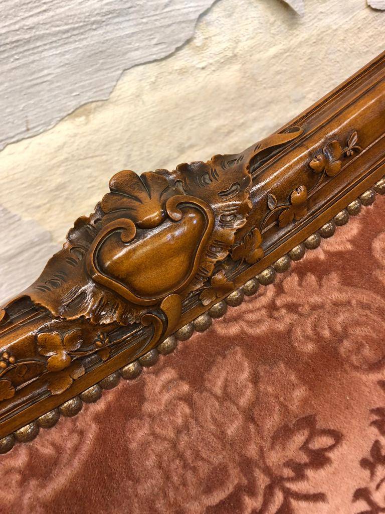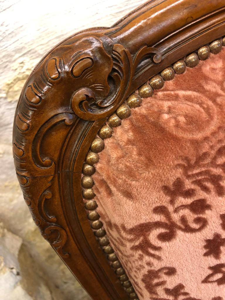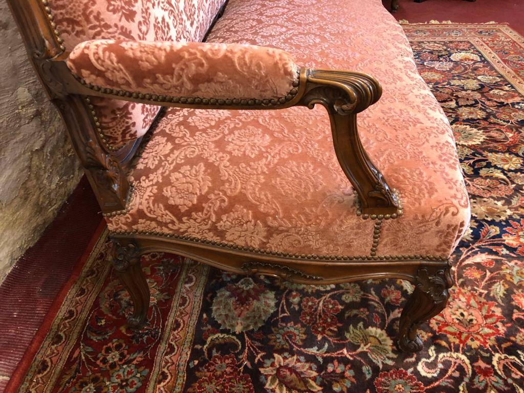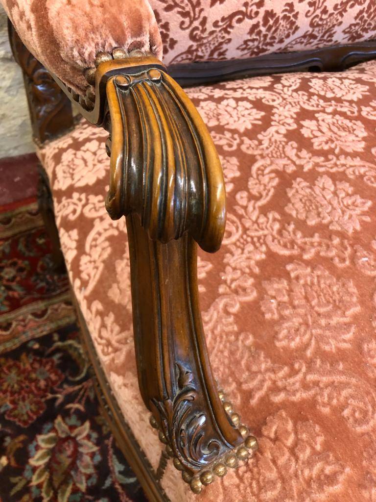 This stunning French settee is in excellent condition. The walnut frame is extensively carved throughout. The upholstered back and shaped seat having brass studded decoration. The settee stands on six carved cabriole shaped legs. Fantastic.