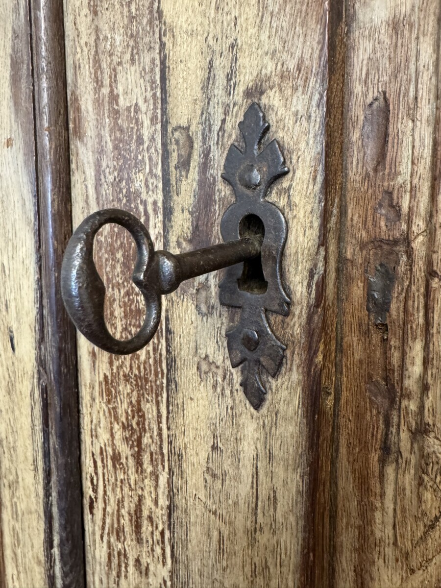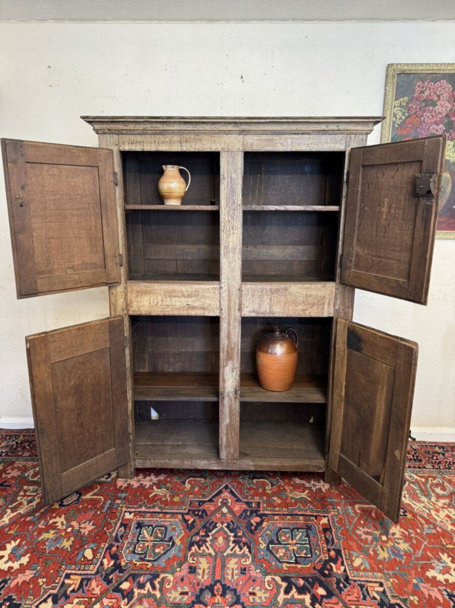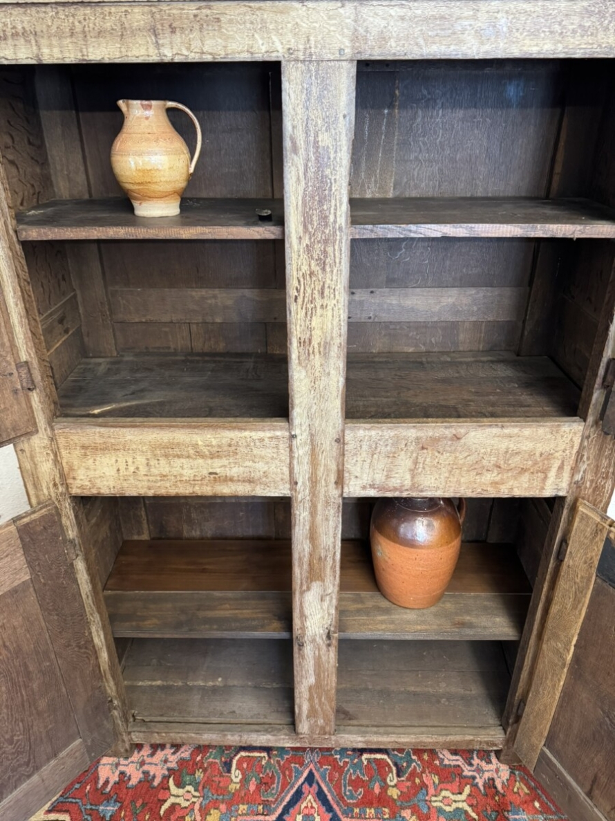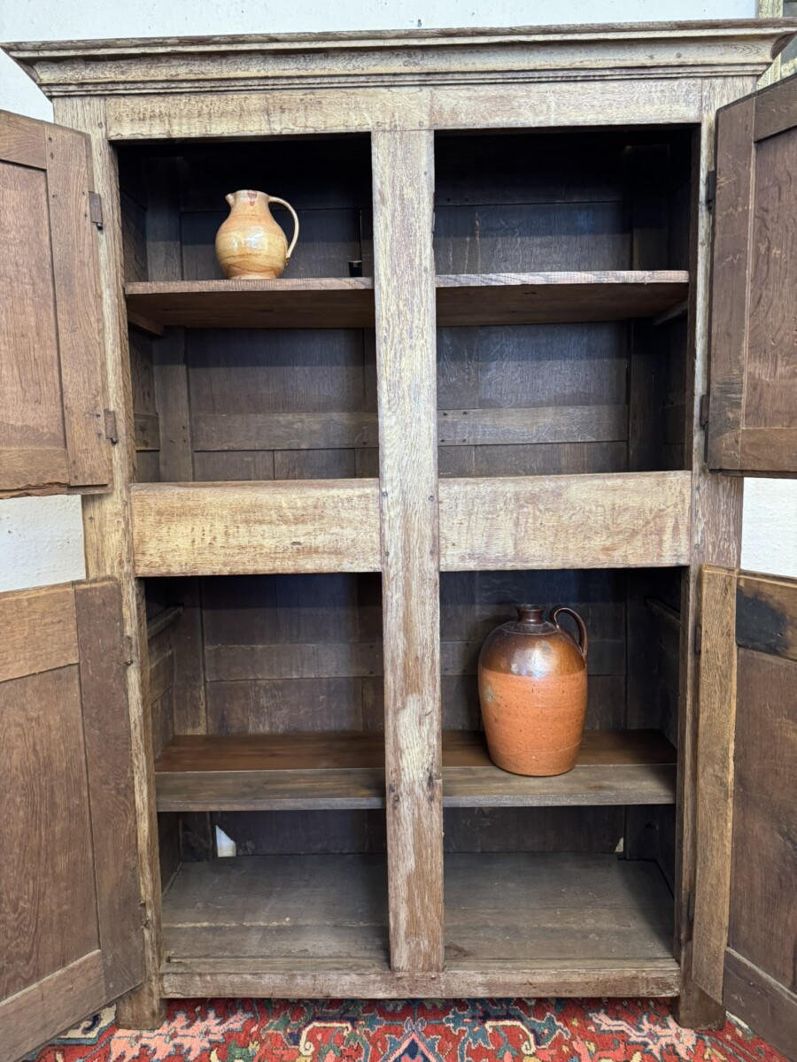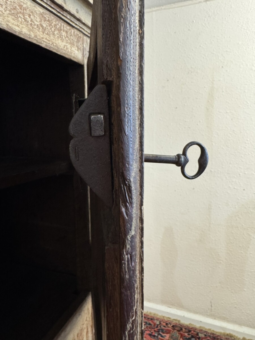 This great French cupboard dates circa 1820. Stepped cornice sits above a pair of lockable panelled doors, each door having iron hinges, escutcheon and enormous key. The doors open to reveal a removable shelf, below are a pair of panelled doors, each door having iron hinges and iron locking latch. The doors open to reveal a removable shelf. The cupboard has recessed panelled sides and stands on traditional block.