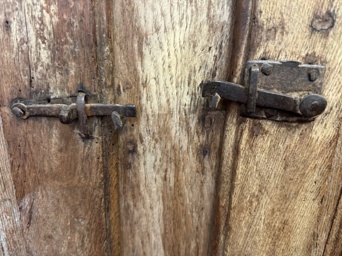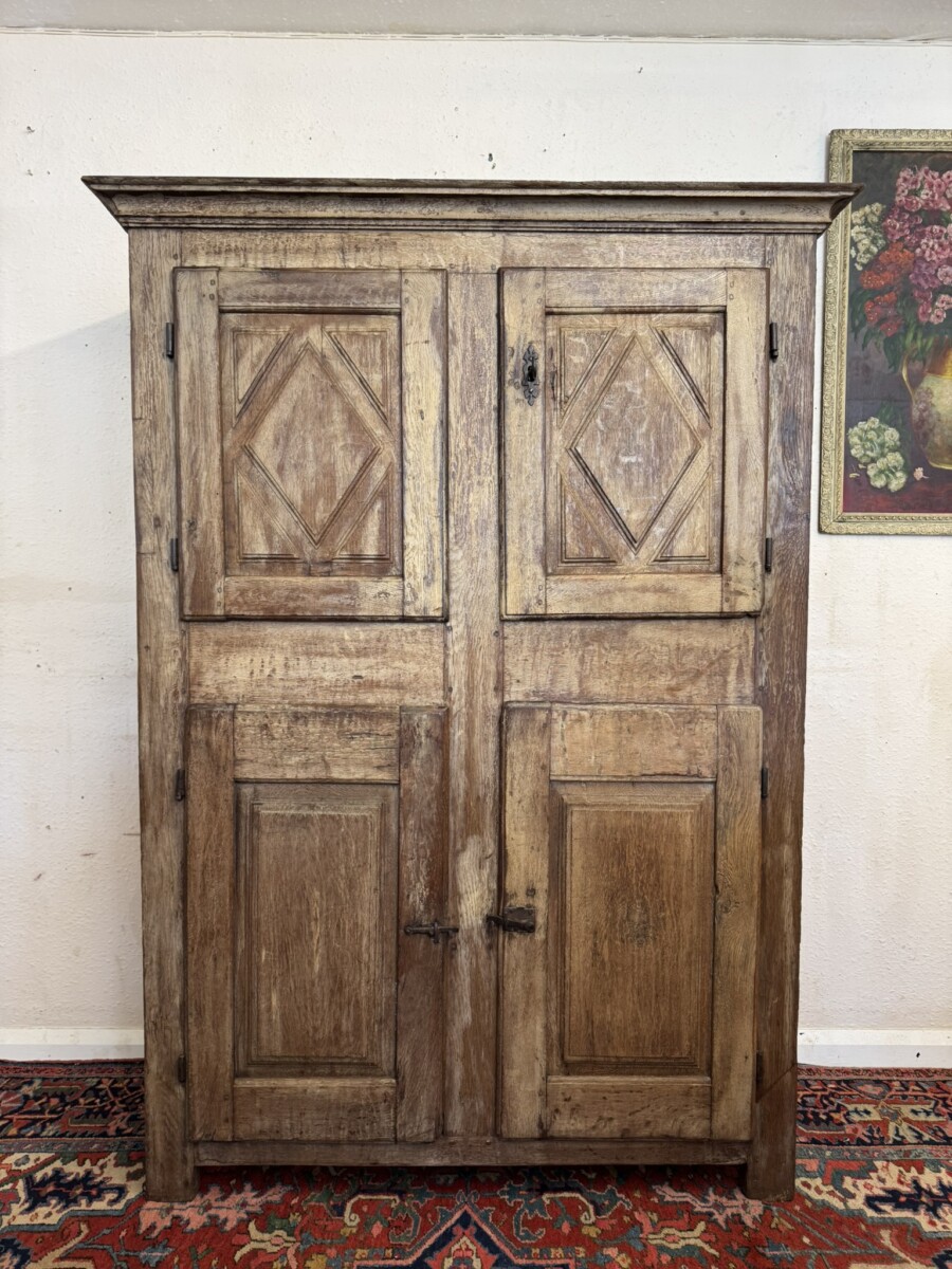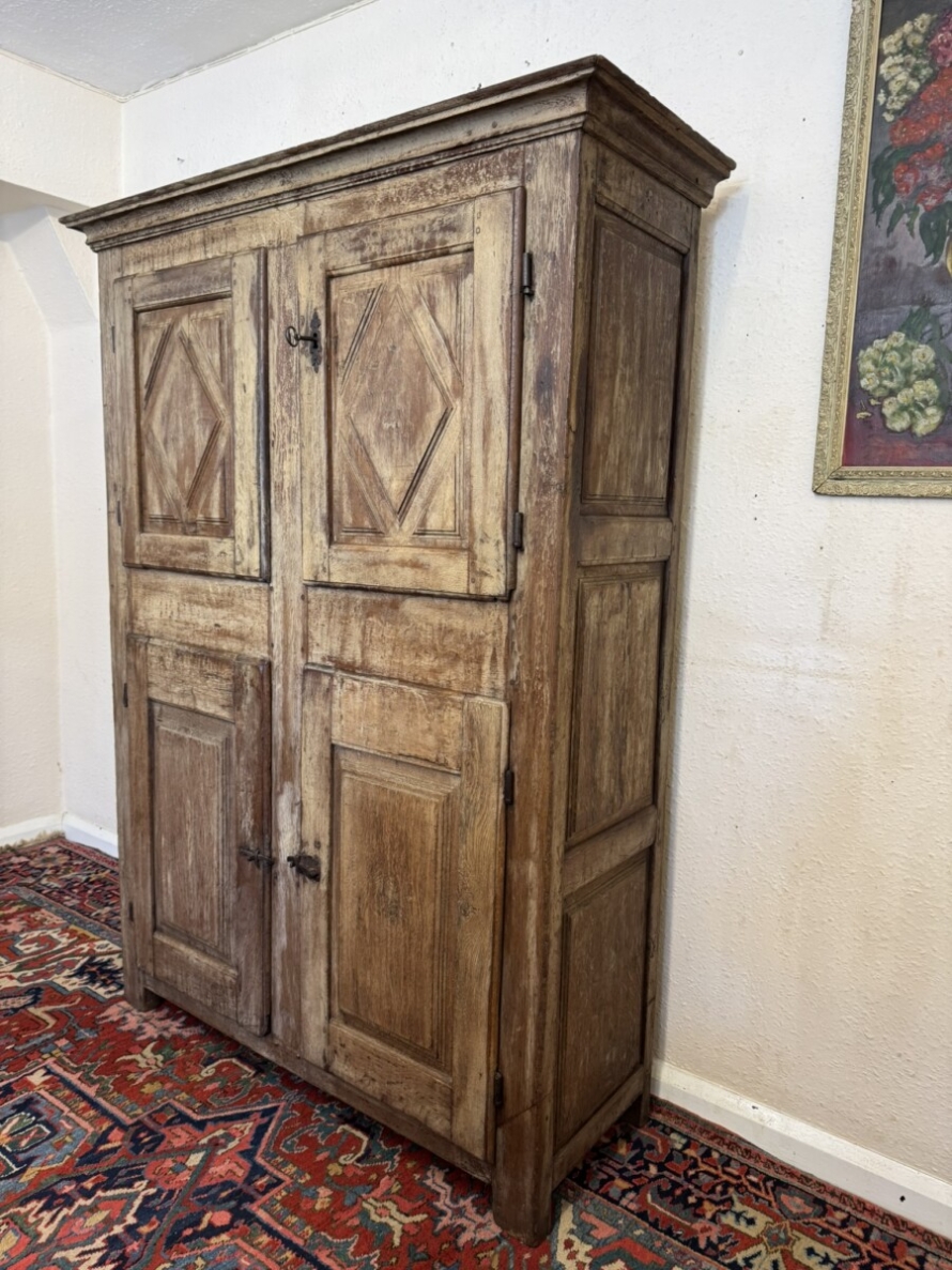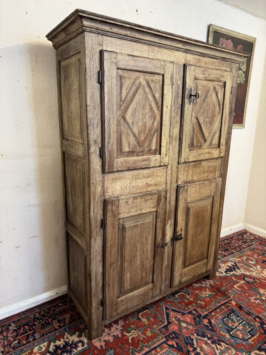 This great French cupboard dates circa 1820. Stepped cornice sits above a pair of lockable panelled doors, each door having iron hinges, escutcheon and enormous key. The doors open to reveal a removable shelf, below are a pair of panelled doors, each door having iron hinges and iron locking latch. The doors open to reveal a removable shelf. The cupboard has recessed panelled sides and stands on traditional block.