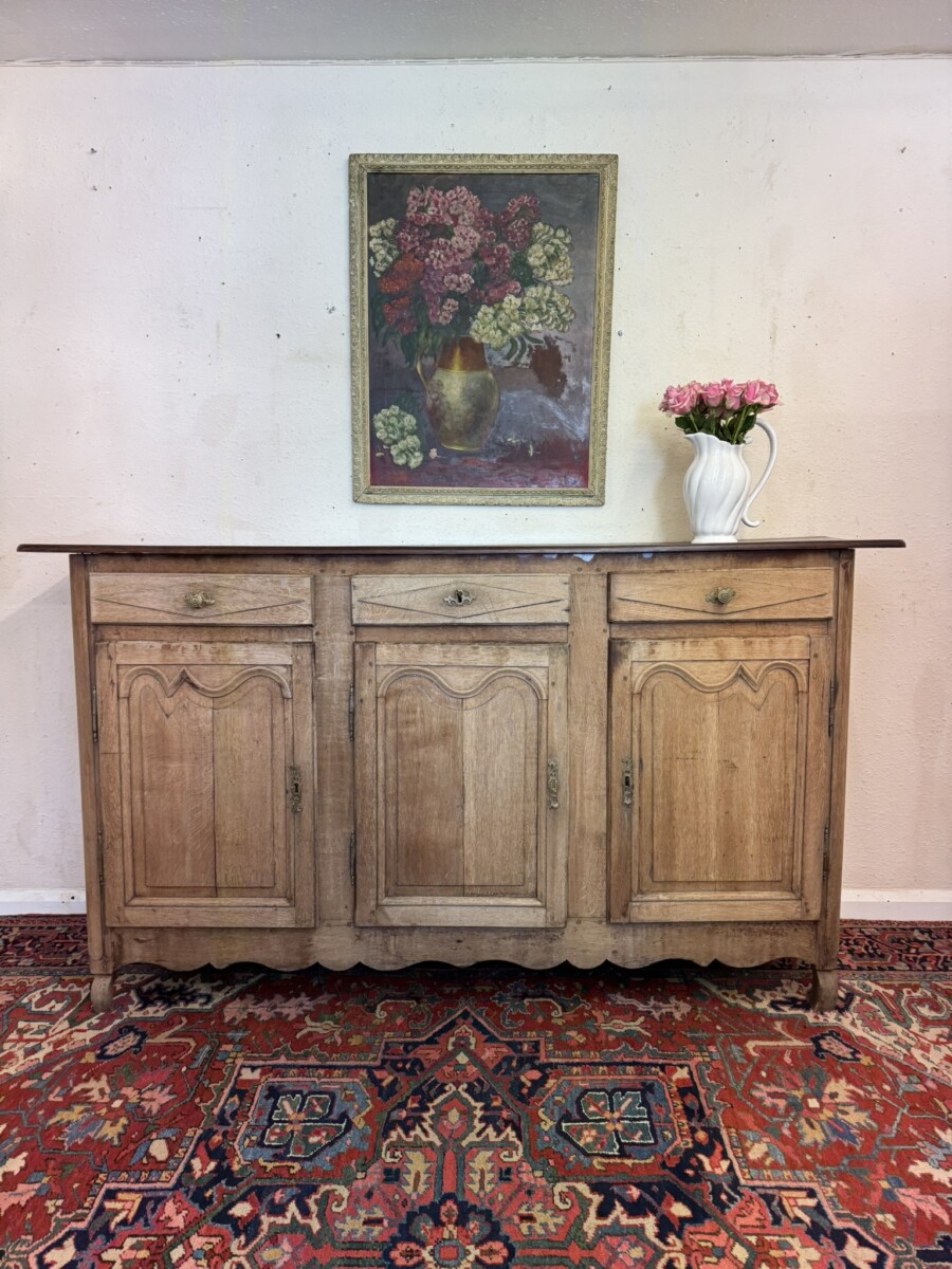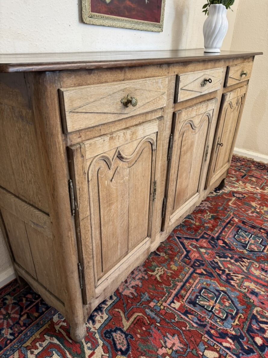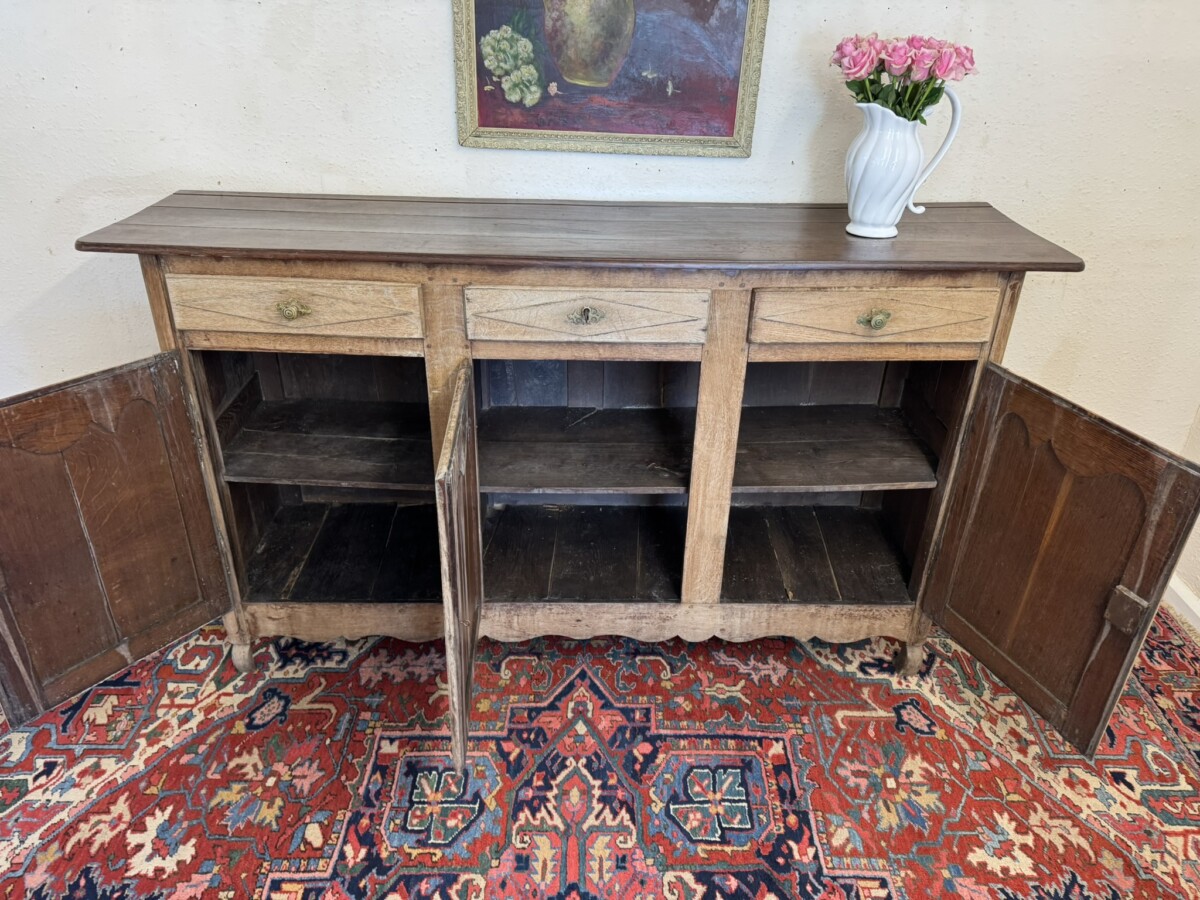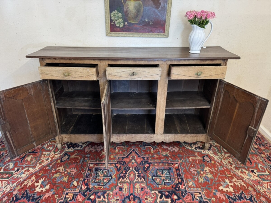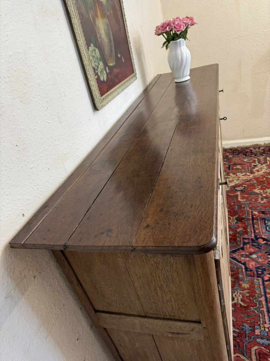 The polished planked top sits above three drawers which sit above three shaped panelled doors, the doors open to reveal a wooden shelf and planked back and base. Recessed panelled sides and standing on two shaped legs to the front.