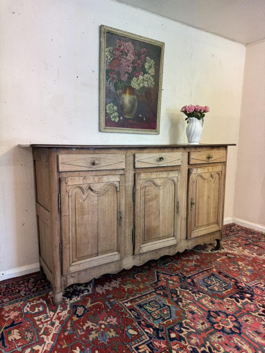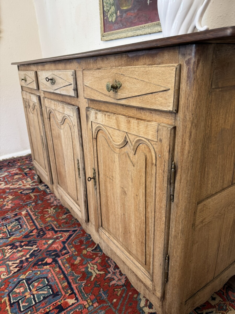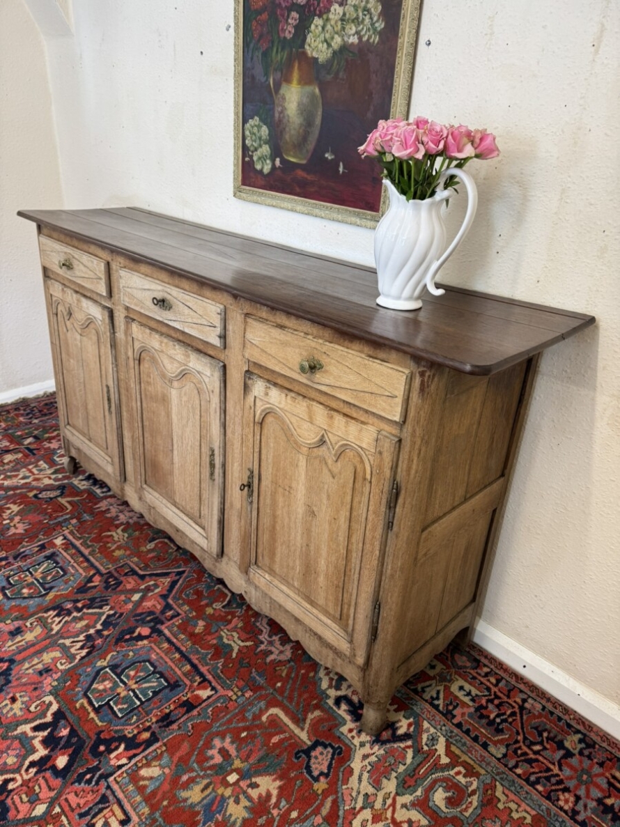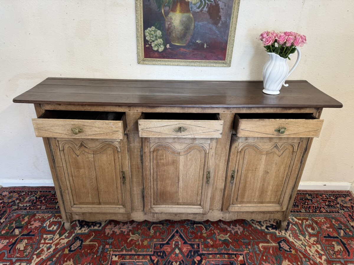 The polished planked top sits above three drawers which sit above three shaped panelled doors, the doors open to reveal a wooden shelf and planked back and base. Recessed panelled sides and standing on two shaped legs to the front.