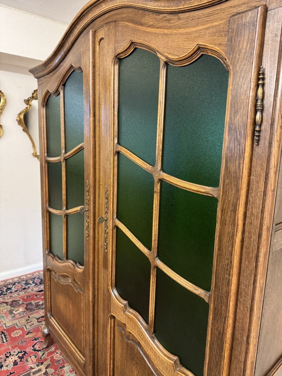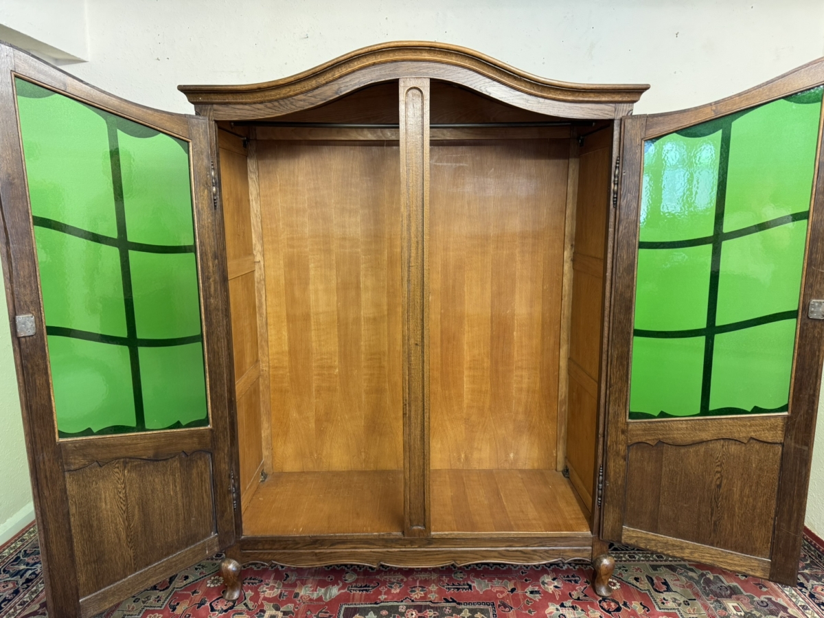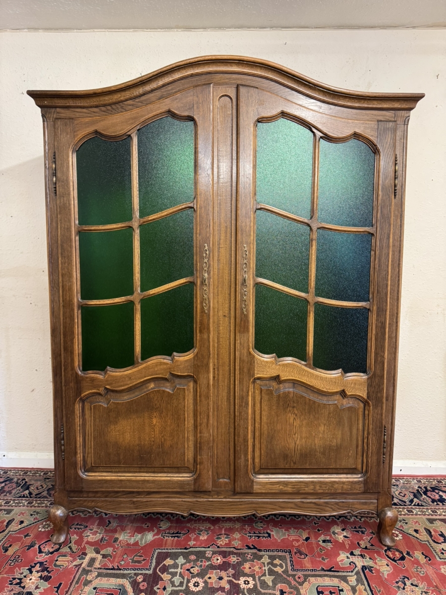 This super French armoire dates circa 1920. The curved top sits above a pair of lockable doors, each door having a shaped recessed panel, vibrant green glazing with wood barring, brass hinges, decorative brass escutcheon and key. The doors open to reveal a brass hanging rail. Recessed panelled sides shaped skirt and standing on cabriole shaped legs to the front. Please note this armoire completely splits down for easy transportation and delivery into any home.