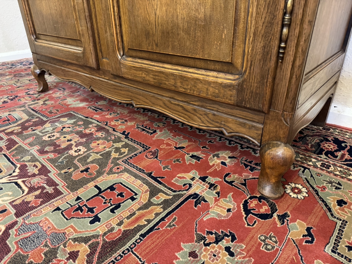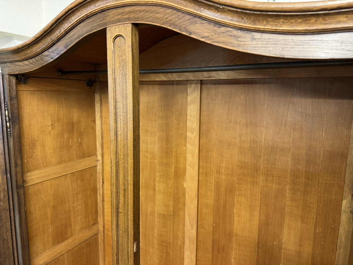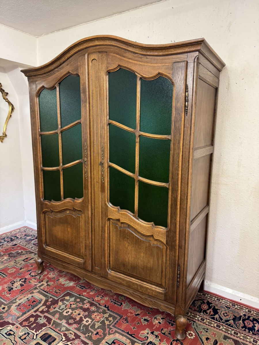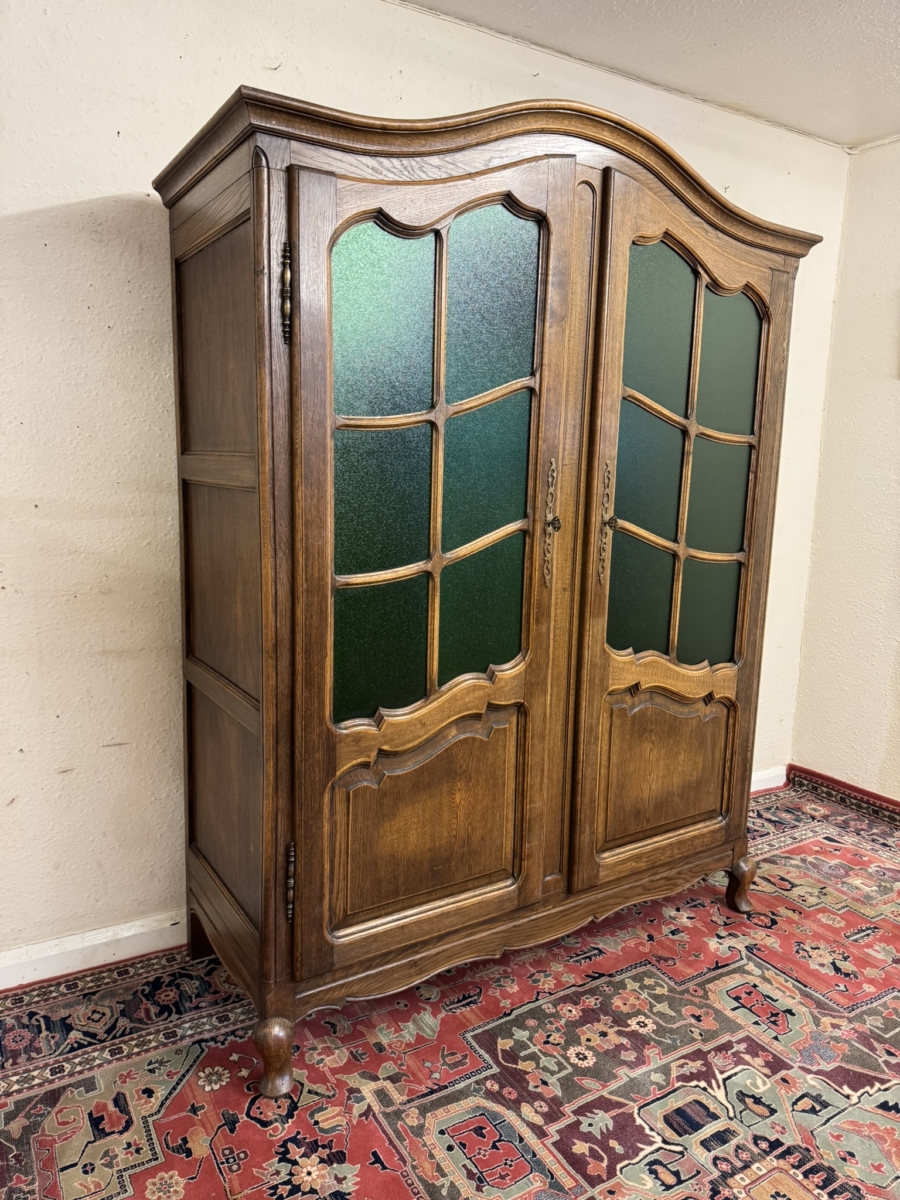 This super French armoire dates circa 1920. The curved top sits above a pair of lockable doors, each door having a shaped recessed panel, vibrant green glazing with wood barring, brass hinges, decorative brass escutcheon and key. The doors open to reveal a brass hanging rail. Recessed panelled sides shaped skirt and standing on cabriole shaped legs to the front. Please note this armoire completely splits down for easy transportation and delivery into any home.