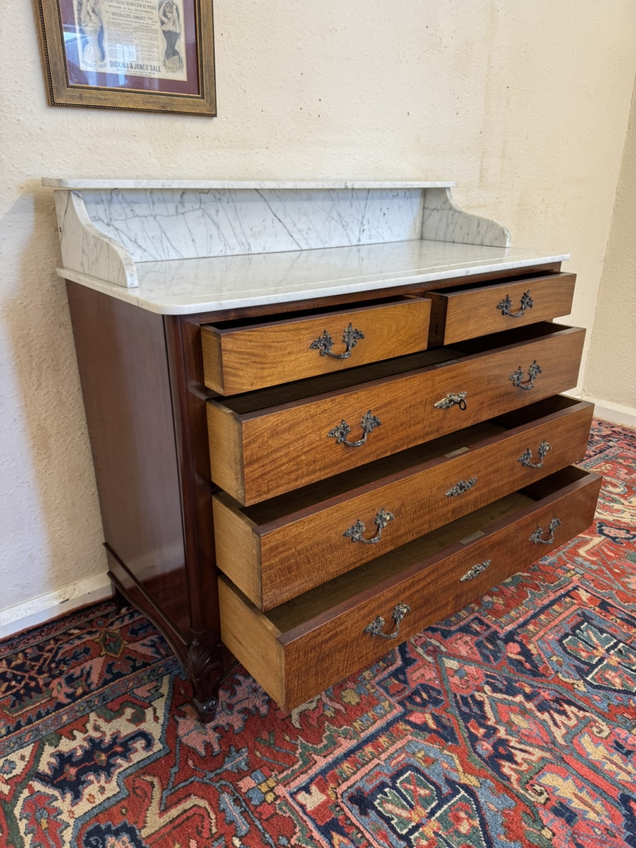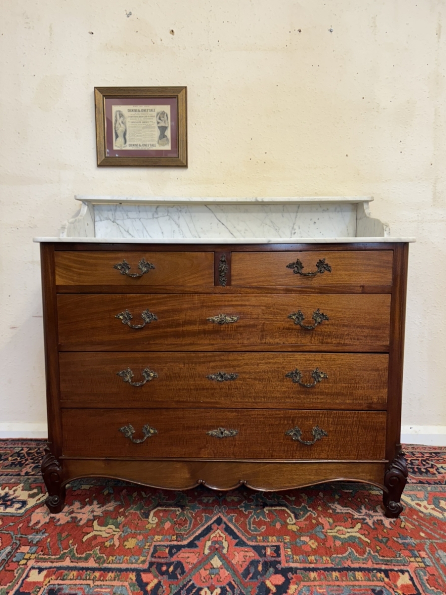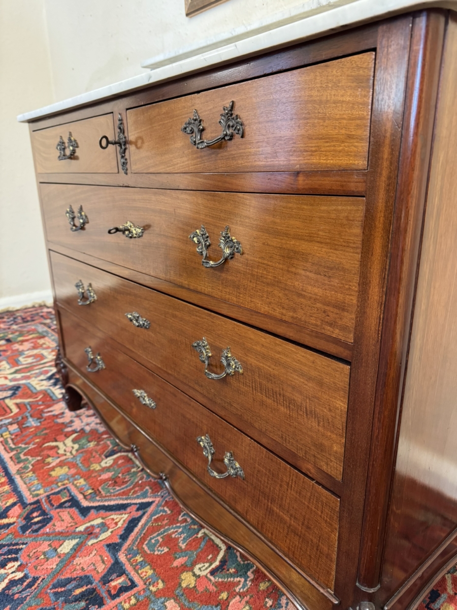 This super mahogany French antique marble top commode dates circa 1880. The carrara white marble top sits above two short lockable drawers, each drawer having an ornate brass handle, below are three lockable long drawers, each drawer having a pair of ornate brass handles and brass escutcheon. Shaped skirt and standing on two carved cabriole legs to the front.