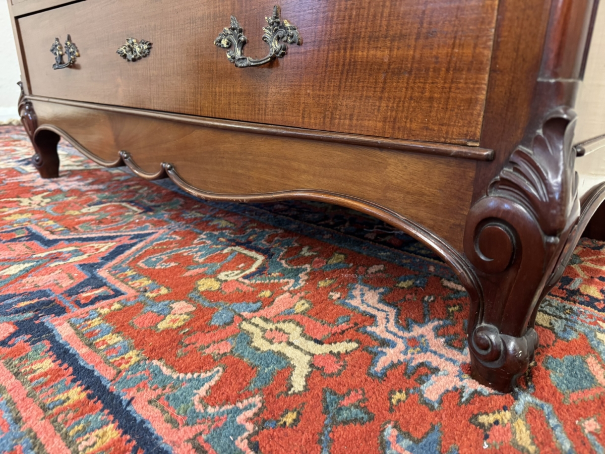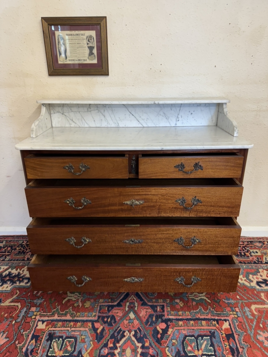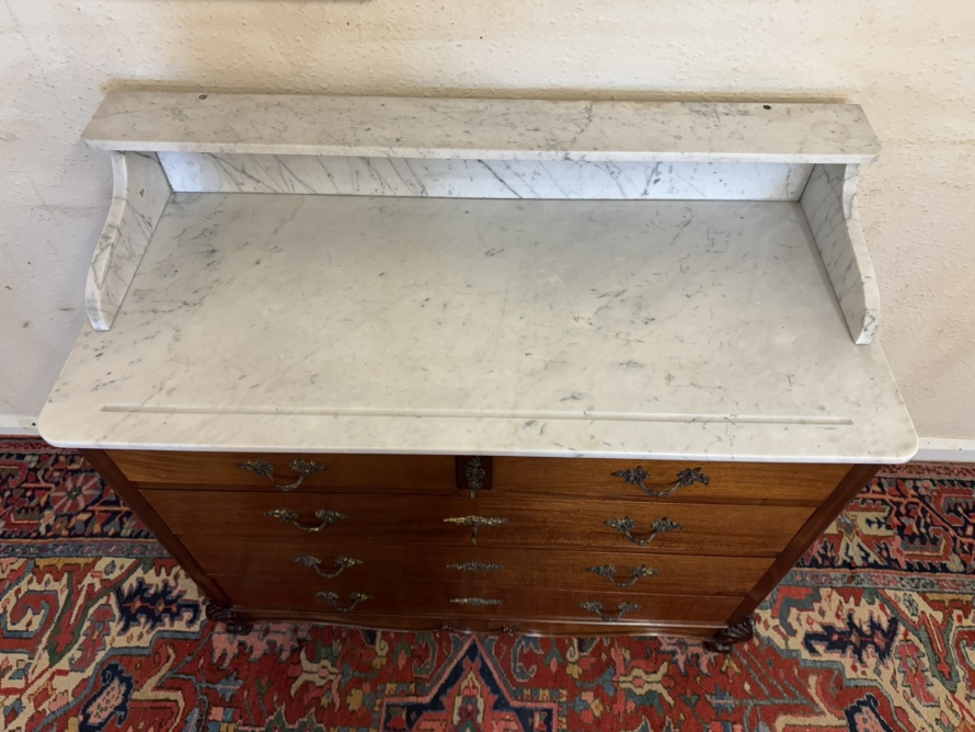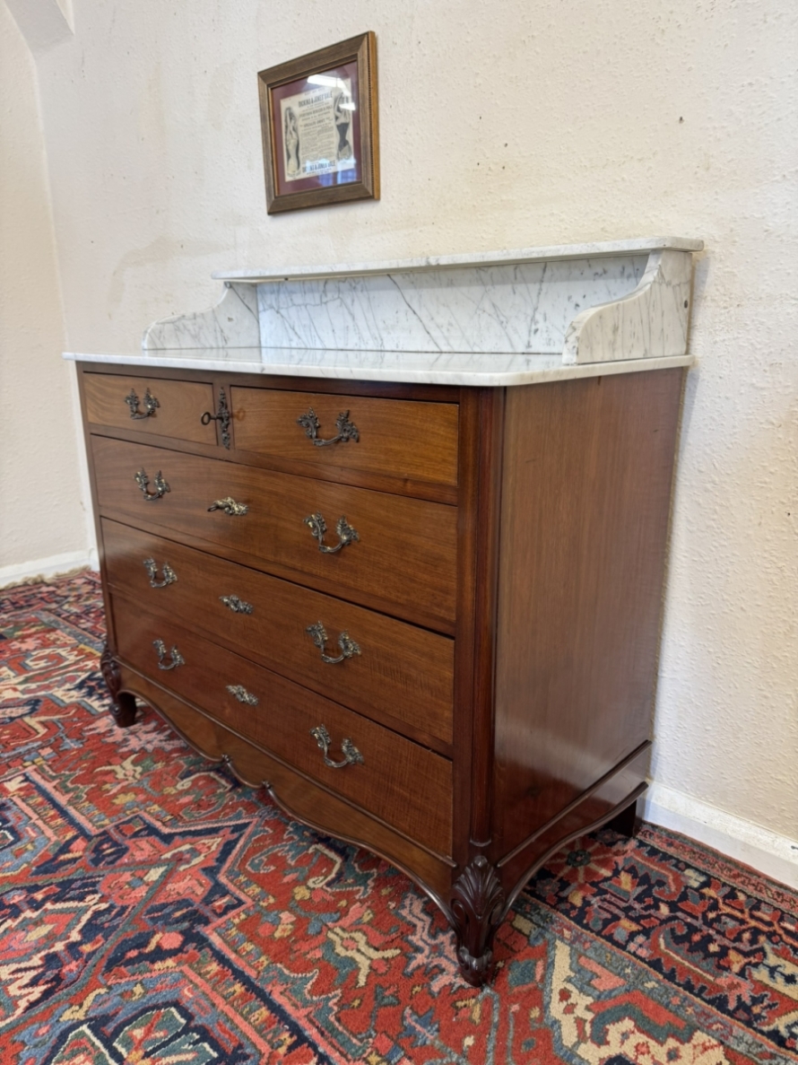 This super mahogany French antique marble top commode dates circa 1880. The carrara white marble top sits above two short lockable drawers, each drawer having an ornate brass handle, below are three lockable long drawers, each drawer having a pair of ornate brass handles and brass escutcheon. Shaped skirt and standing on two carved cabriole legs to the front.