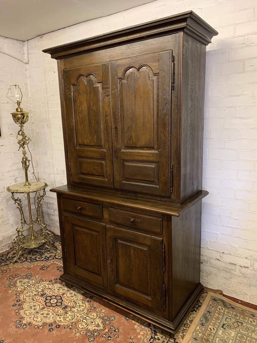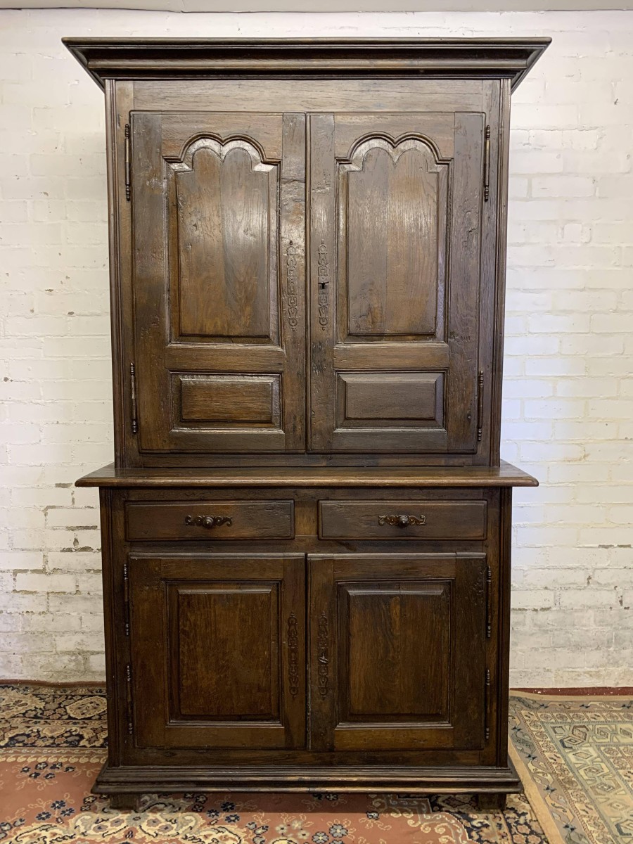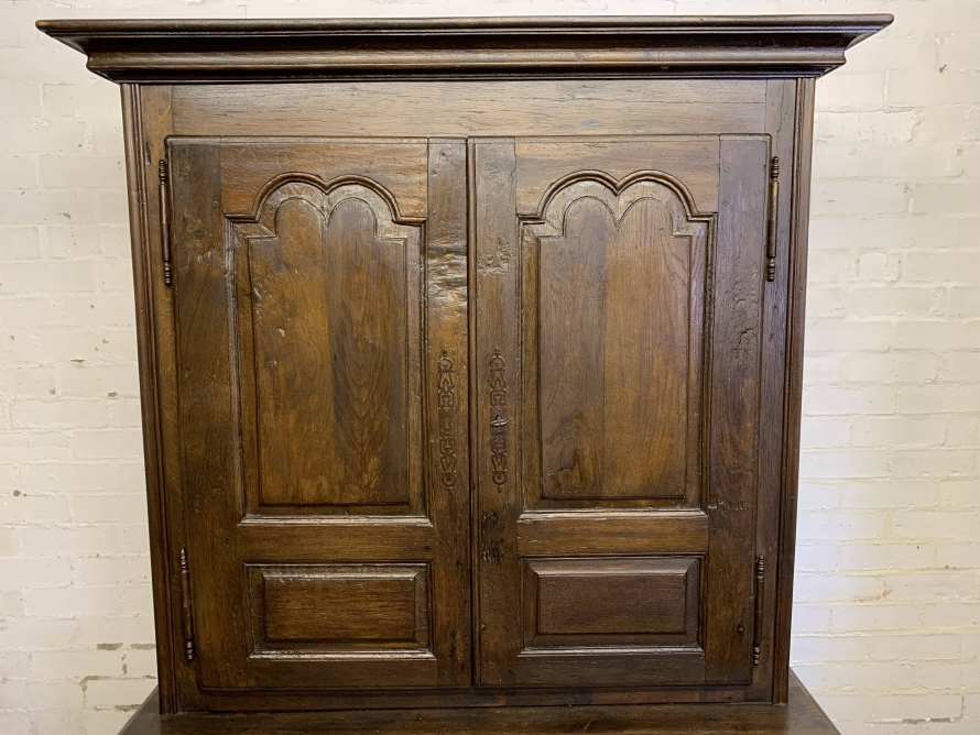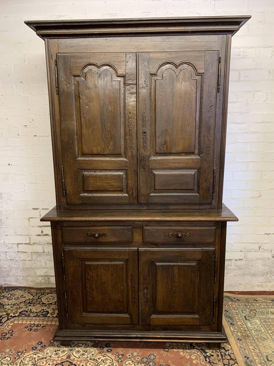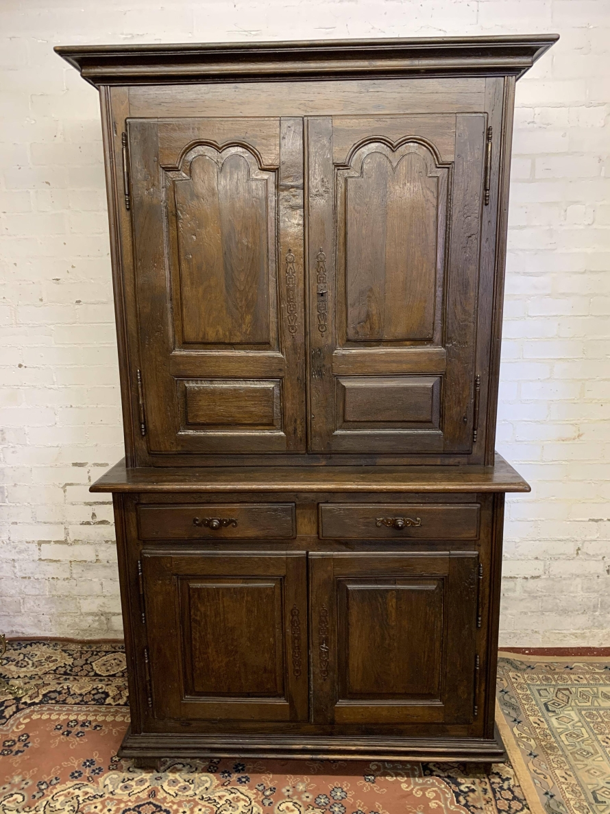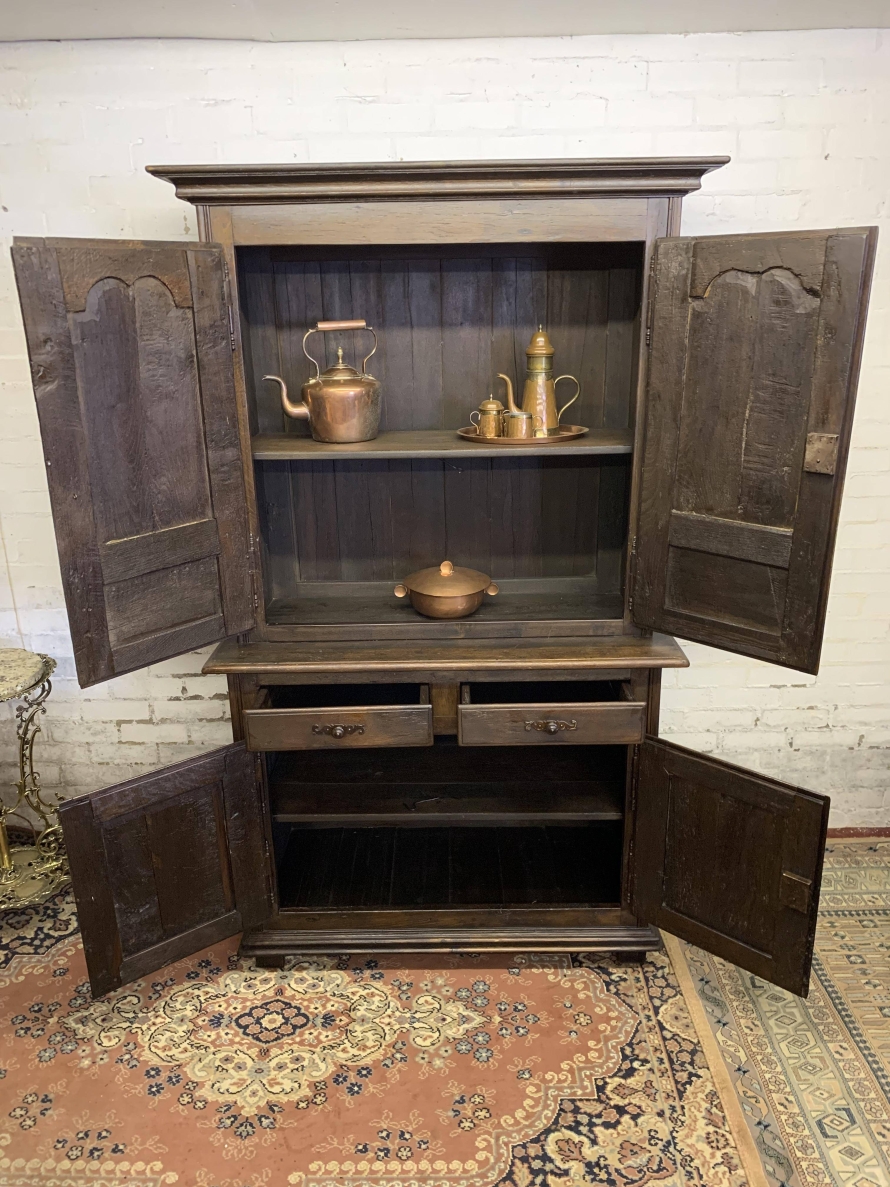 This French cupboard of full of rustic charm. The oversailing top sits above a pair of lockable shaped recessed panelled doors, each door having brass hinges and ornate brass escutcheon. The doors open to reveal a removable shelf. Below are a pair of drawers which sit above a pair of recessed panelled doors, the doors open to reveal a removable shelf. Boarded back and base and standing on four traditional block feet.