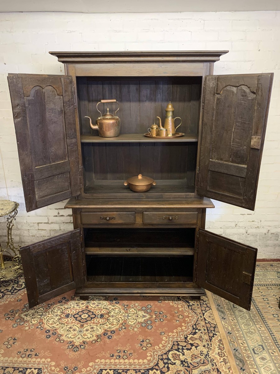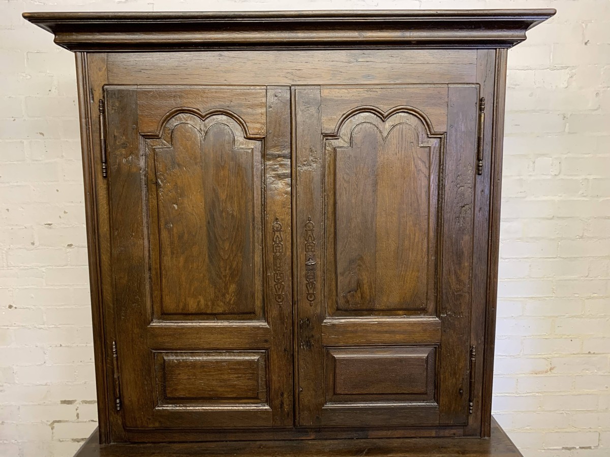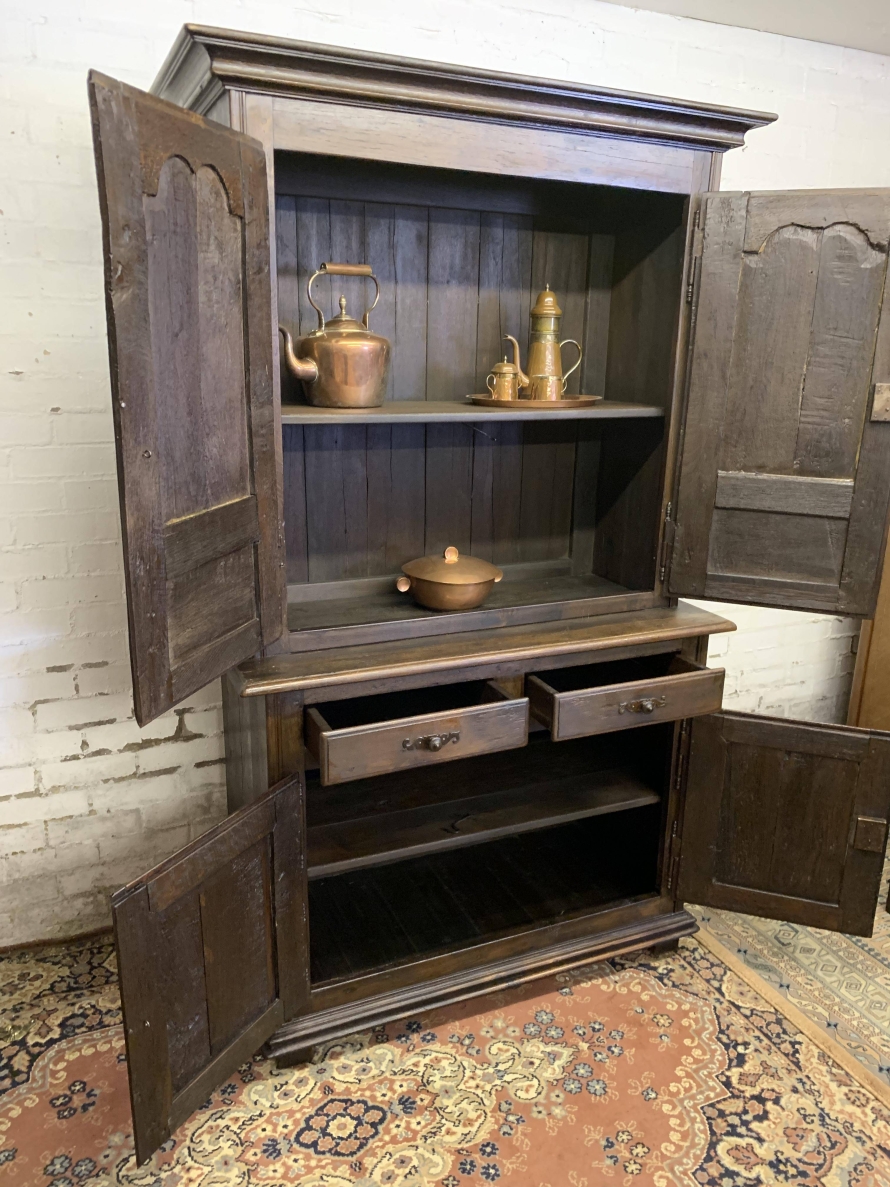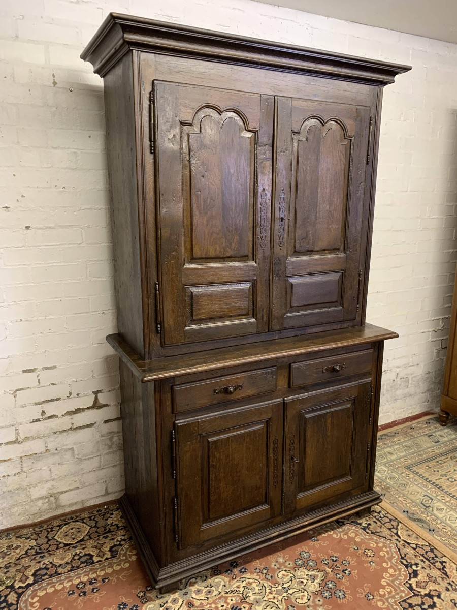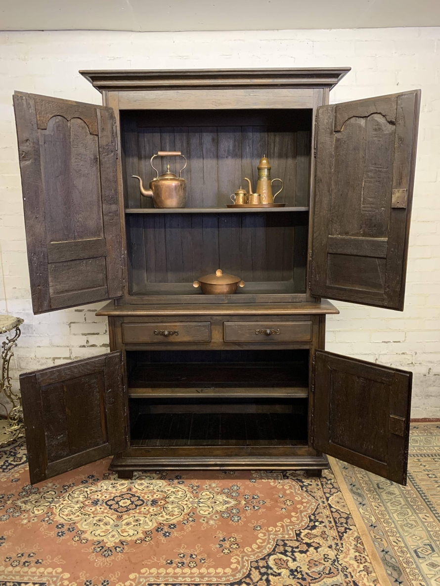 This French cupboard of full of rustic charm. The oversailing top sits above a pair of lockable shaped recessed panelled doors, each door having brass hinges and ornate brass escutcheon. The doors open to reveal a removable shelf. Below are a pair of drawers which sit above a pair of recessed panelled doors, the doors open to reveal a removable shelf. Boarded back and base and standing on four traditional block feet.