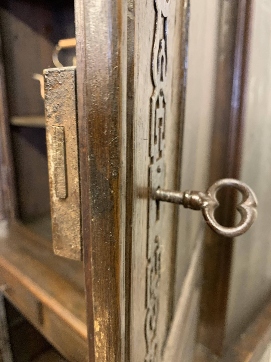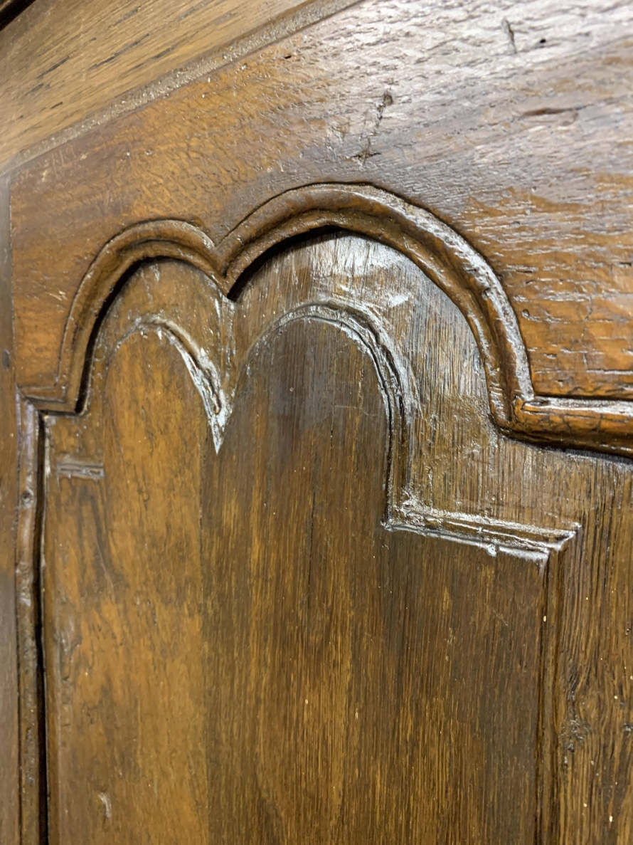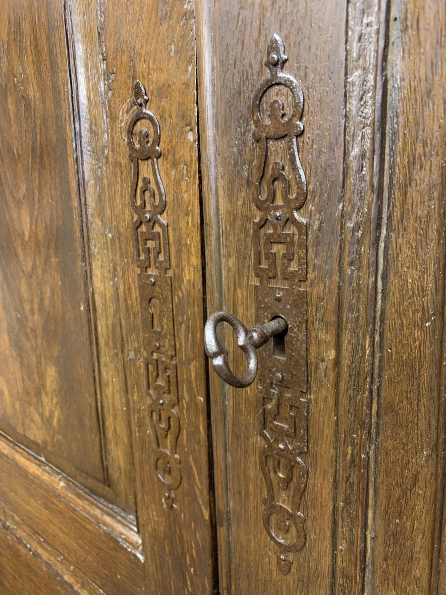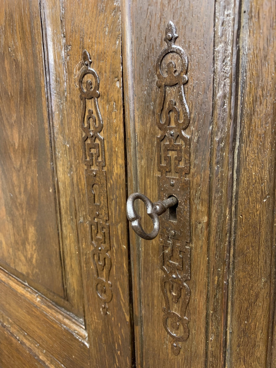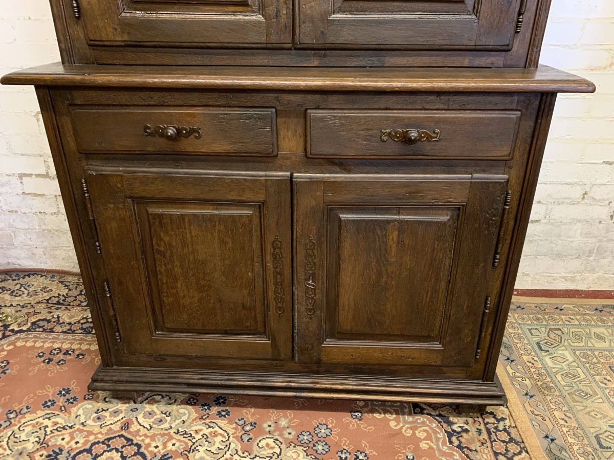 This French cupboard of full of rustic charm. The oversailing top sits above a pair of lockable shaped recessed panelled doors, each door having brass hinges and ornate brass escutcheon. The doors open to reveal a removable shelf. Below are a pair of drawers which sit above a pair of recessed panelled doors, the doors open to reveal a removable shelf. Boarded back and base and standing on four traditional block feet.