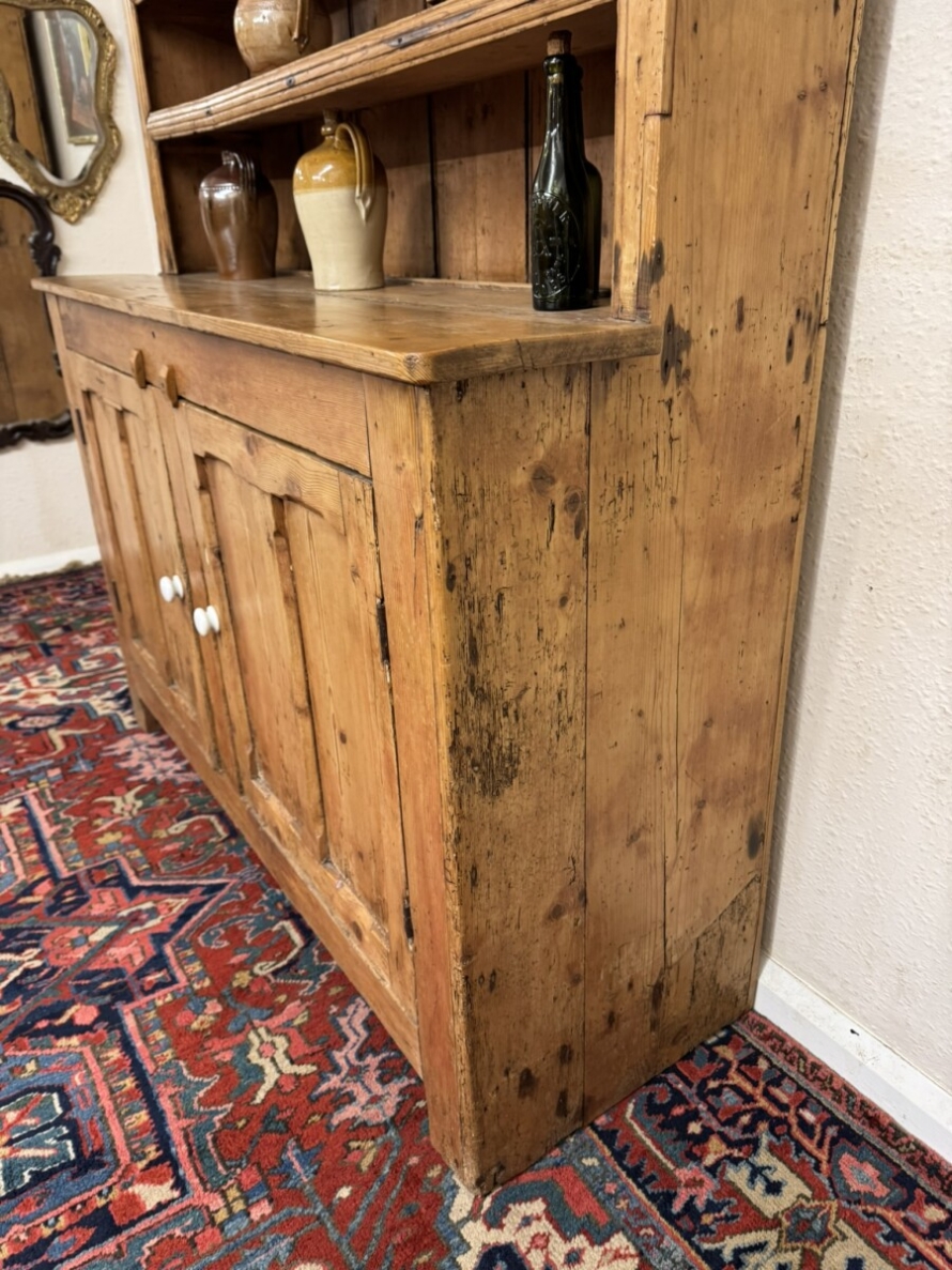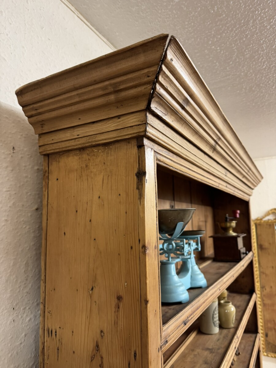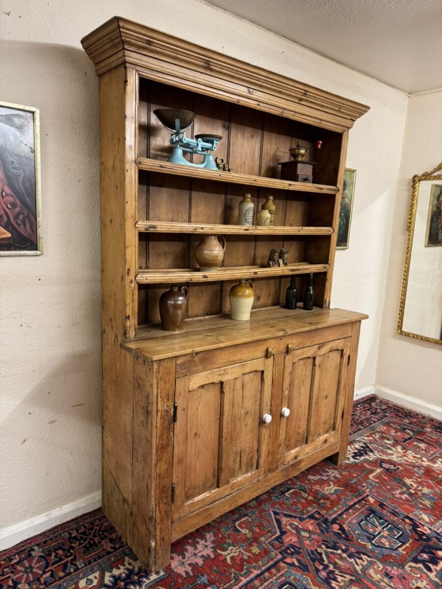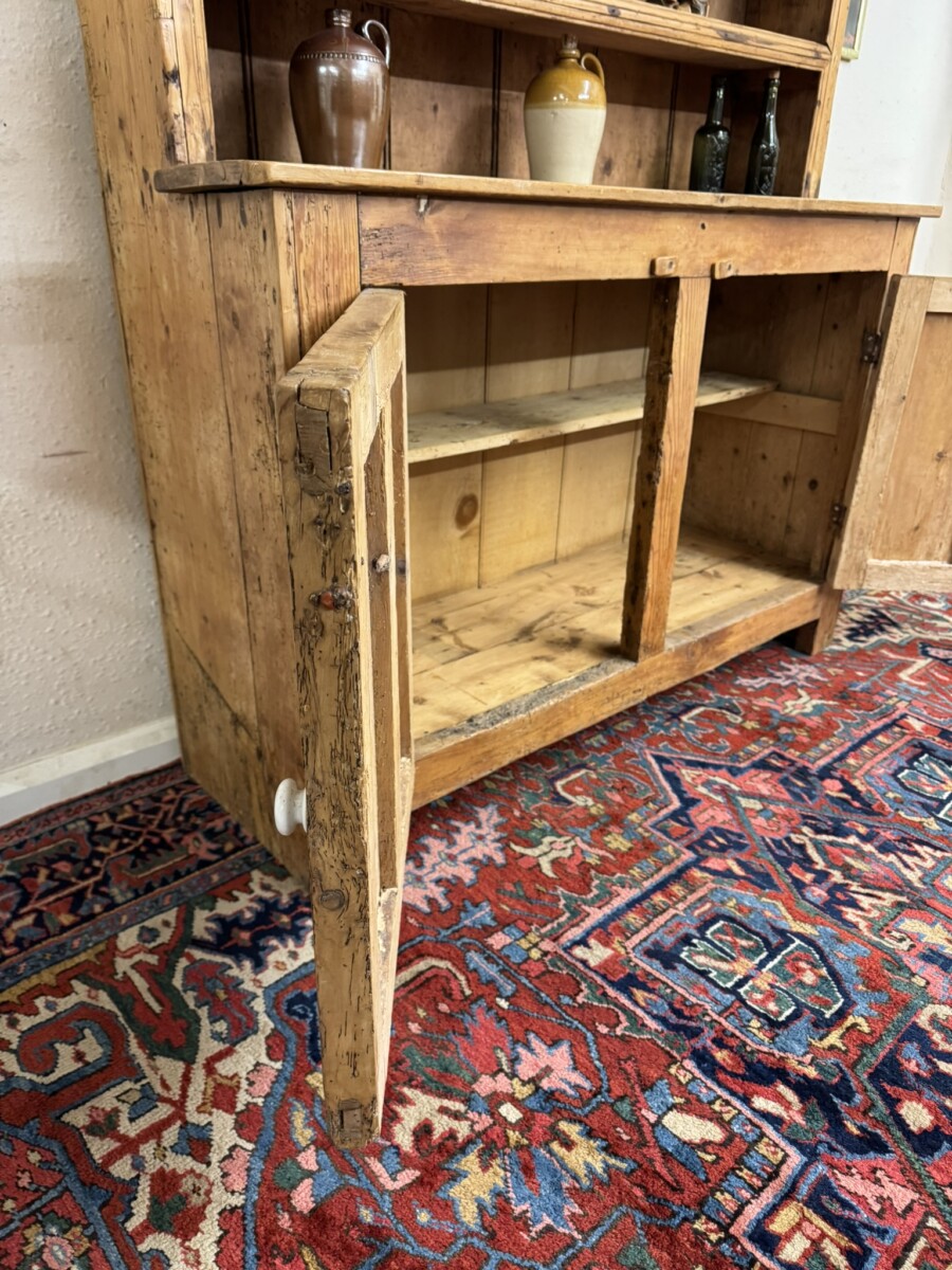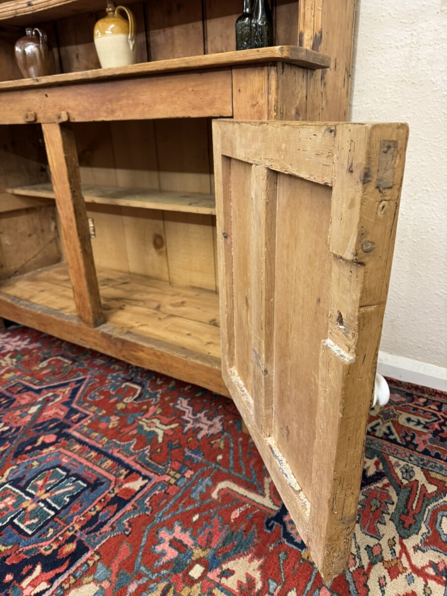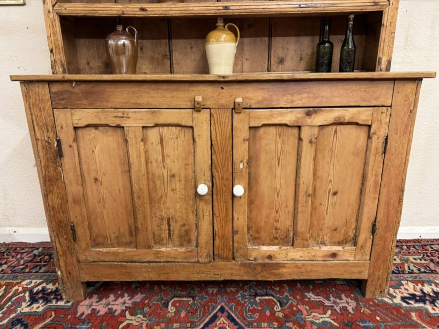This this great rustic Irish dresser is full of character and charm. This country pine dresser dates circa 1900. This one piece dresser has a stepped cornice which sits above three open shelves with a boarded back. Below are a pair of lockable recessed panelled doors, each door having an enamel handle and wood locking latch. The doors opens to reveal a fixed shelf. This super dresser sits on traditional block feet.